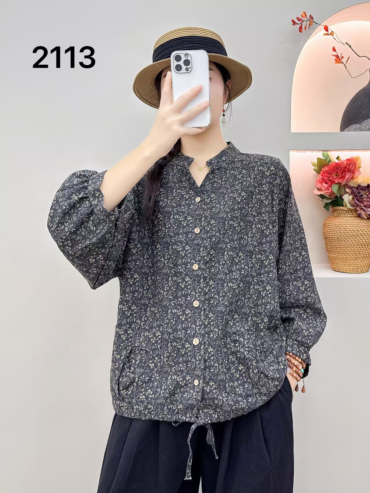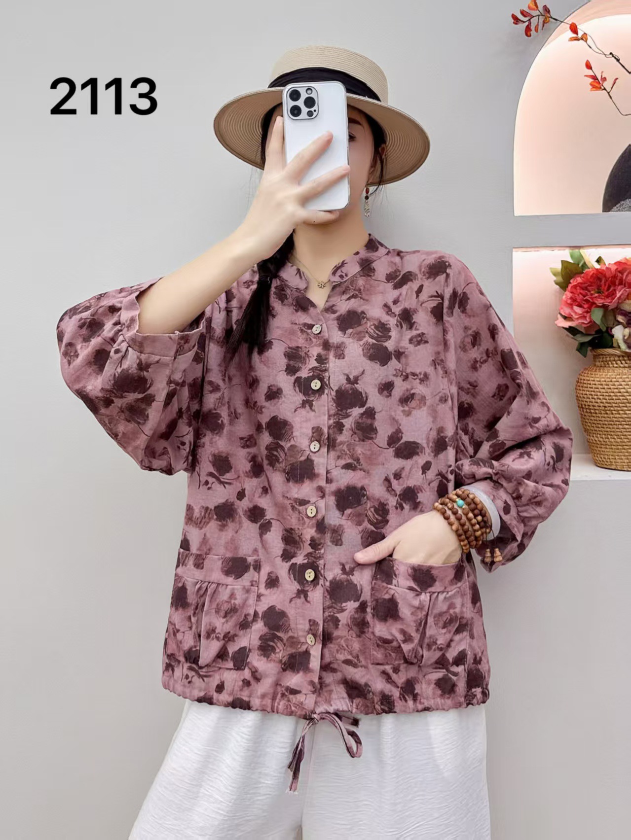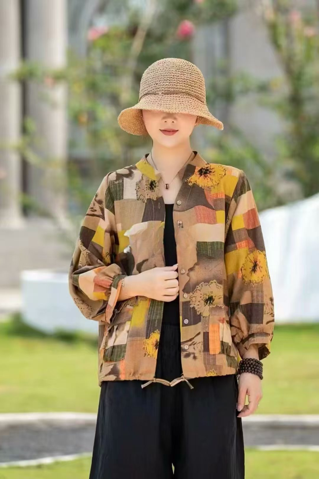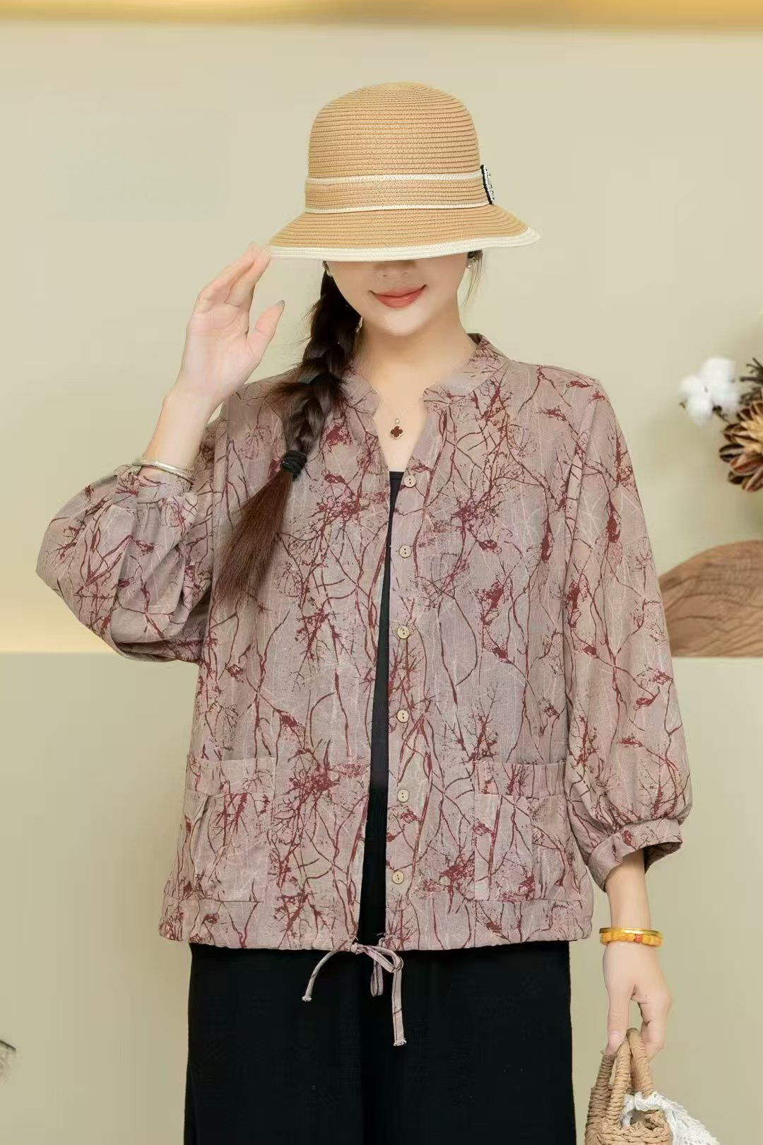 文艺复古开衫天丝麻印花衬衣2025夏季新款薄款亚麻衬衫宽松女上衣 RMB:24.00
