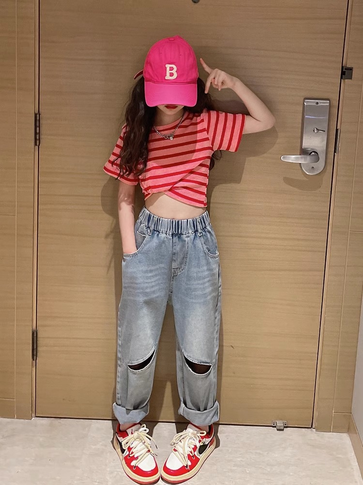 여아 스트레이트 레그 진 패셔너블한 찢어진 팬츠 2023 봄과 가을 새로운 어린이 루즈한 웨스턴 스타일 올매치 트렌디 팬츠스토어 가기