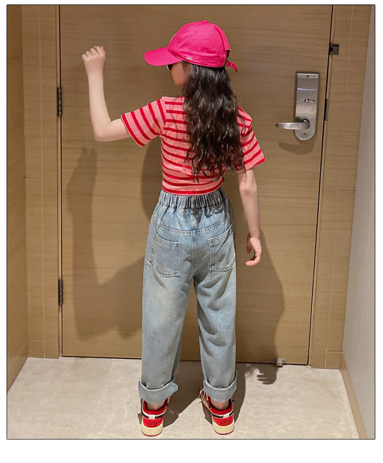 여아 스트레이트 레그 진 패셔너블한 찢어진 팬츠 2023 봄과 가을 새로운 어린이 루즈한 웨스턴 스타일 올매치 트렌디 팬츠