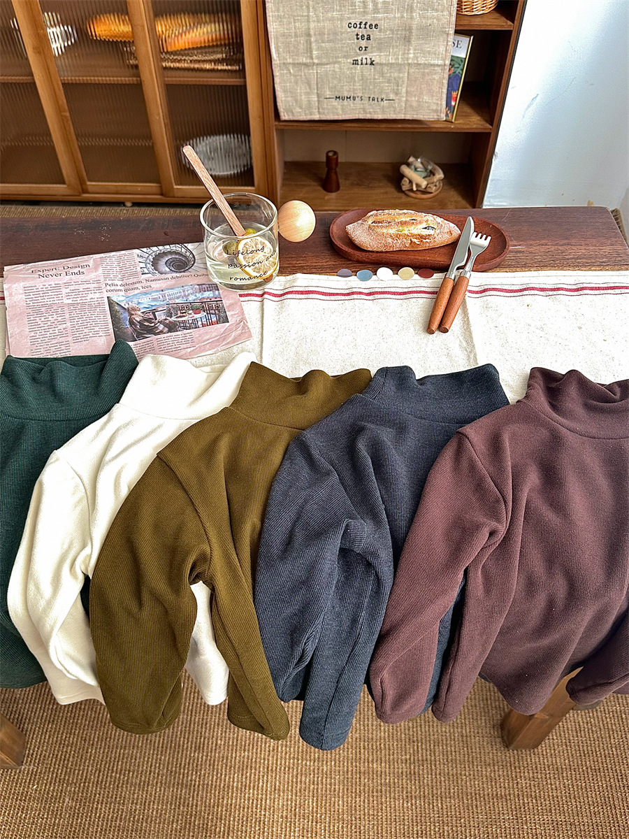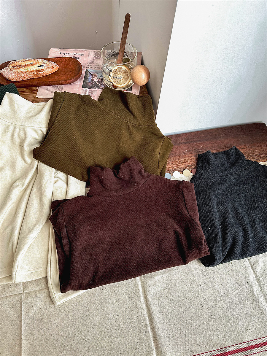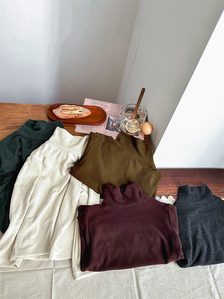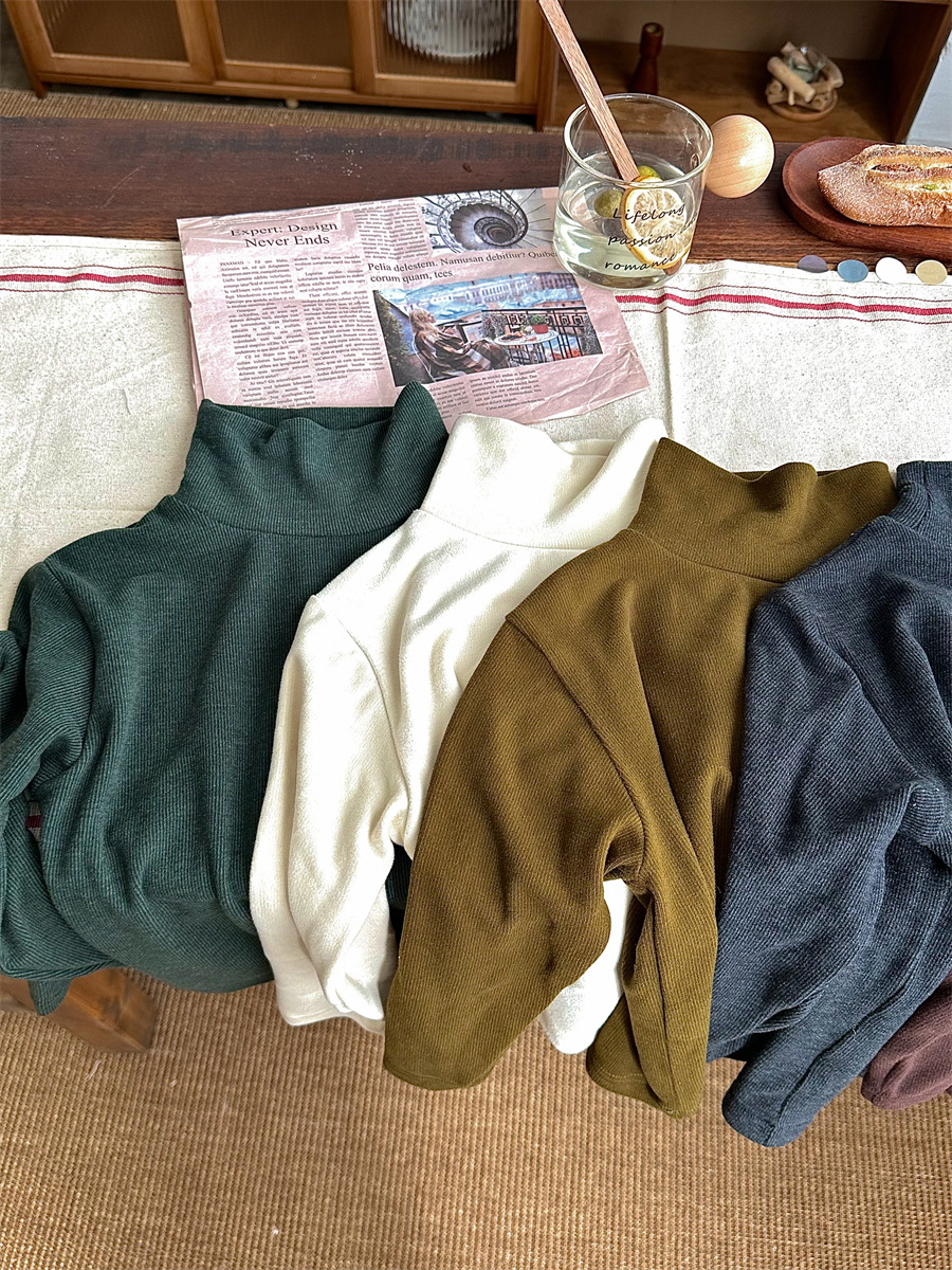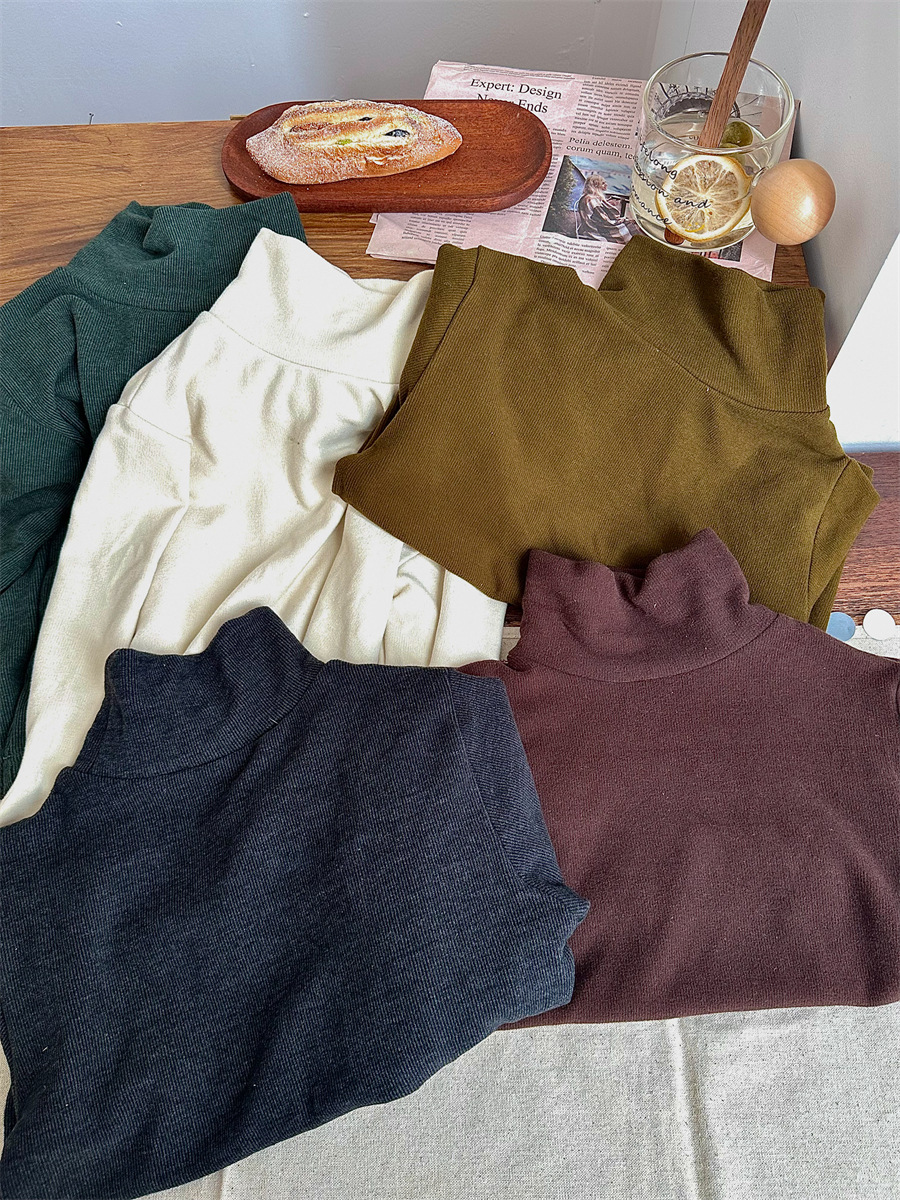 Jiaye 가을 겨울 신제품 2025 아동용 솔리드 컬러 코튼 터틀넥 바닥 셔츠 남성용 및 여성용 베이비 스타일 핏 스트립 내부 T스토어 가기