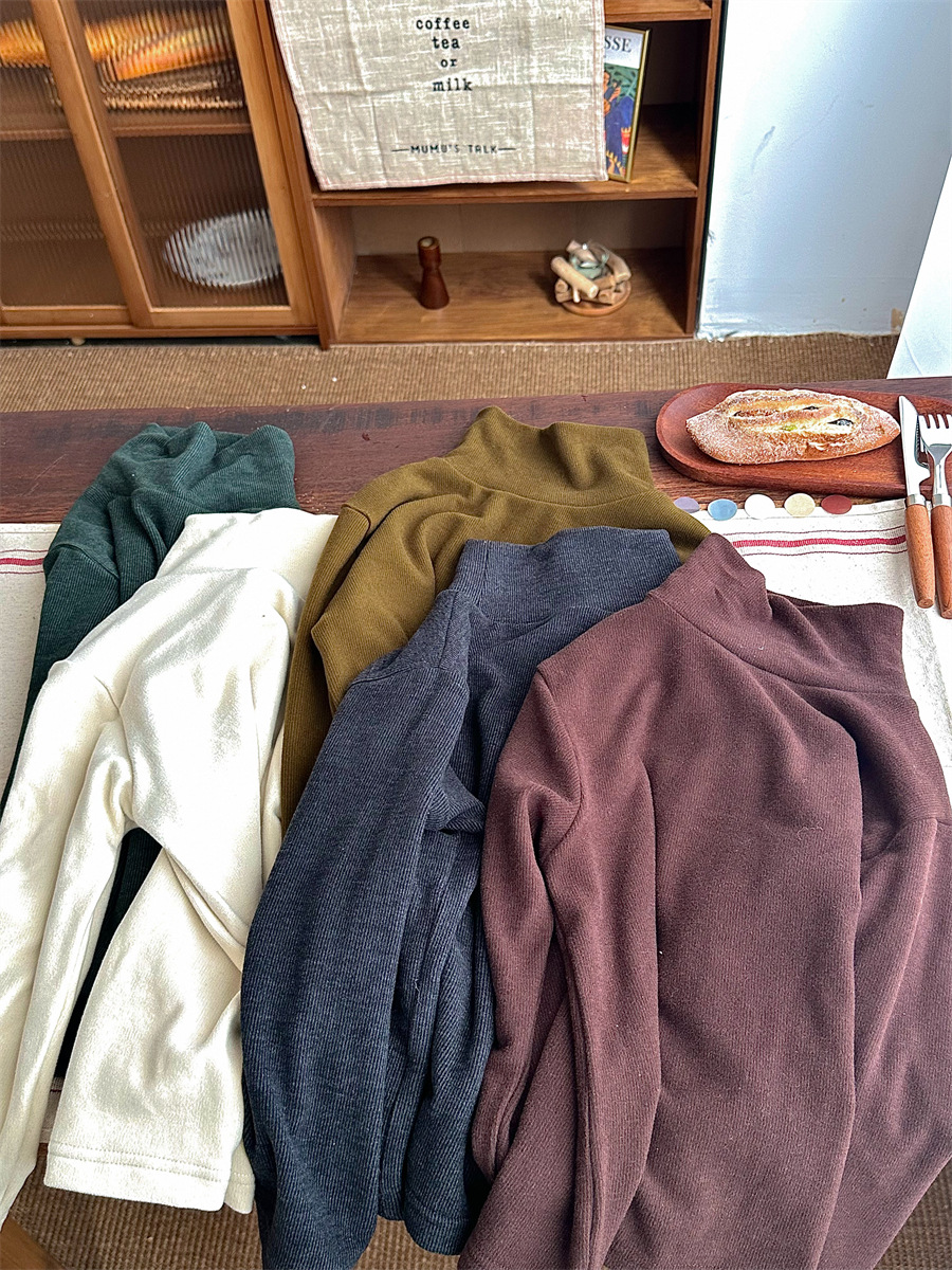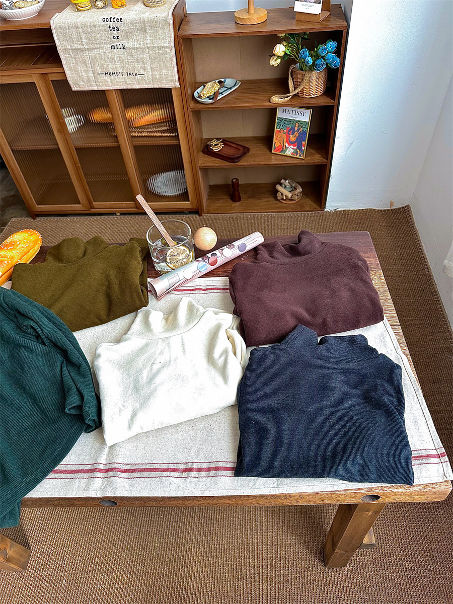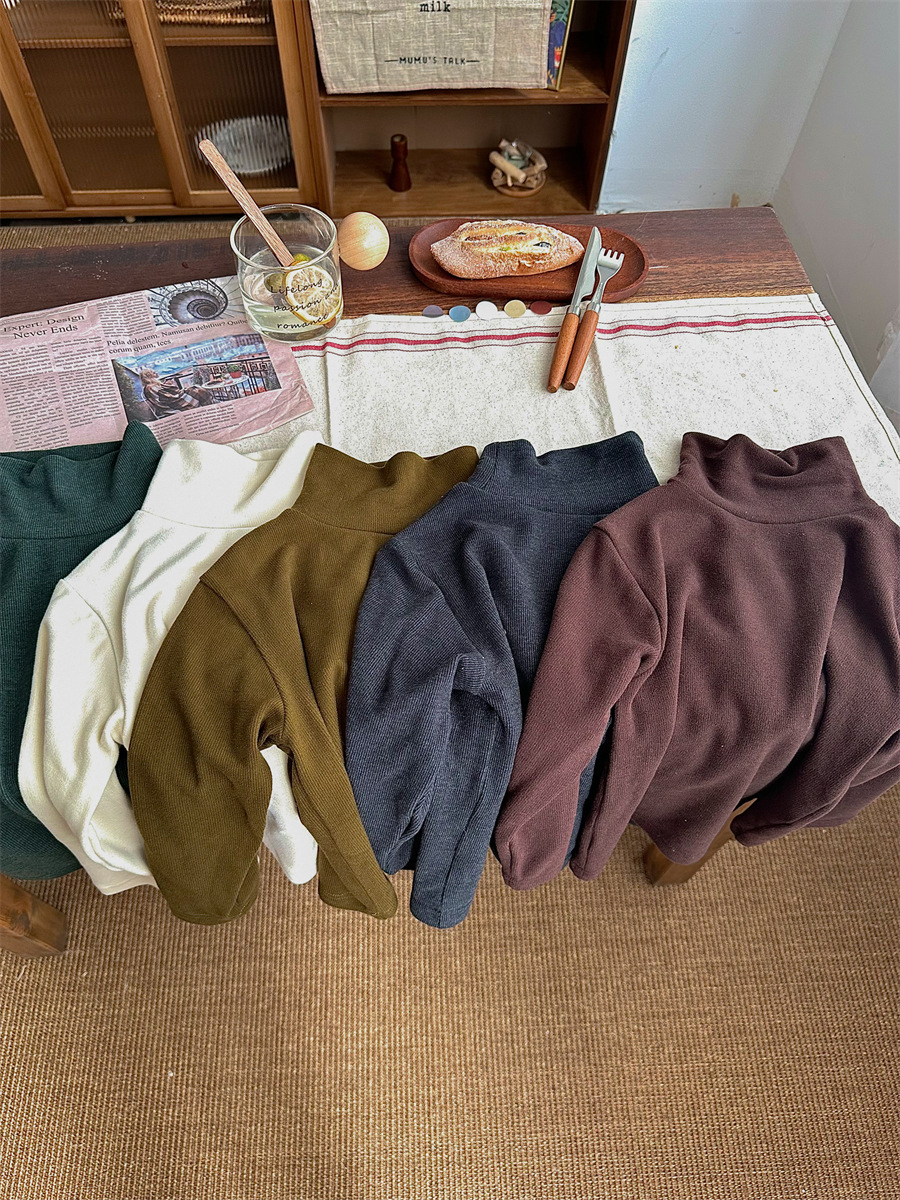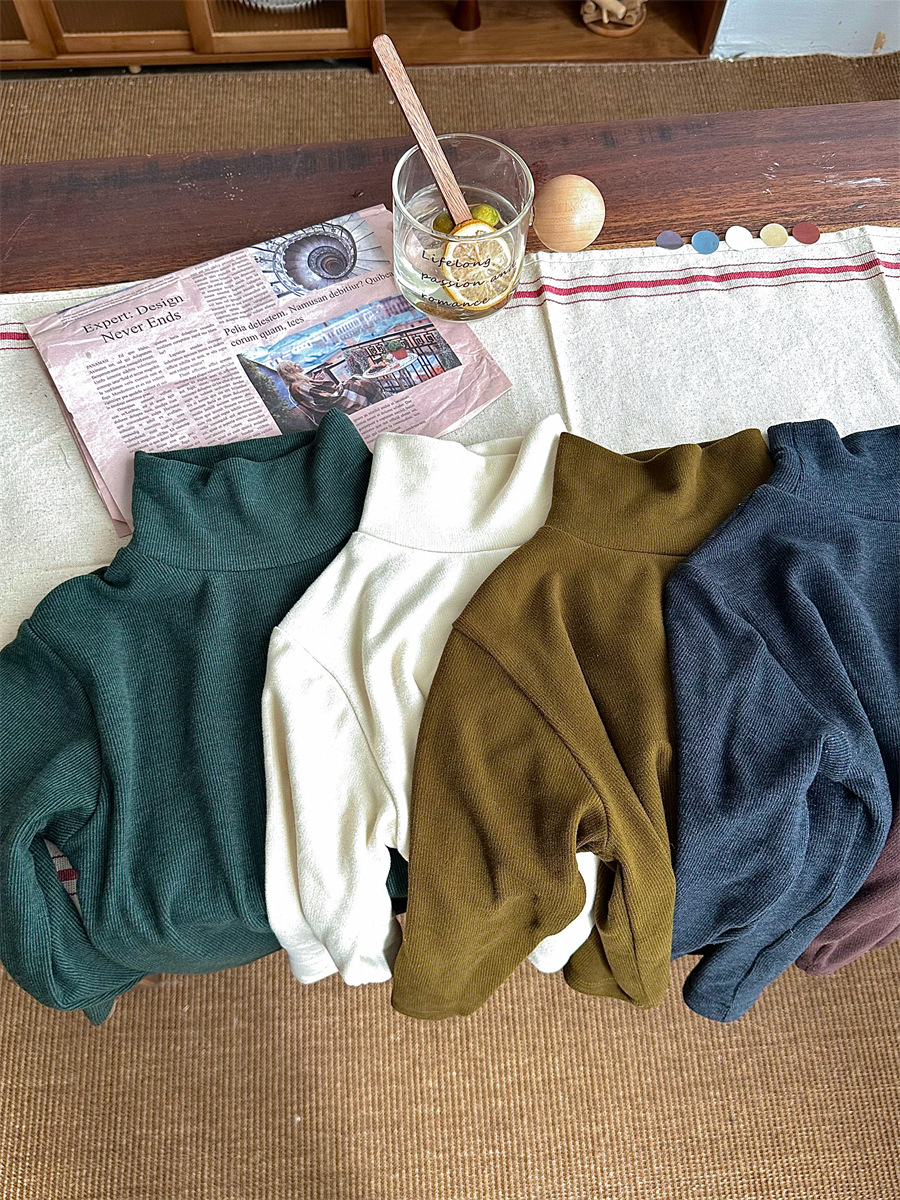 Jiaye 가을 겨울 신제품 2025 아동용 솔리드 컬러 코튼 터틀넥 바닥 셔츠 남성용 및 여성용 베이비 스타일 핏 스트립 내부 T스토어 가기
