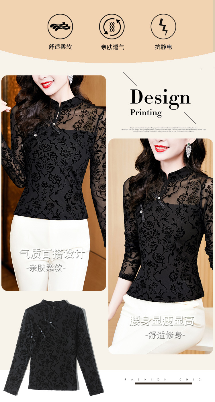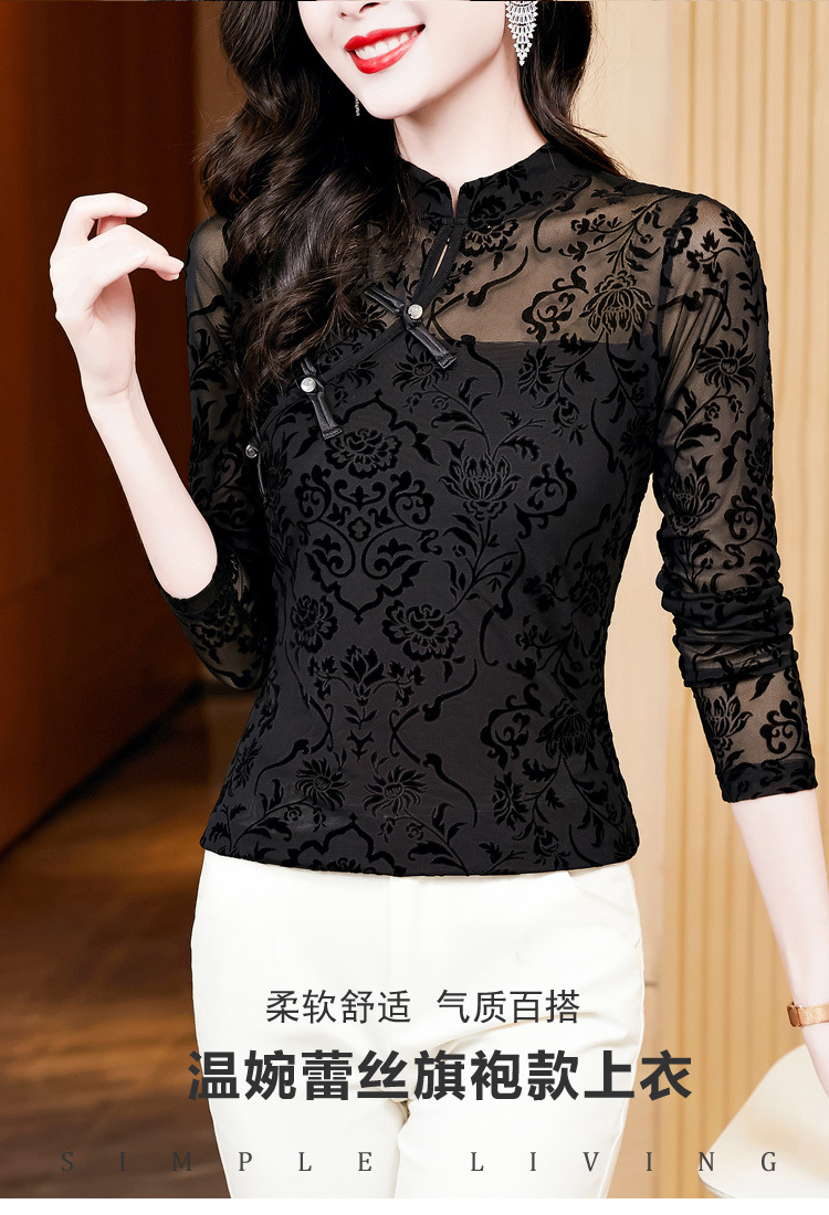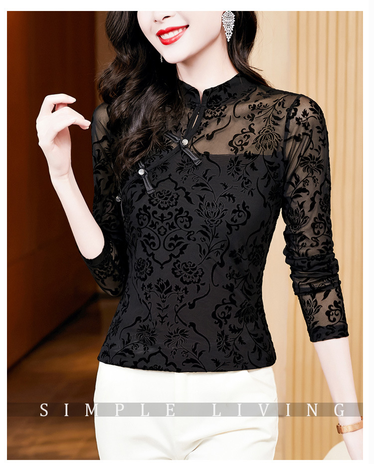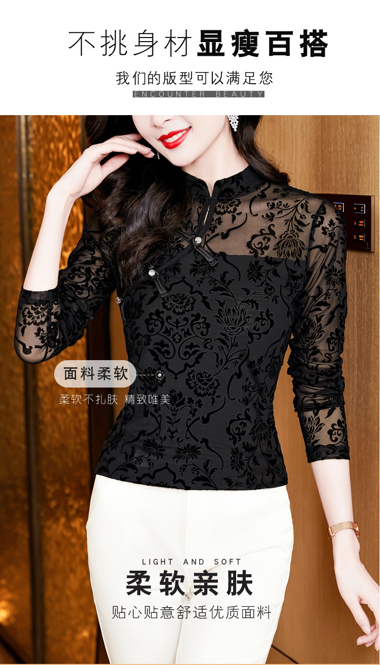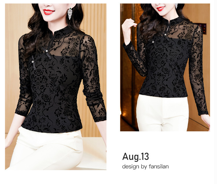 2023 가을 새로운 중국 조커 블랙 중공 무리 메쉬 버클 긴 소매 바닥 셔츠 여성 티셔츠 도매