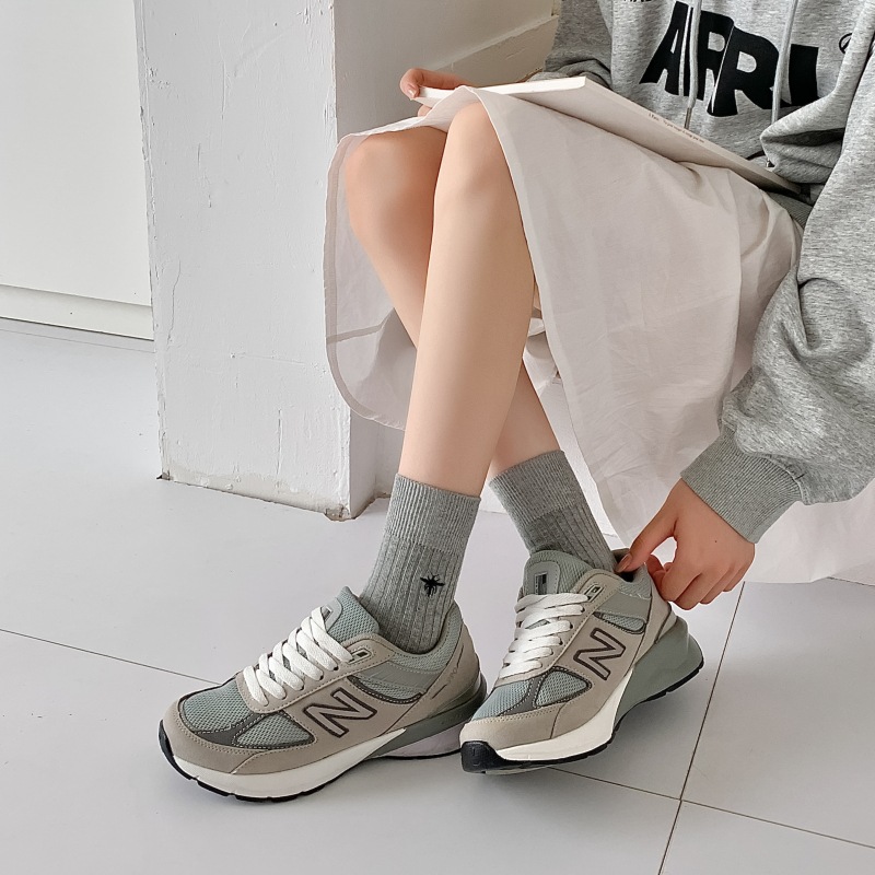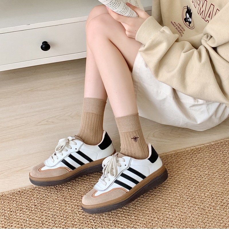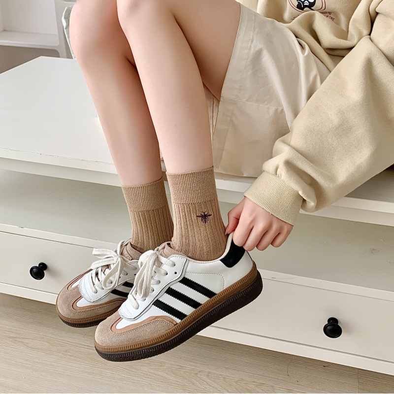 Miu 쇼 같은 스타일 꿀벌 자수 세로 줄무늬 더블 바늘 양말 남성과 여성 순면 중간 길이 양말 한국 여성 양말