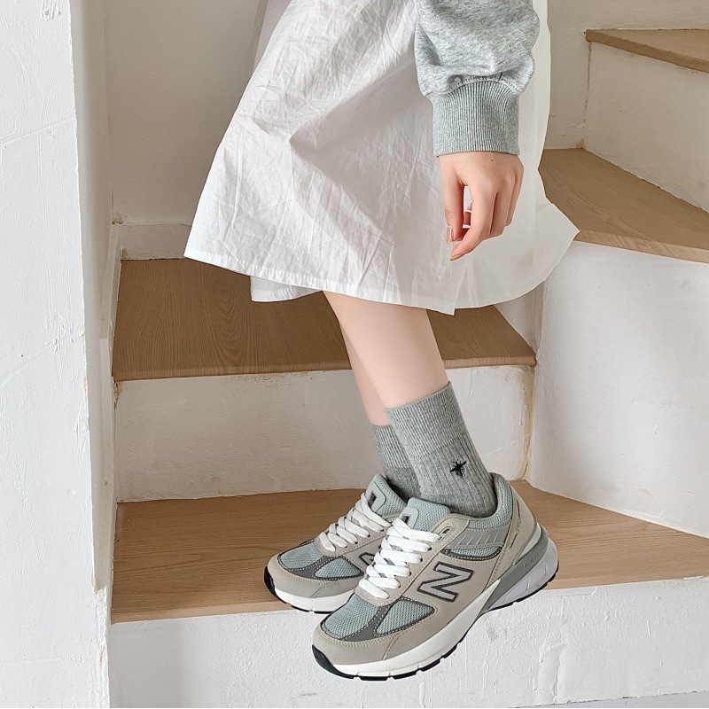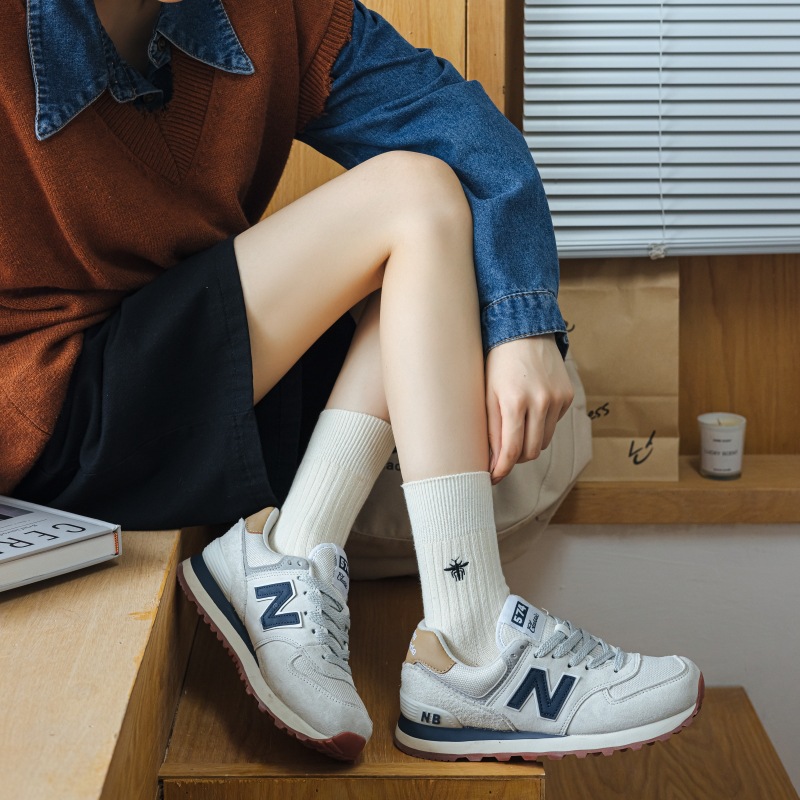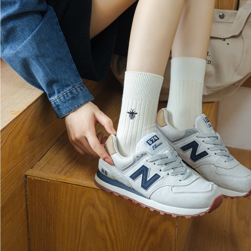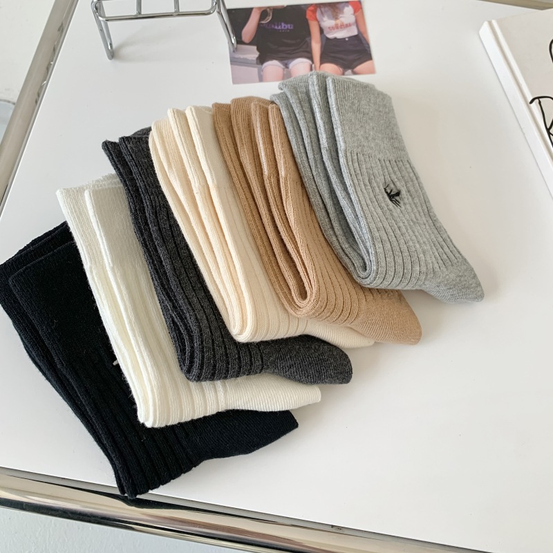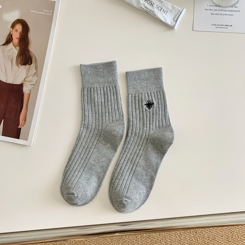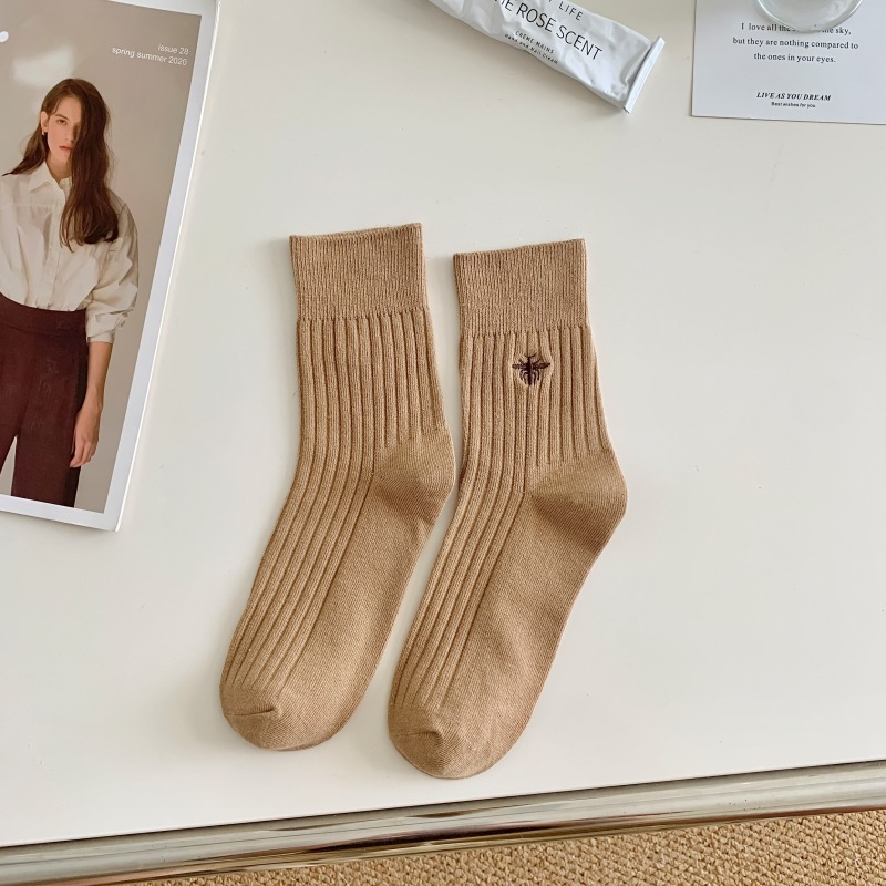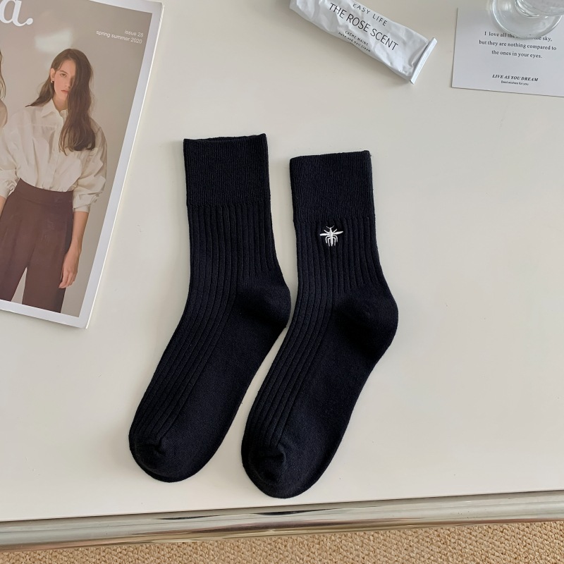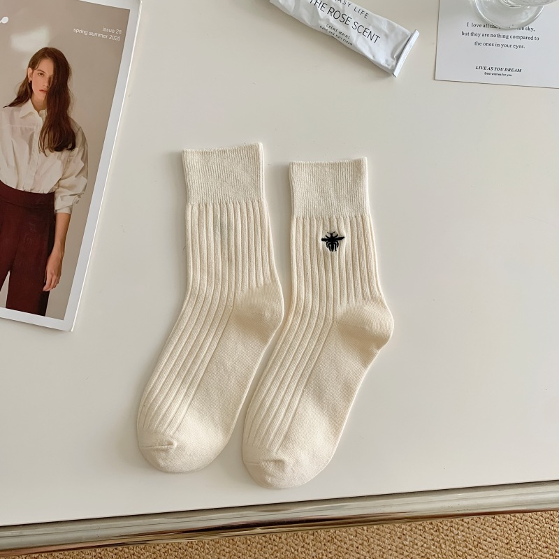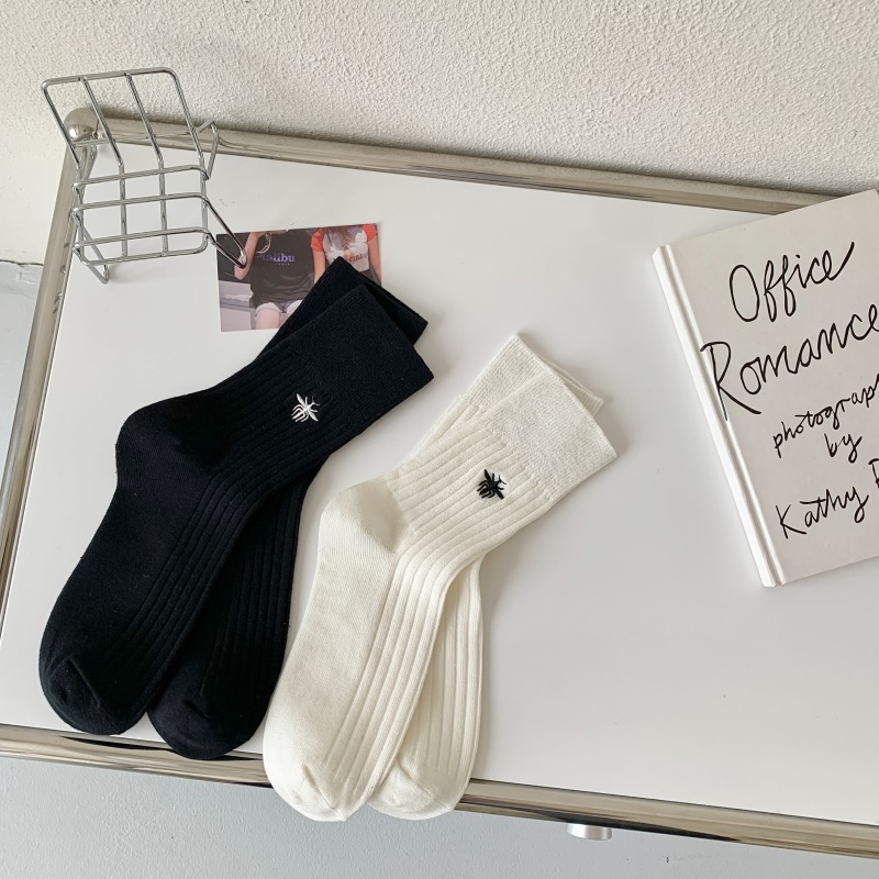 Miu 쇼 같은 스타일 꿀벌 자수 세로 줄무늬 더블 바늘 양말 남성과 여성 순면 중간 길이 양말 한국 여성 양말스토어 가기