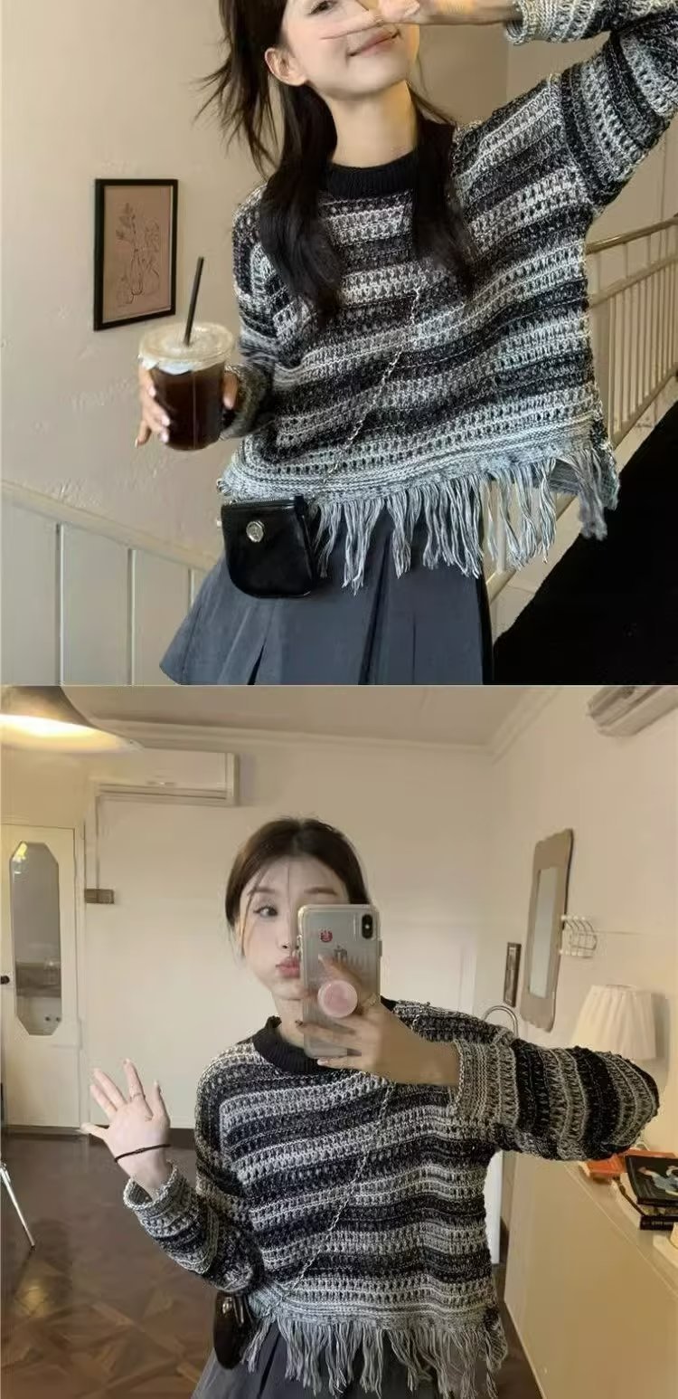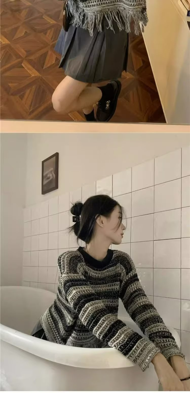 홍콩 스타일 빈티지 인 스트라이프 술 스웨터 여성의 디자인 감각 틈새 가을 느슨한 게으른 스타일 짧은 니트 스웨터