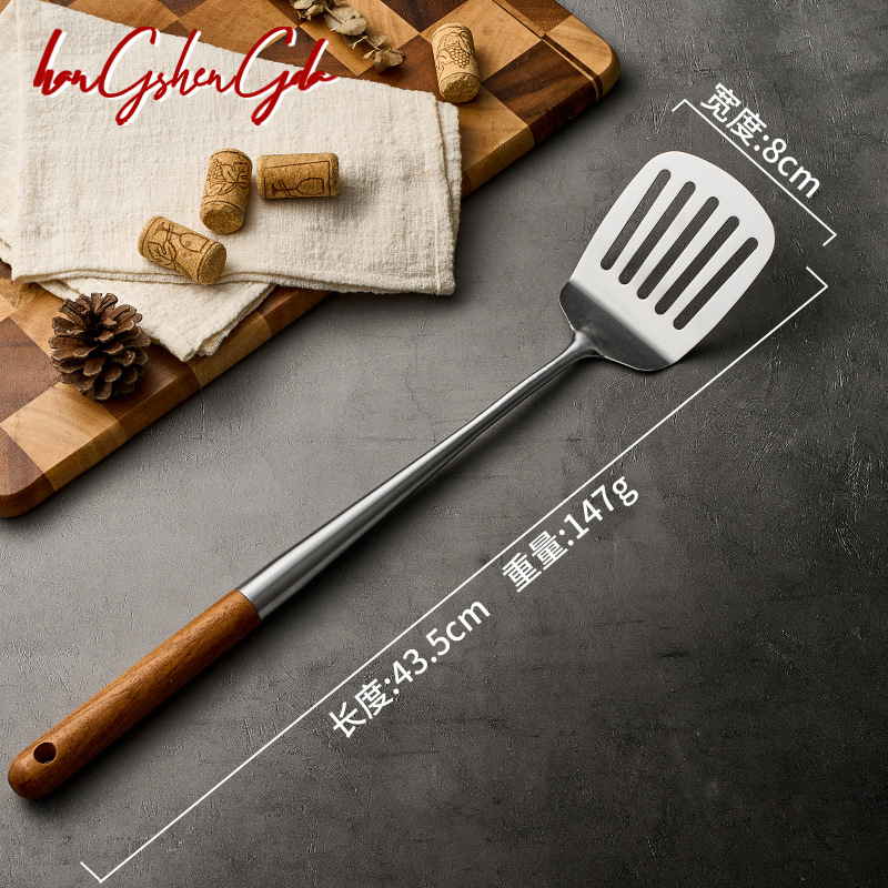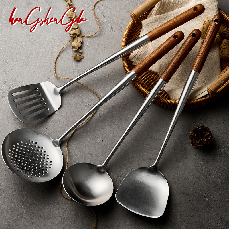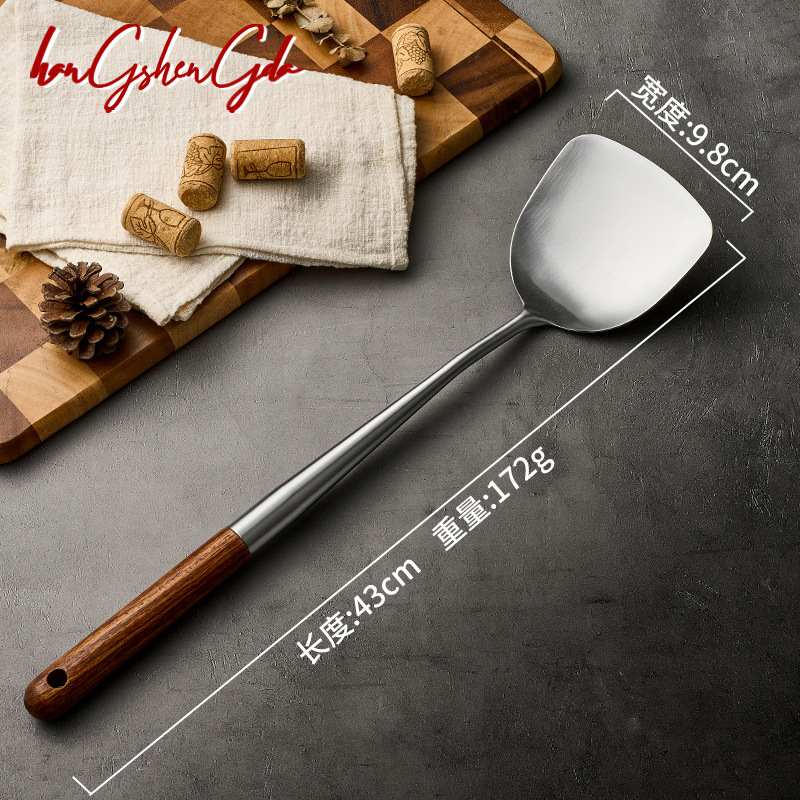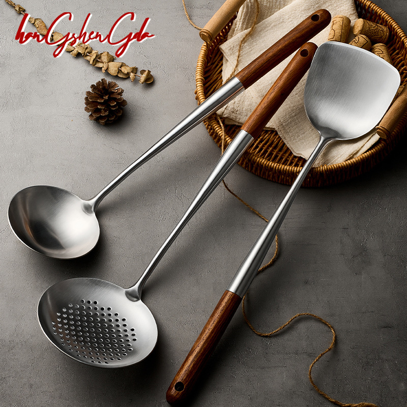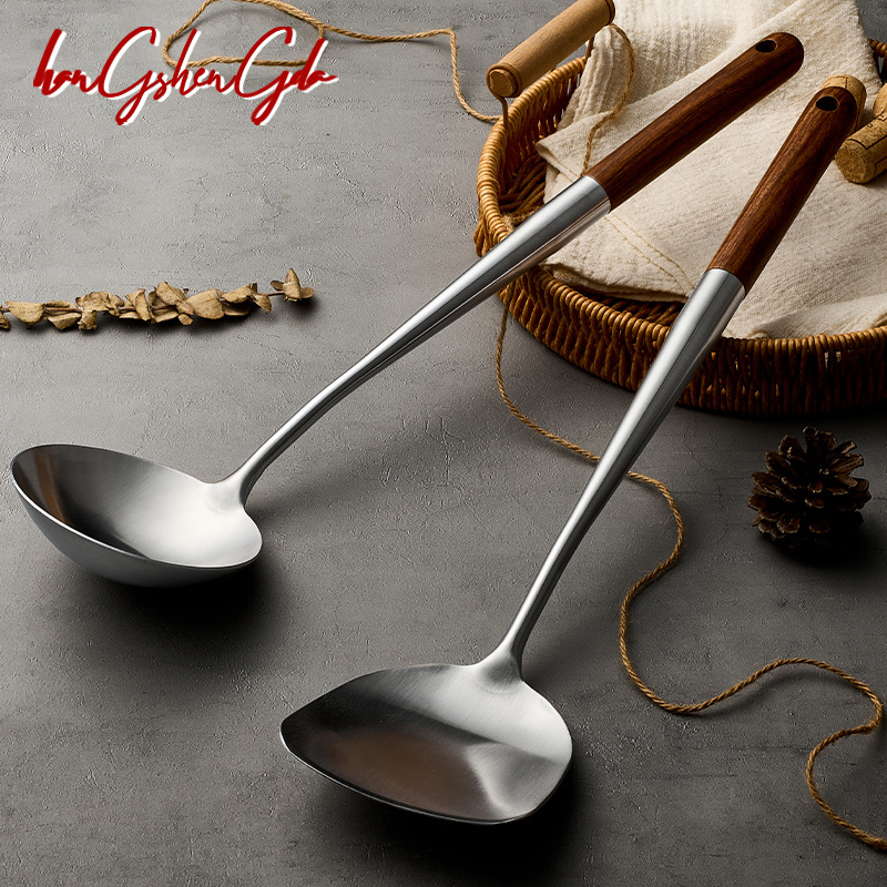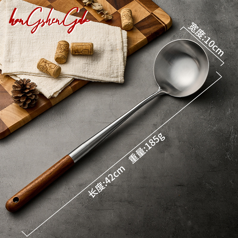 304 스테인레스 스틸 프라이팬 주걱 가정용 요리 주걱 수프 스푼 확장 나무 손잡이 주방기구 세트 요리사 주걱
