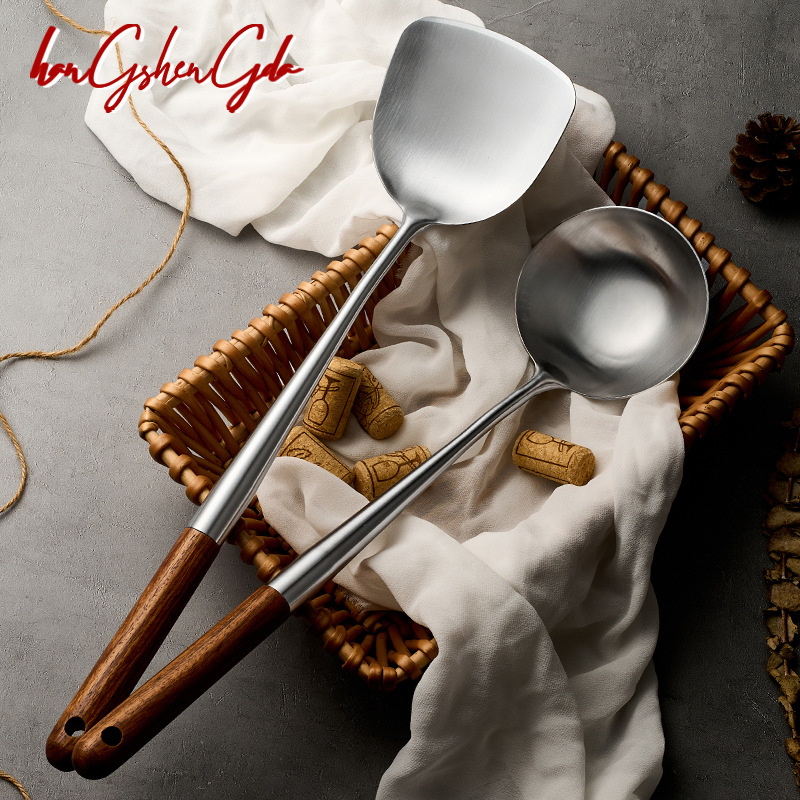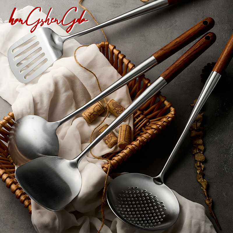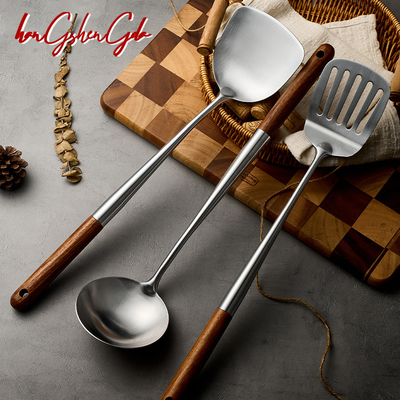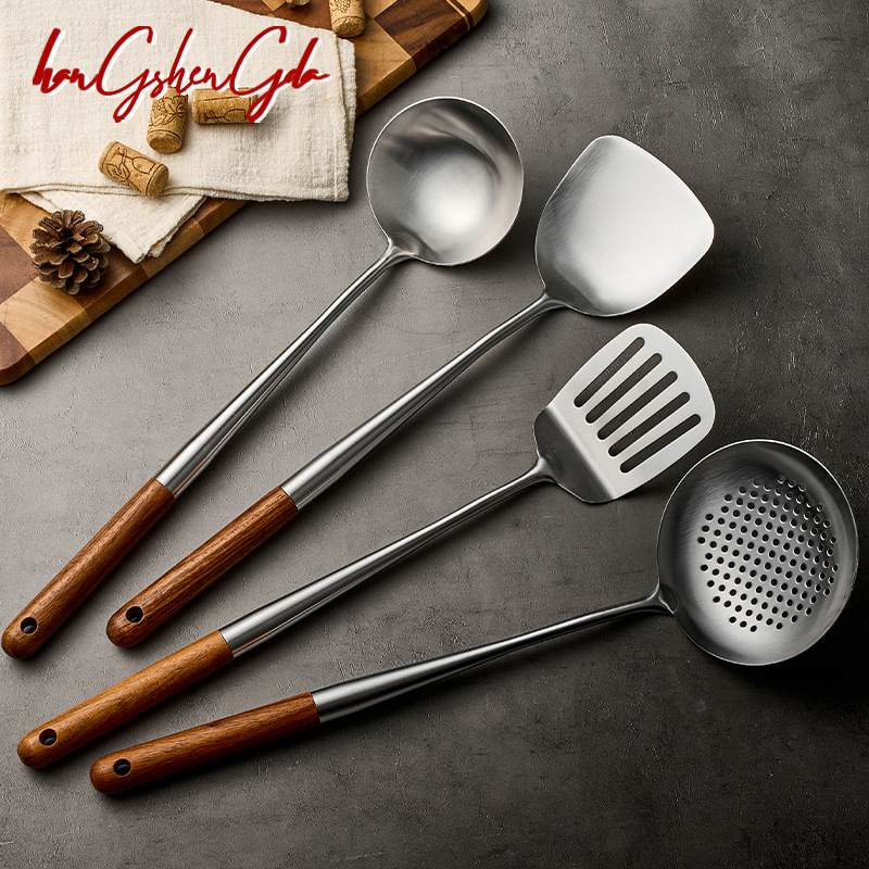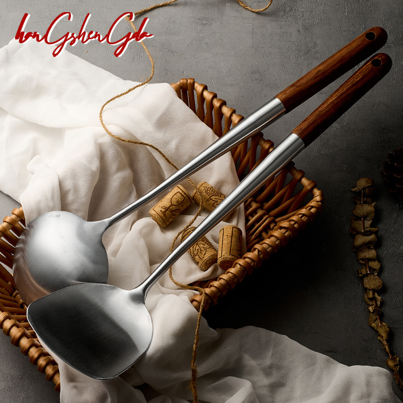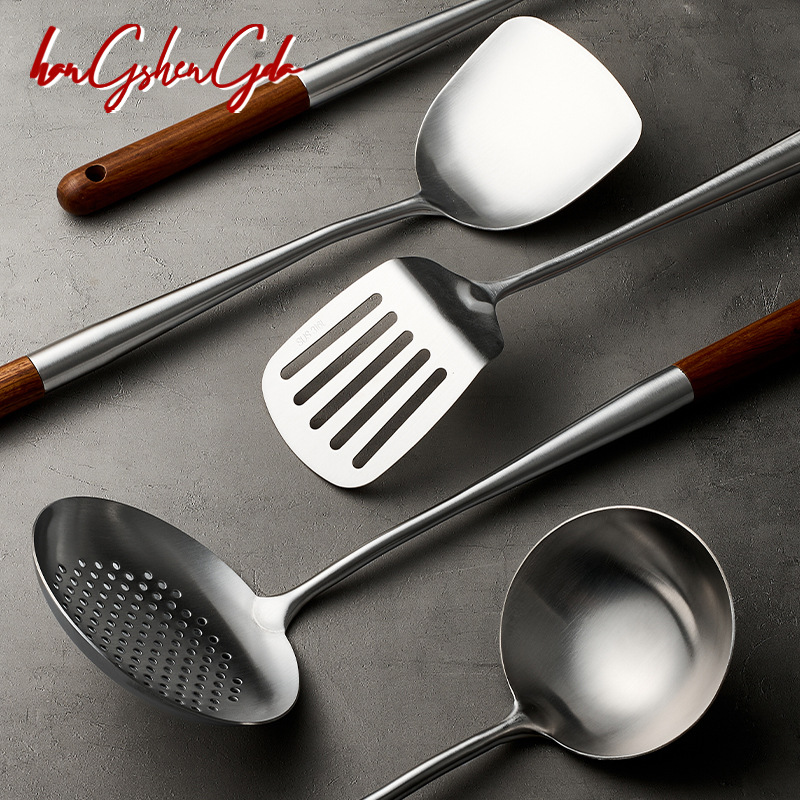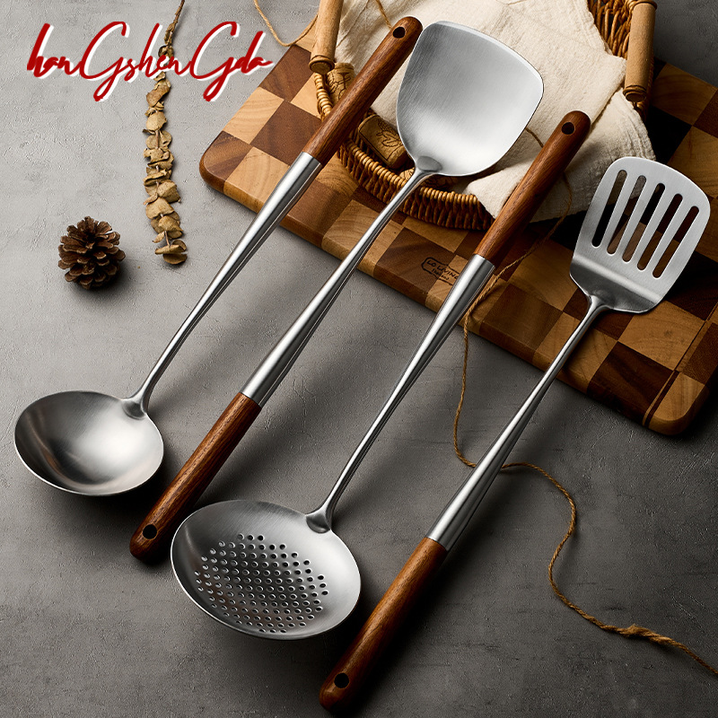 304 스테인레스 스틸 프라이팬 주걱 가정용 요리 주걱 수프 스푼 확장 나무 손잡이 주방기구 세트 요리사 주걱
