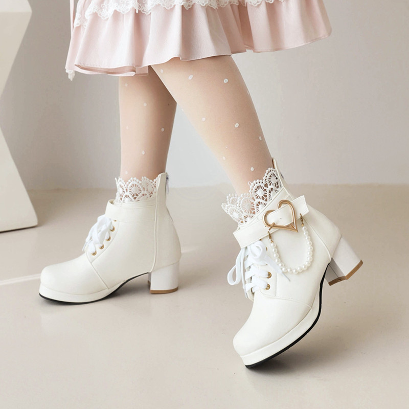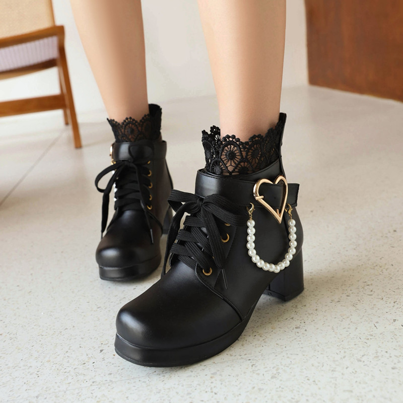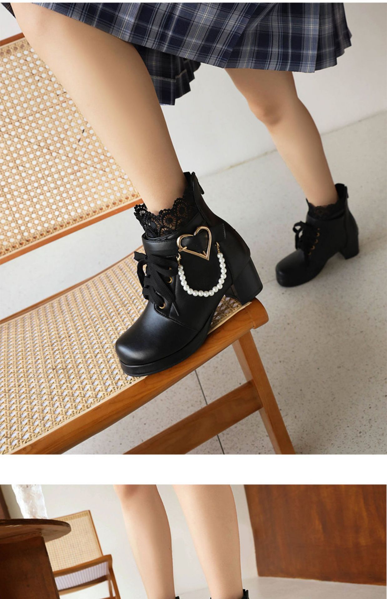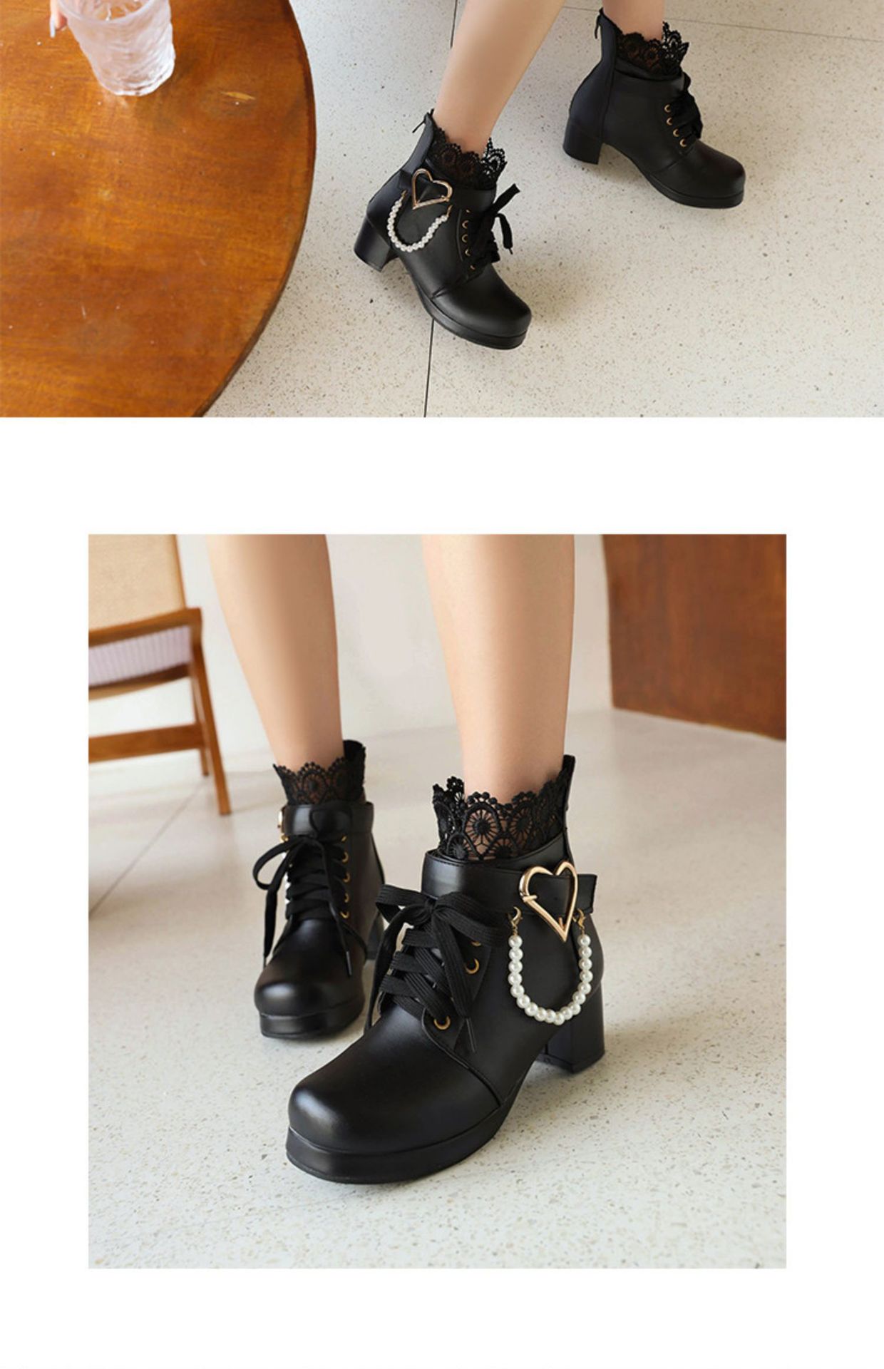 달콤한 레이스 ~ 패션 청키 힐 짧은 부츠 플랫폼 미디엄 힐 플러스 사이즈 여성 신발 로리타 레이스 업 페르시 마틴 부츠