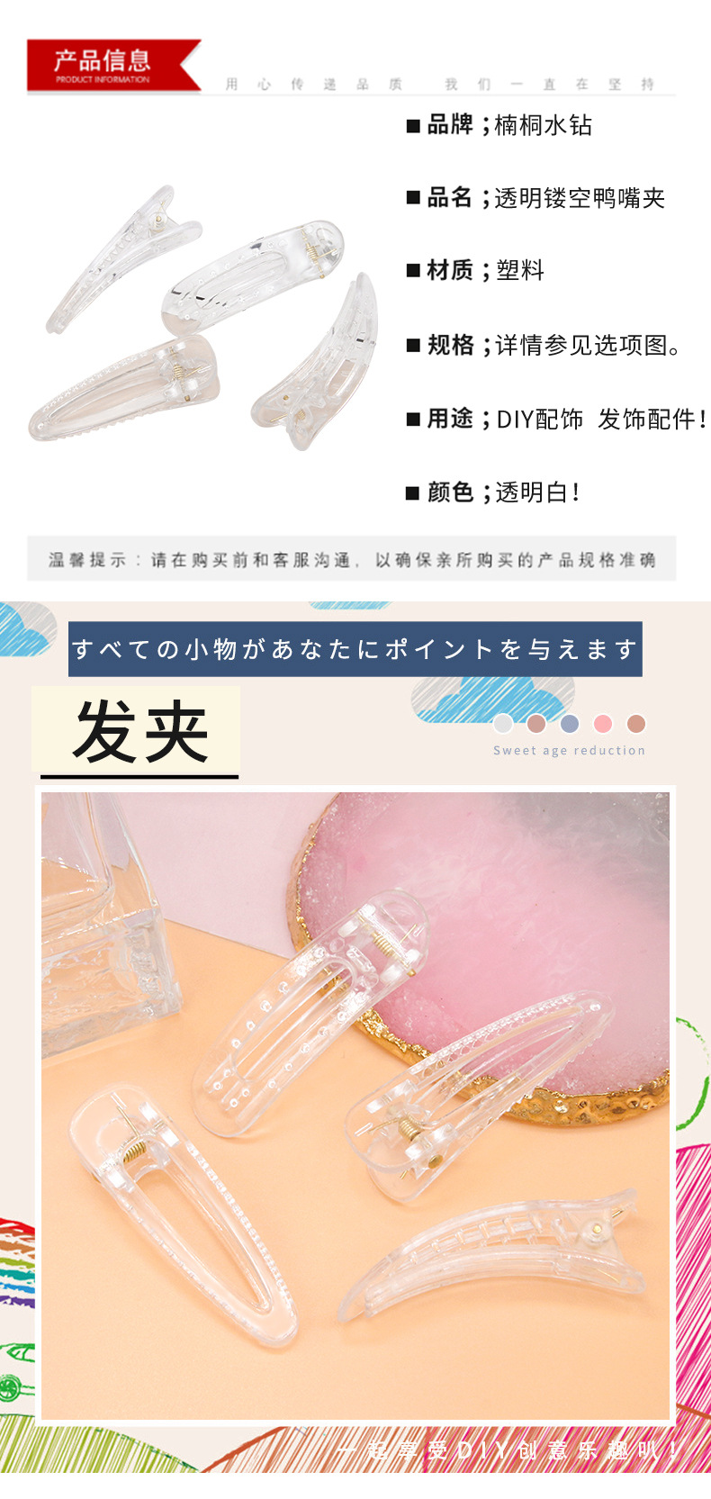 투명 플라스틱 중공 오리 빌 클립 뒤로 머리 측면 골절 머리 앞머리 사이드 클립 머리 장식 소녀 탑 클립스토어 가기