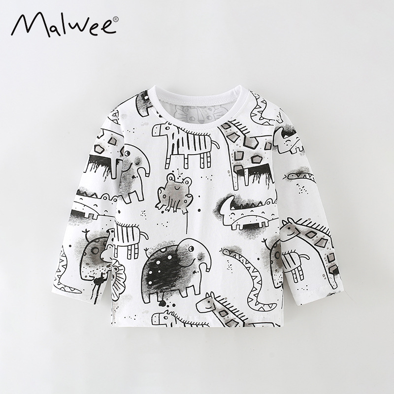 재고 malwee 아동복 티셔츠 가을 새로운 인쇄 라운드 넥 셔츠 캐주얼 긴 소매 기본 셔츠 어린이 탑