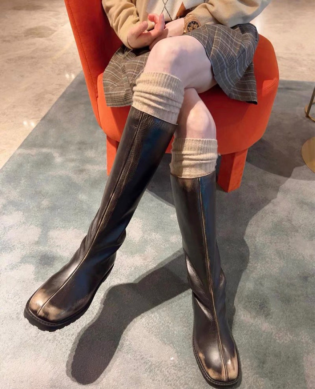 초가을 한국 이스트 게이트 니하이 울 양말 헬더 여주인 피트 스트라이프 캐시미어 솔리드 컬러 스택 튜브 양말스토어 가기