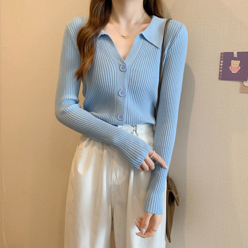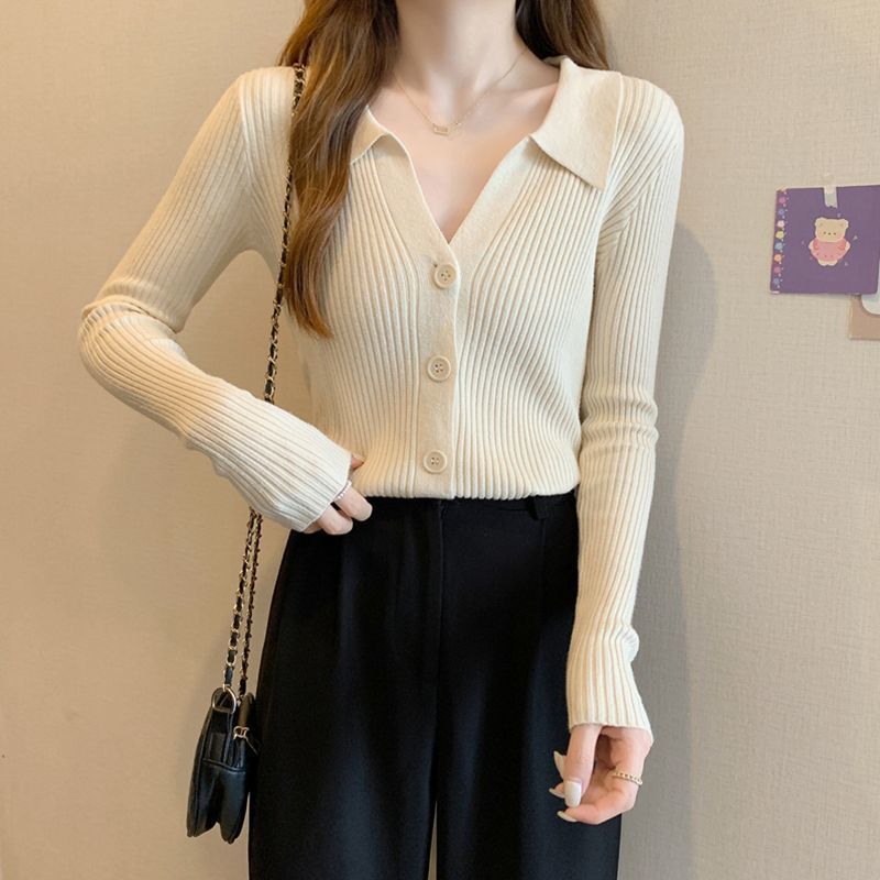 가을을위한 핑크 폴로 칼라 스웨터 여성의 새로운 순수 컬러 틱 탑스토어 가기