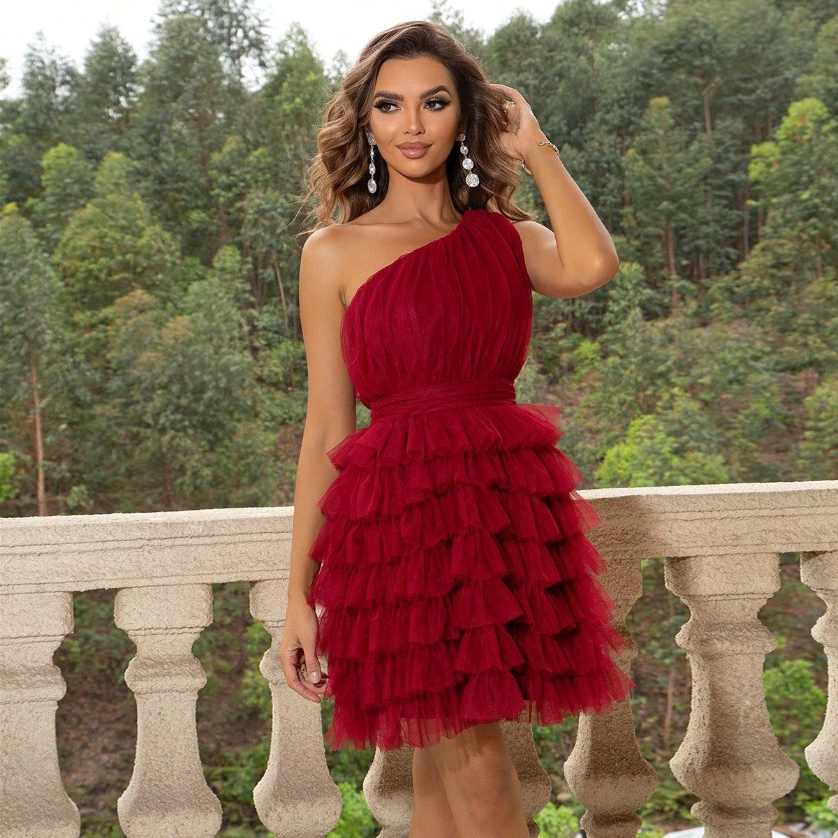 유럽과 미국 크로스 국경 섹시 오프 숄더 주름 바스트 레벨 밑단 메쉬 천 원피스