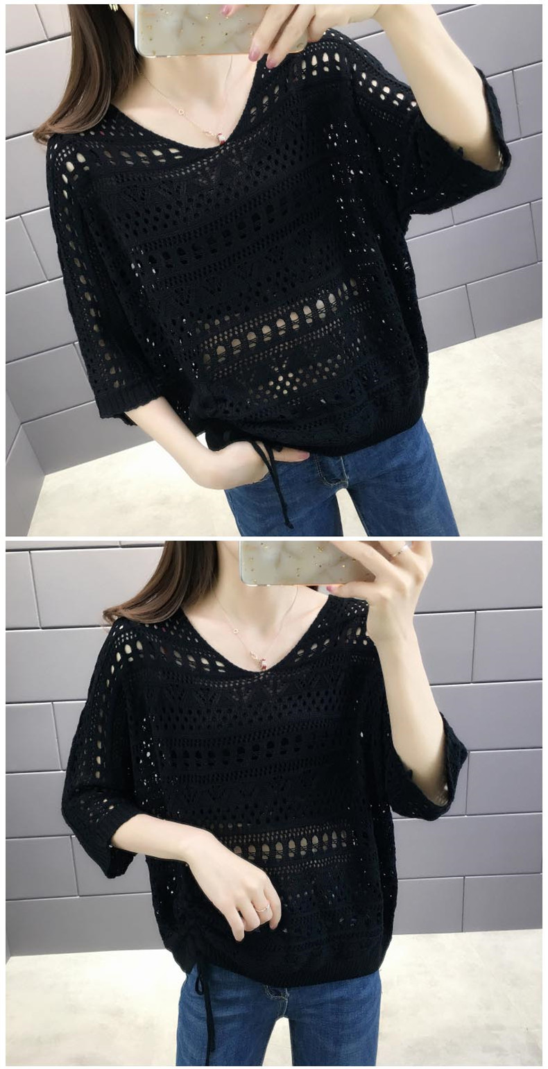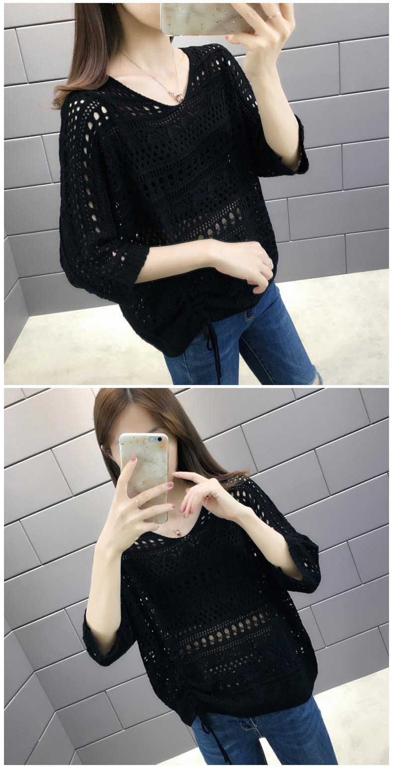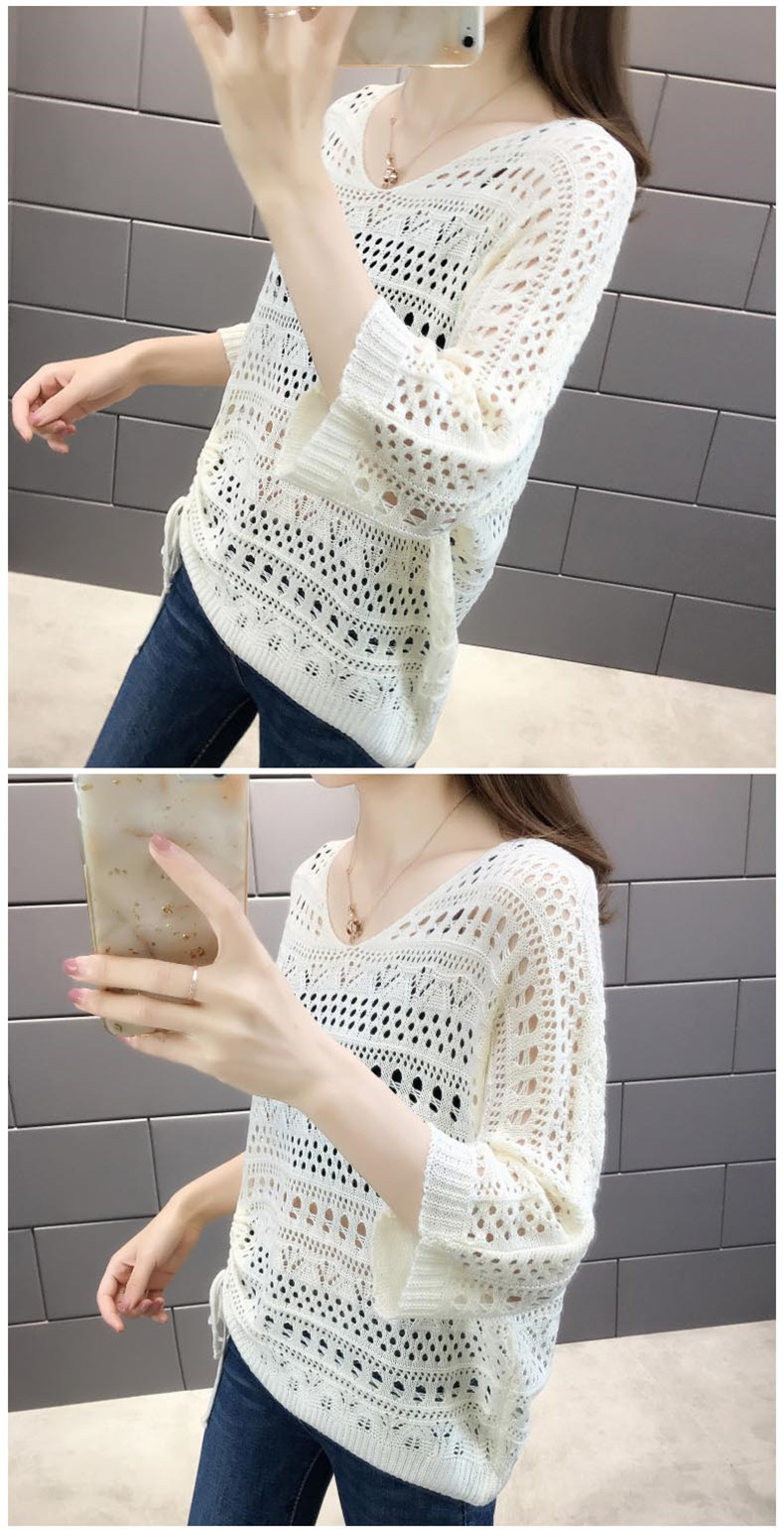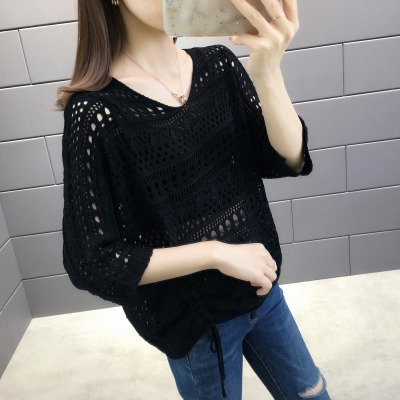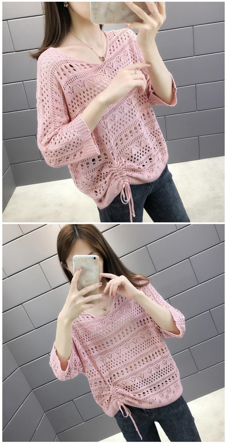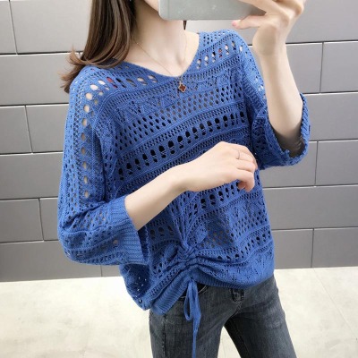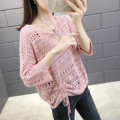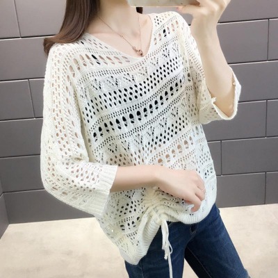 중공 V 넥 니트 블라우스 게으른 스타일 여름 2020 새로운 레이스 업 느슨한 드로우 스트링 탑 얇은 그물 셔츠 여성용