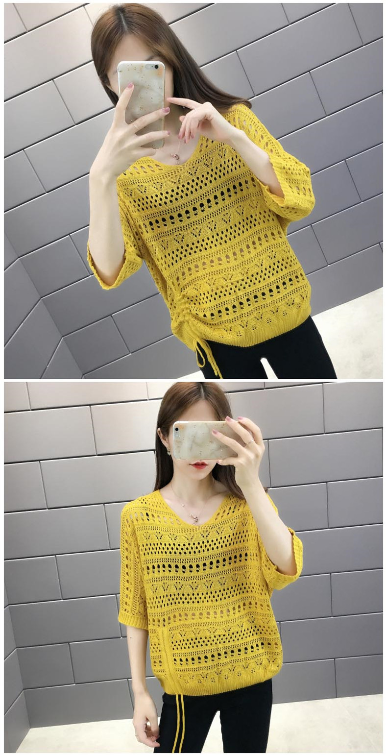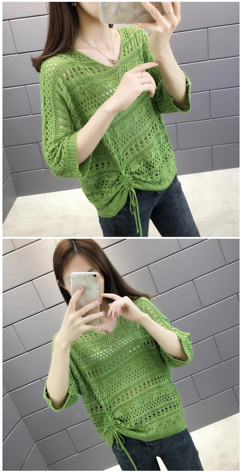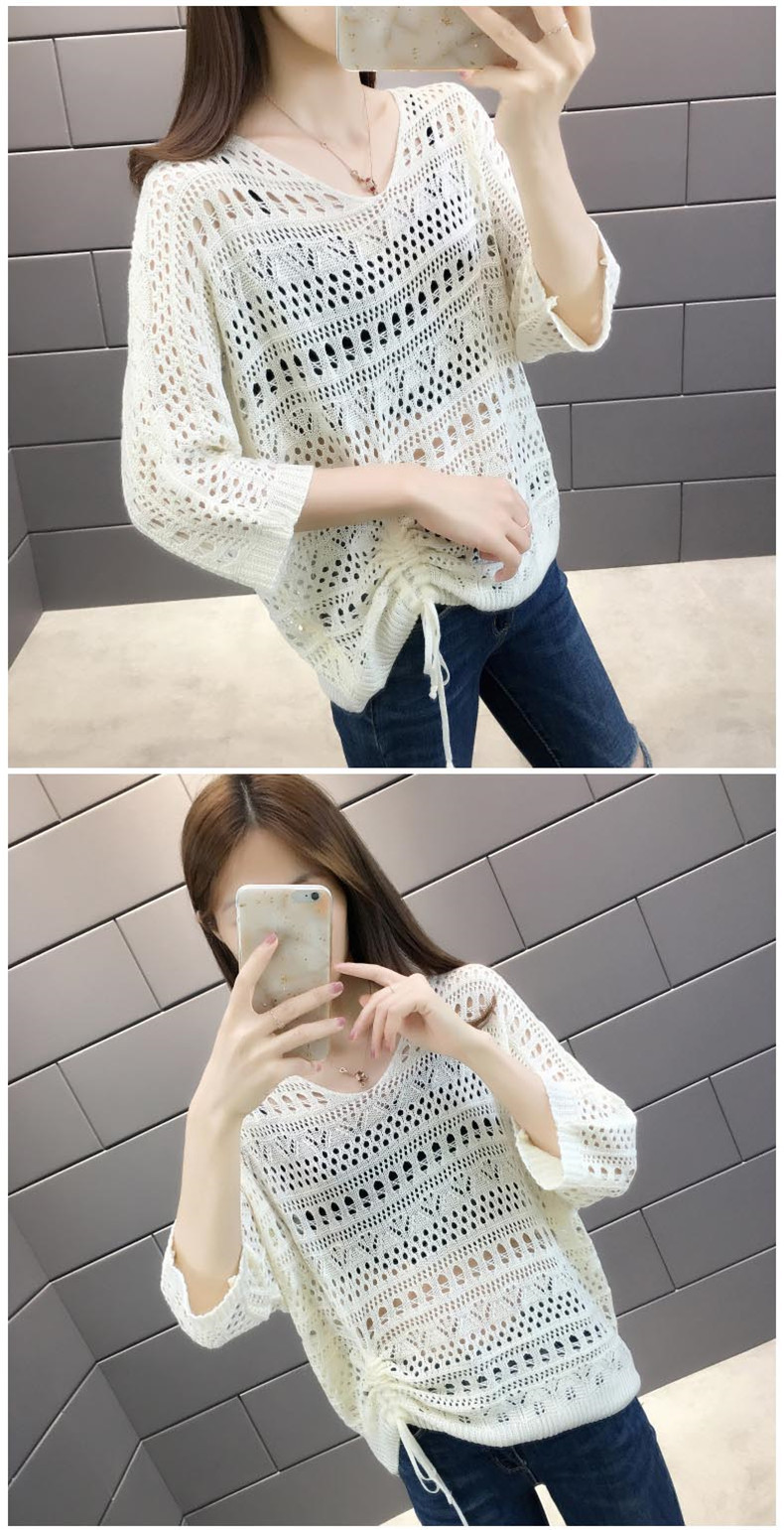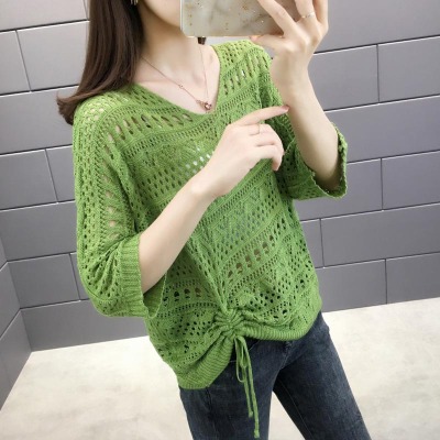 중공 V 넥 니트 블라우스 게으른 스타일 여름 2020 새로운 레이스 업 느슨한 드로우 스트링 탑 얇은 그물 셔츠 여성용스토어 가기