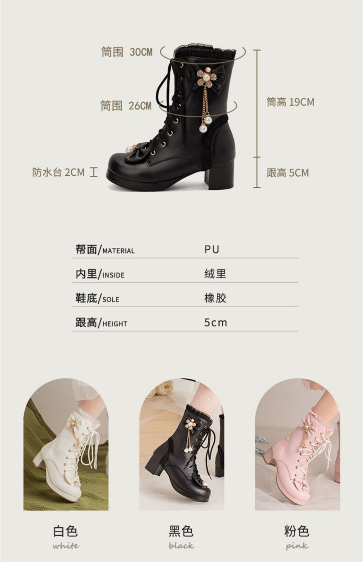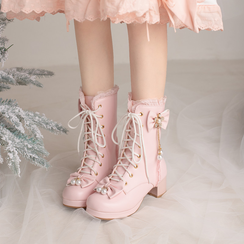 오리지널 로리타 스위트 보우 미드 부츠 여성용 패션 두꺼운 바닥 두꺼운 굽 미드 부츠 플러스 사이즈 레이스 업 마틴 부츠