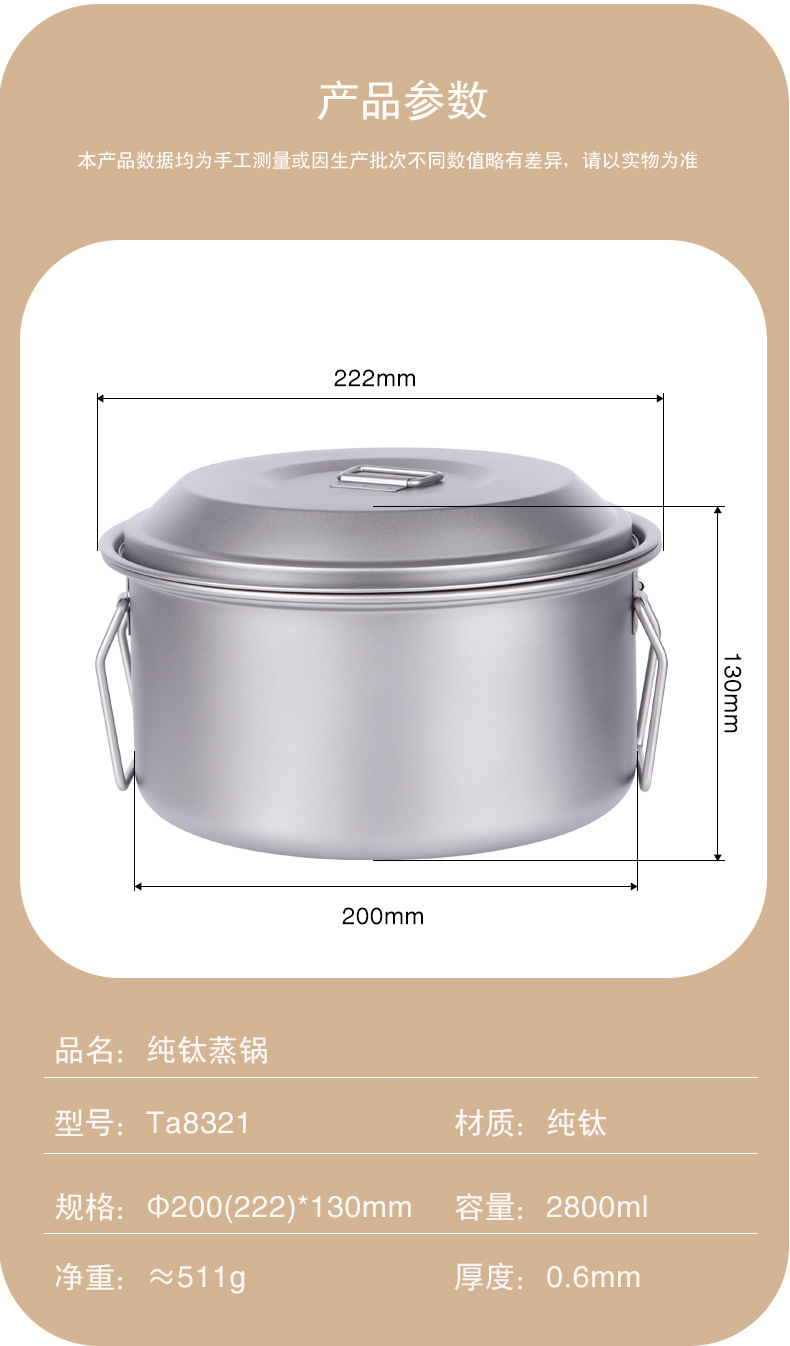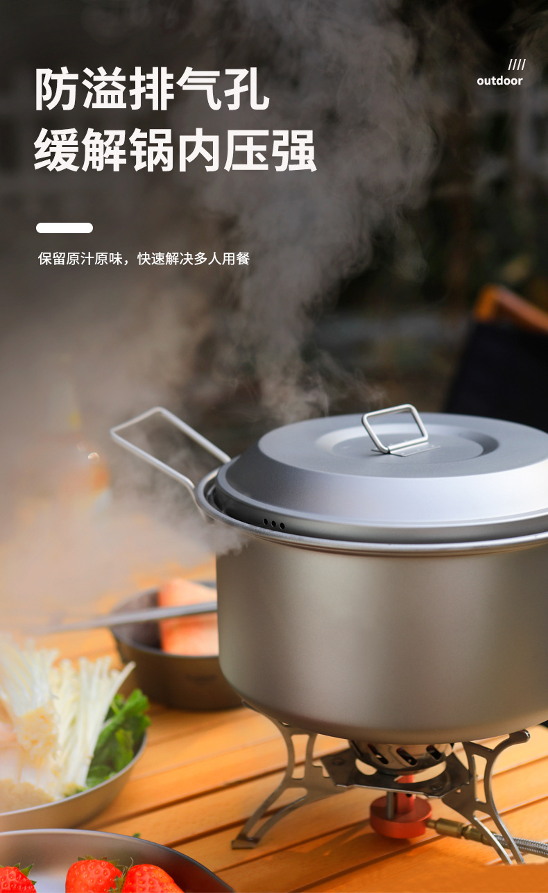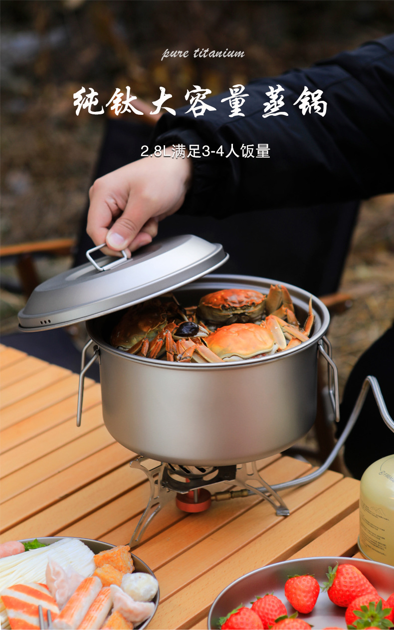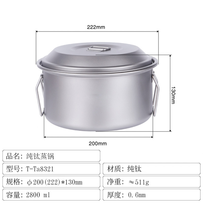야외 대용량 순수 티타늄 수프 냄비 캠핑 티타늄 냄비 세트 찜통 경량 휴대용 캠핑 가정용 티타늄 식기 2.8L