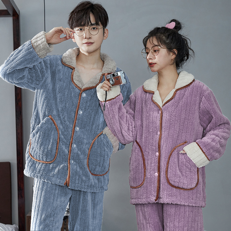 여성과 남성을위한 겉옷 잠옷 가을과 겨울 플란넬 두꺼운 스탠드 칼라 지퍼 산호 양털 커플 가정 의류 세트