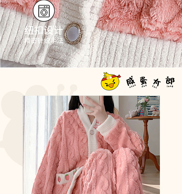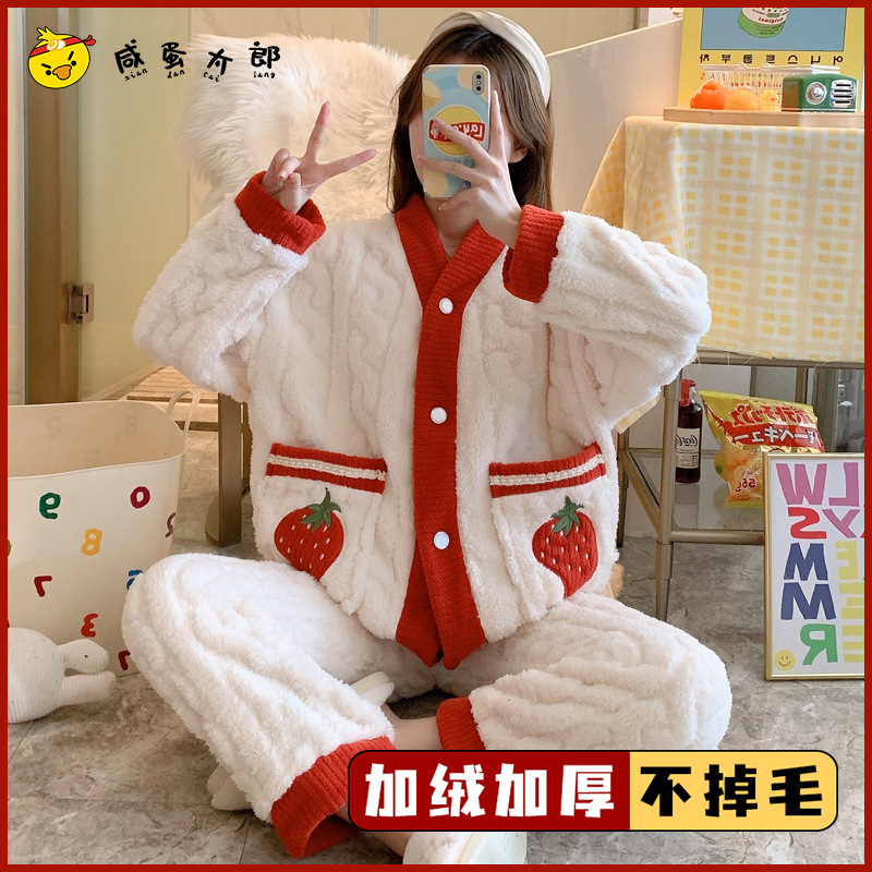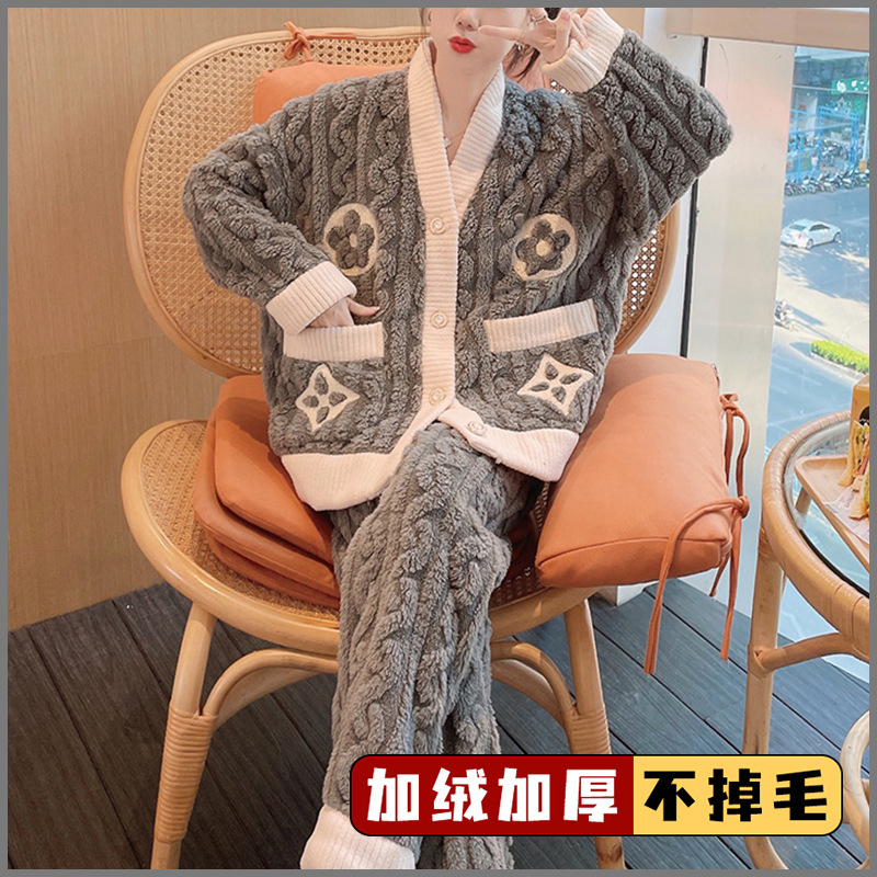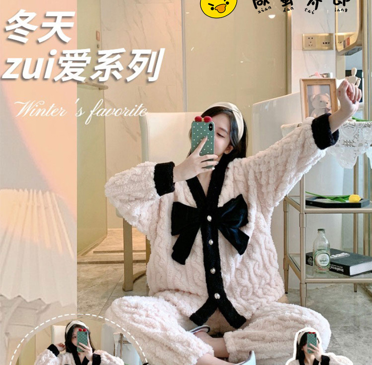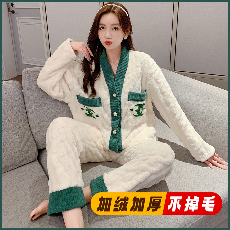 잠옷 여자의 가을과 겨울 새로운 겉옷 기모 두꺼운 따뜻한 산호 양털 플란넬 달콤한 가정 의류 세트 도매스토어 가기
