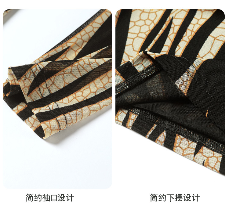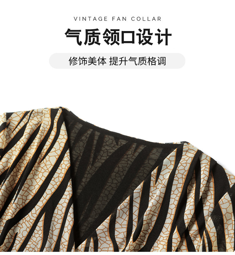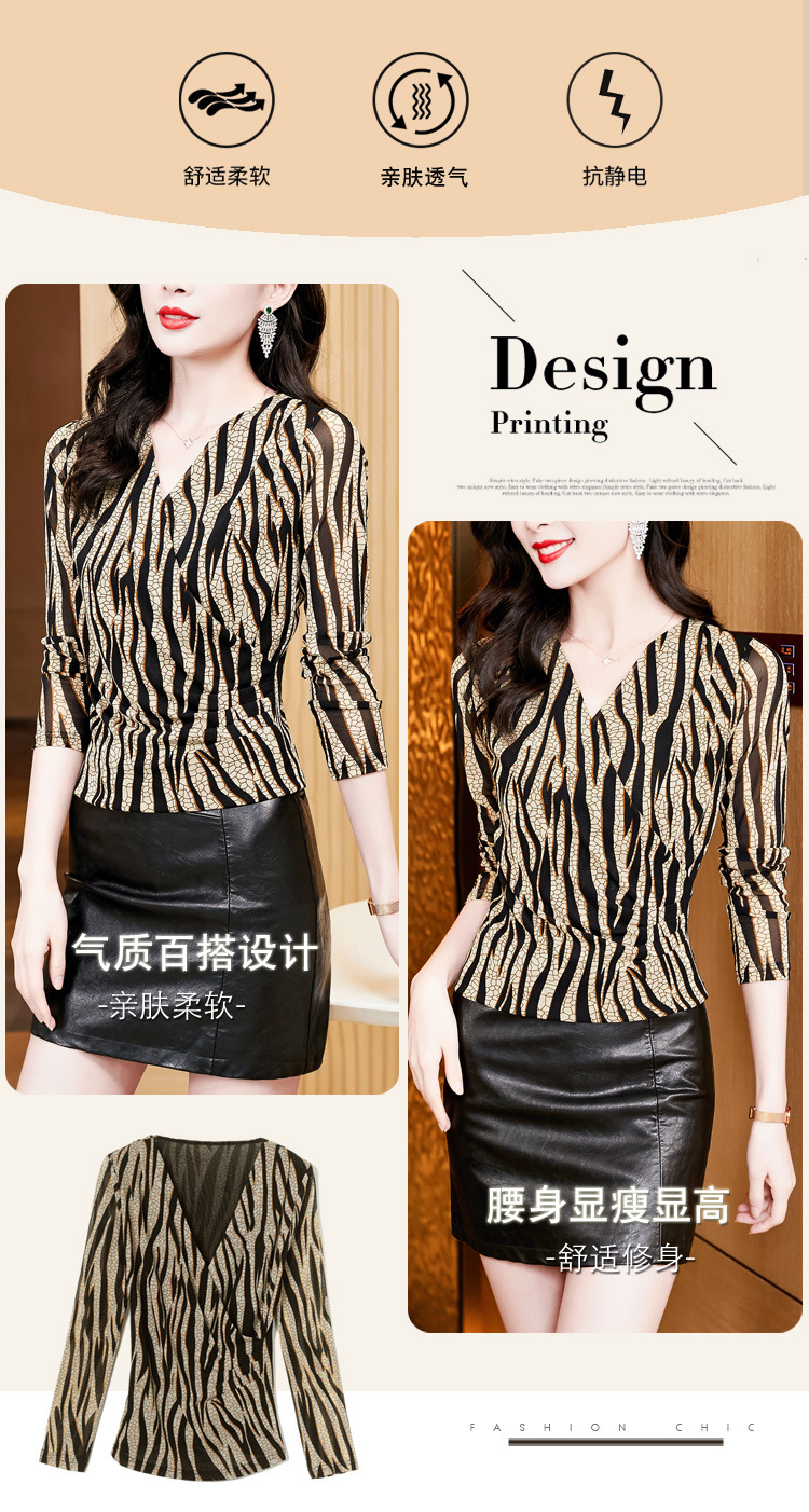 가을 2023 새로운 크로스 V-넥 우아한 슬림 핏 슬리밍 티셔츠 레오파드 무늬 메쉬 긴 소매 여성용 베이스 셔츠