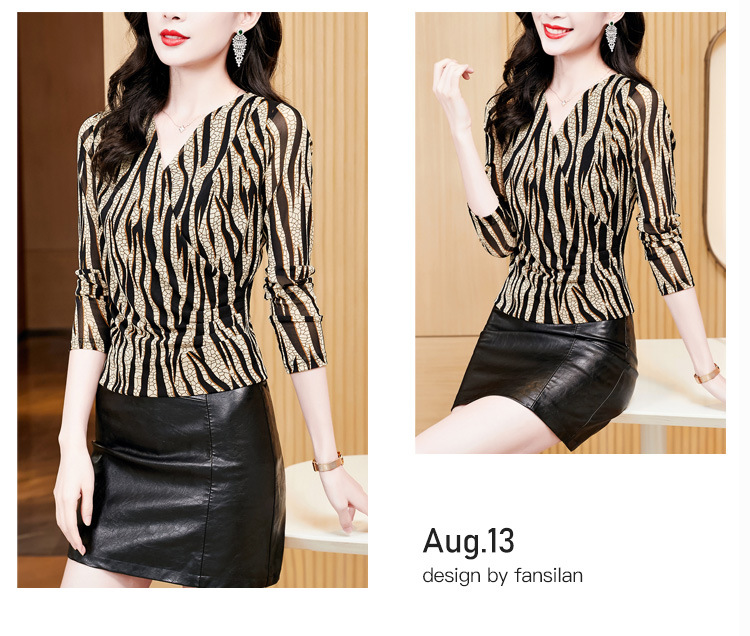 가을 2023 새로운 크로스 V-넥 우아한 슬림 핏 슬리밍 티셔츠 레오파드 무늬 메쉬 긴 소매 여성용 베이스 셔츠스토어 가기