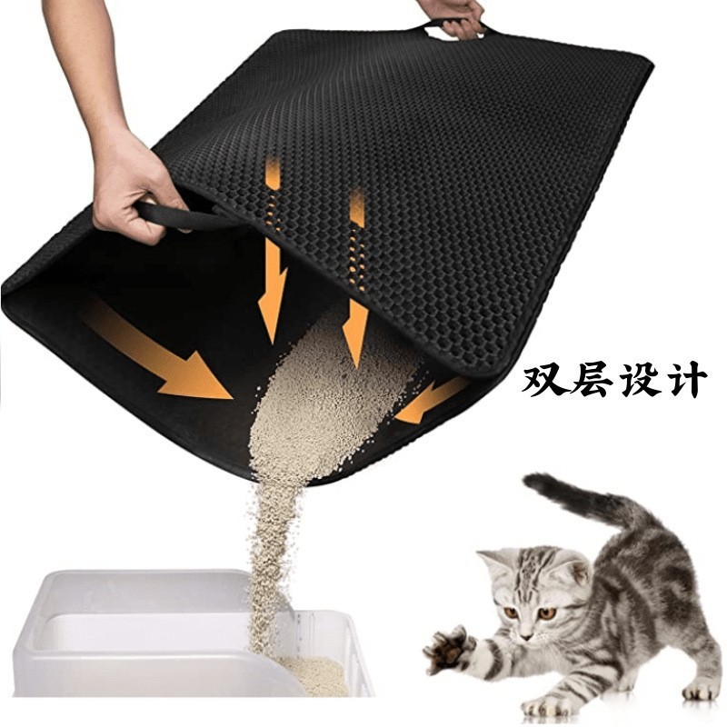 产品功能:适用95%以上种类的猫砂,上层通孔材料,猫砂可轻易通过,下层防水材质,猫砂、小便等脏物可聚集于此。猫砂垫为上下双层设计:上层采用六角形的洞孔凹凸设计,除了让猫砂落入后不再溅出外,圆球型的柔滑触感也可以避免猫咪抓坏,下层垫密封专门存放猫砂,底部设计成规则性的圆孔,有效防滑避免横冲直撞的猫咪滑到受伤。