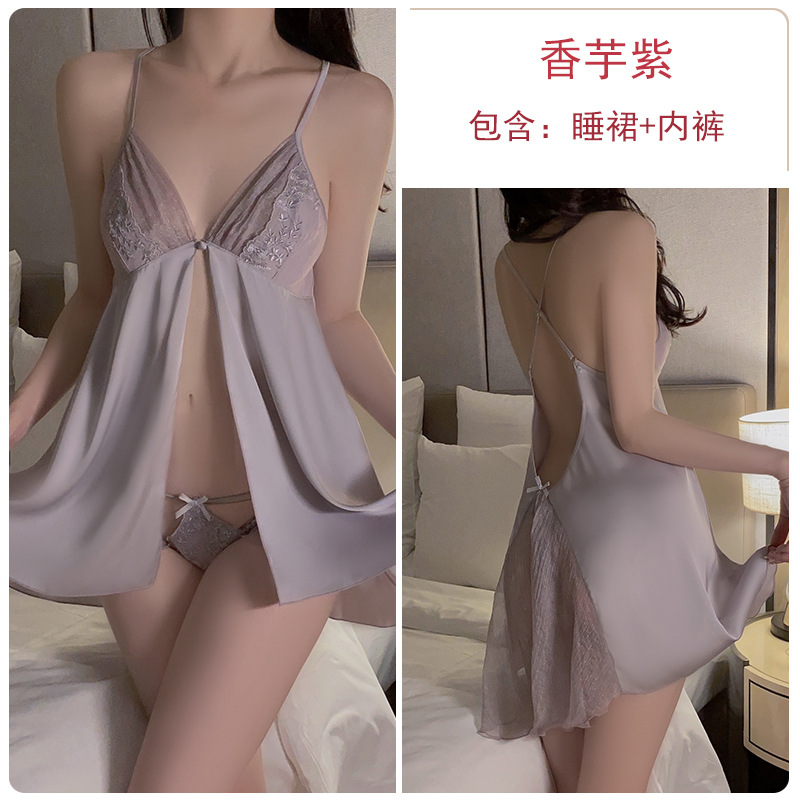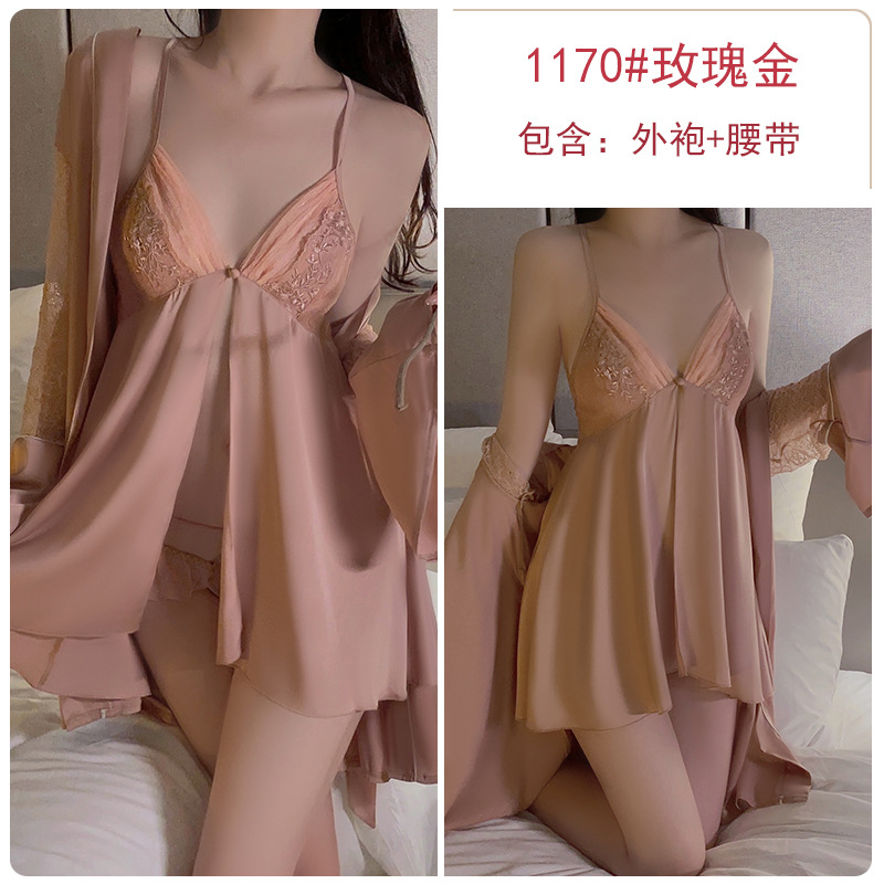 Guiruo 새틴 카디건 버튼 섹시 중공 원사 순수 욕망 슬링 잠옷 가운 여성의 홈 세트 2661