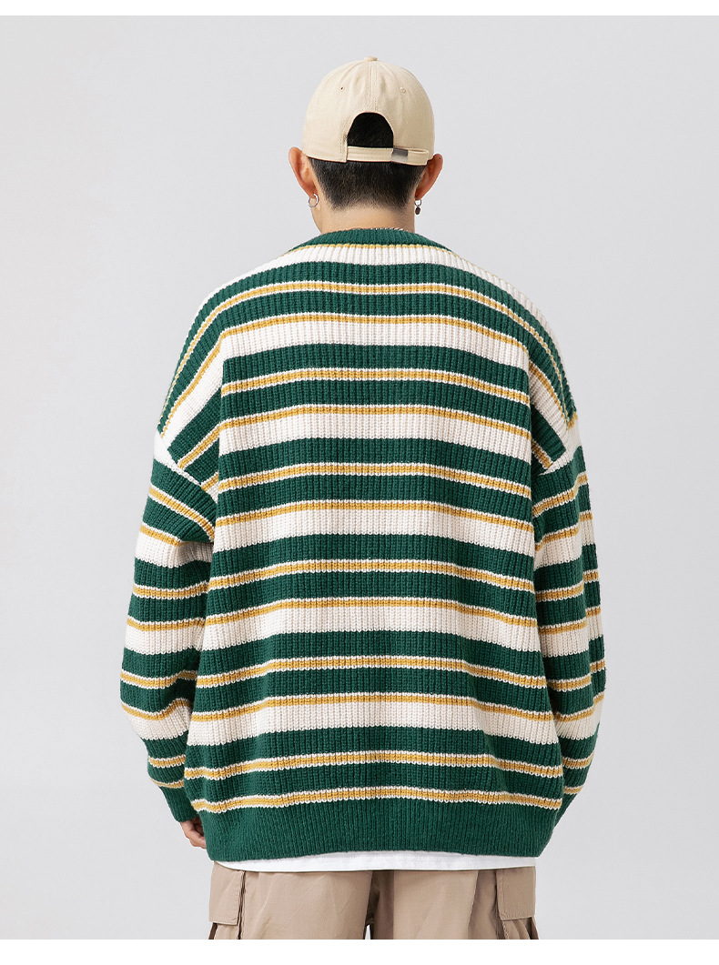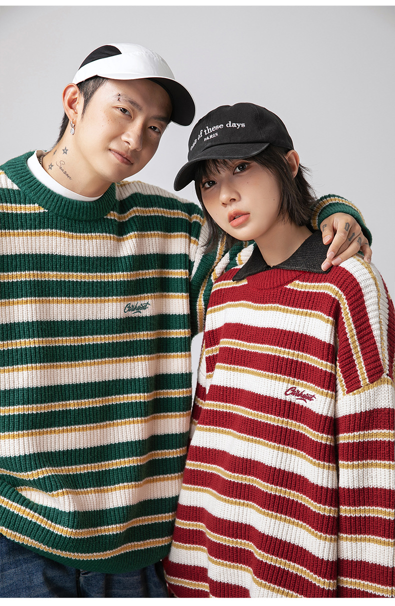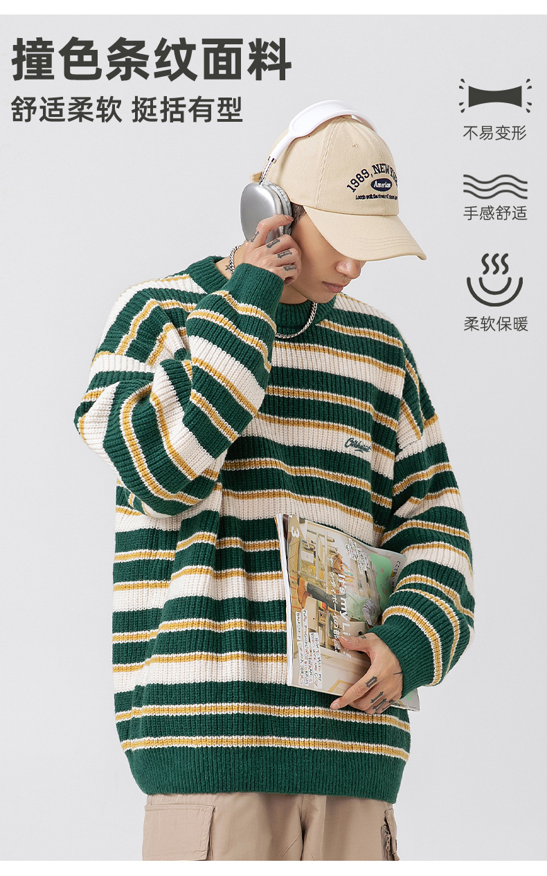 남성용 스트라이프 헤비급 두꺼운 니트 스웨터 2024 가을, 겨울 새 커플 복고풍 대비 색상 일본 라운드 넥 스웨터 재킷