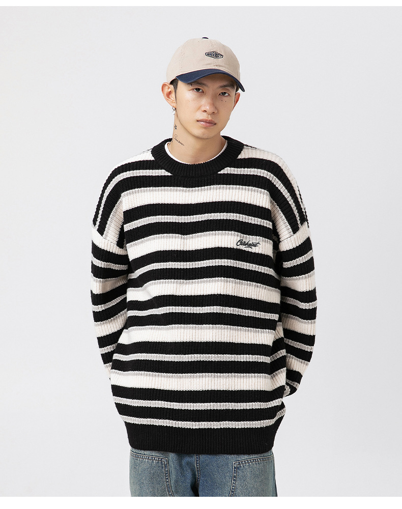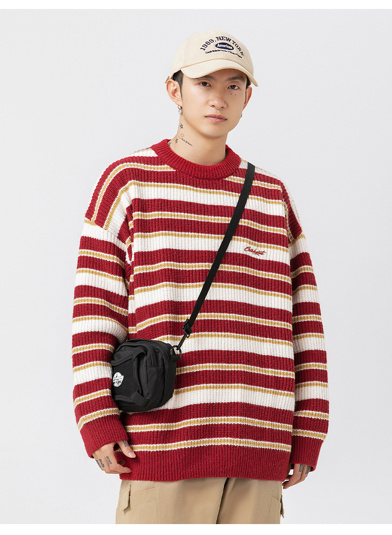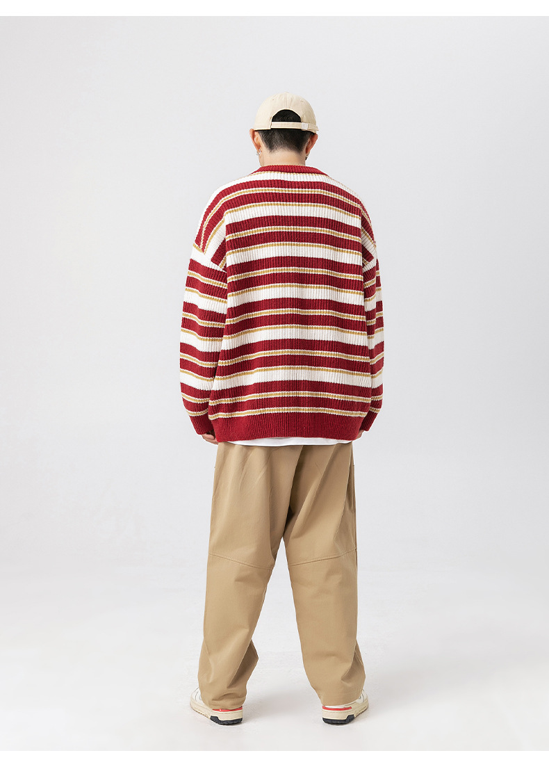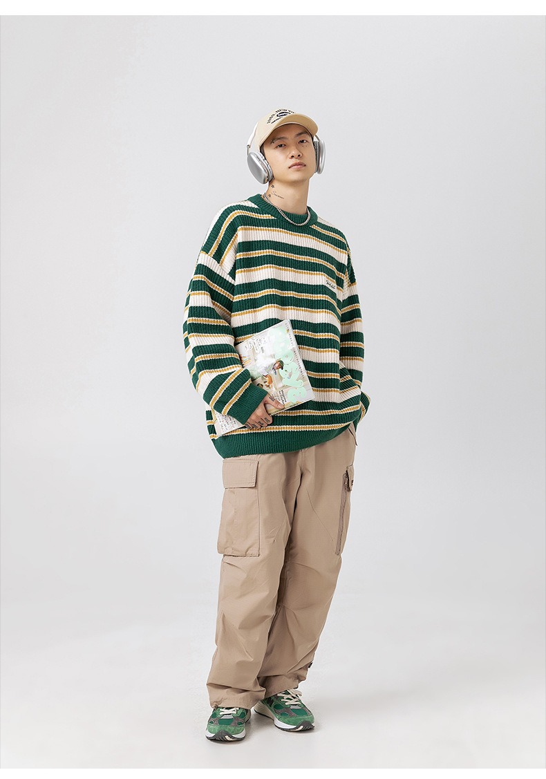 남성용 스트라이프 헤비급 두꺼운 니트 스웨터 2024 가을, 겨울 새 커플 복고풍 대비 색상 일본 라운드 넥 스웨터 재킷