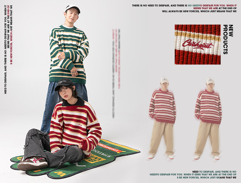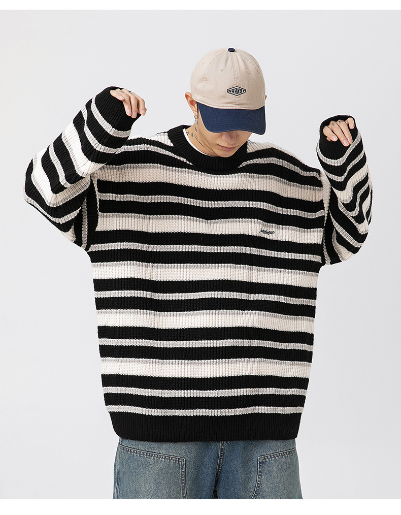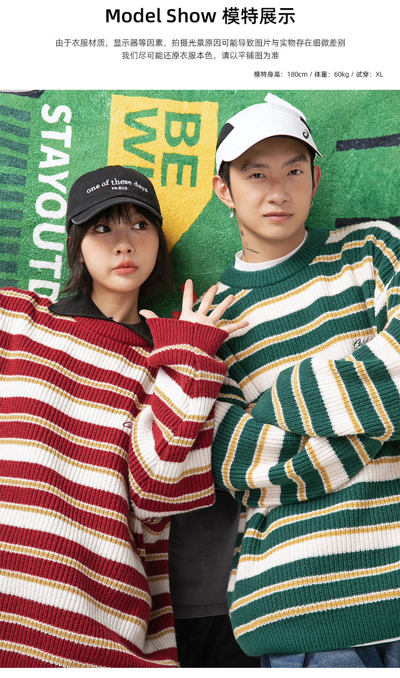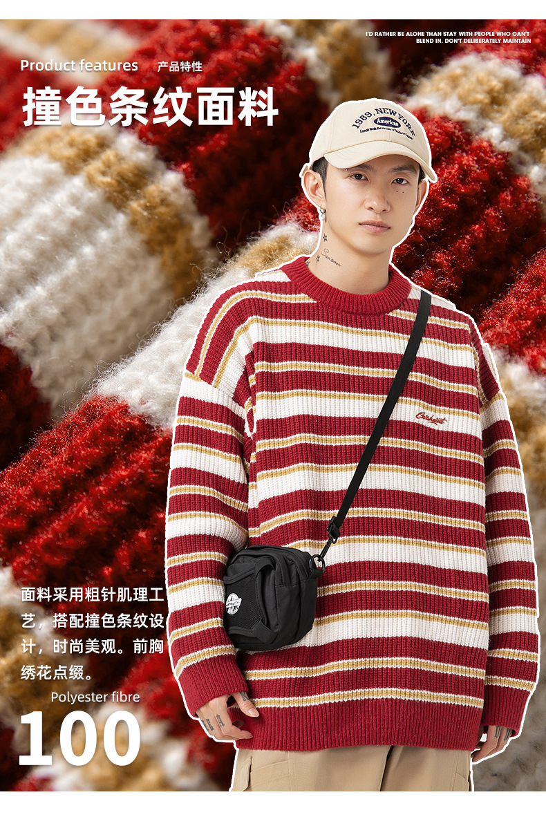 남성용 스트라이프 헤비급 두꺼운 니트 스웨터 2024 가을, 겨울 새 커플 복고풍 대비 색상 일본 라운드 넥 스웨터 재킷스토어 가기