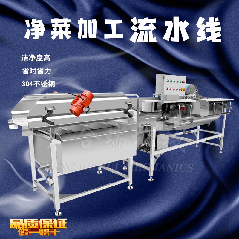 旋流蔬菜清洗机采用卧式混流喷冲清洗原理形成螺旋状的混合水流清洗蔬菜物料,完成清洗后随水流输出至振动式沥水装备,水同蔬菜物料分离完成沥水,物料在震动筛网面震动输出,经清洗喷淋后输出下道工序,水与杂质经过滤网过滤分离,并经循环水泵打入槽体内循环利用。净菜清洗机特别适合叶菜类,切割后根茎类和瓜果类蔬菜物料的清洗。