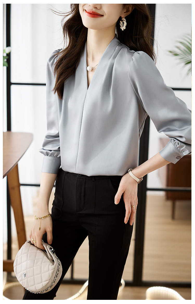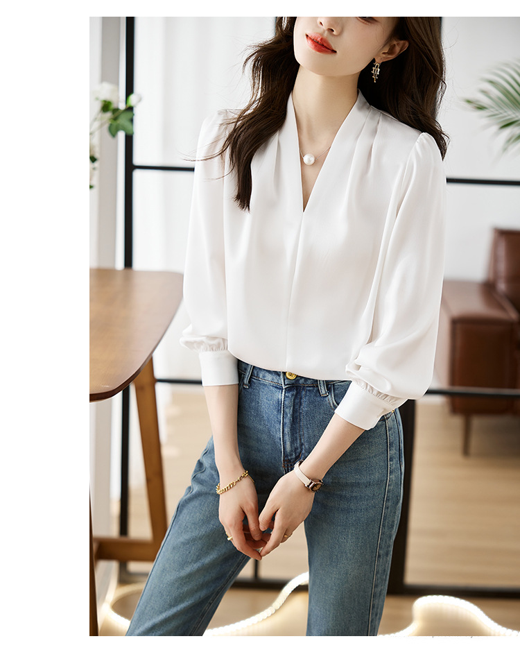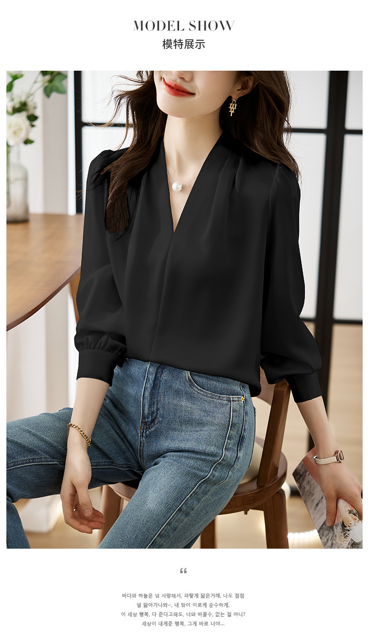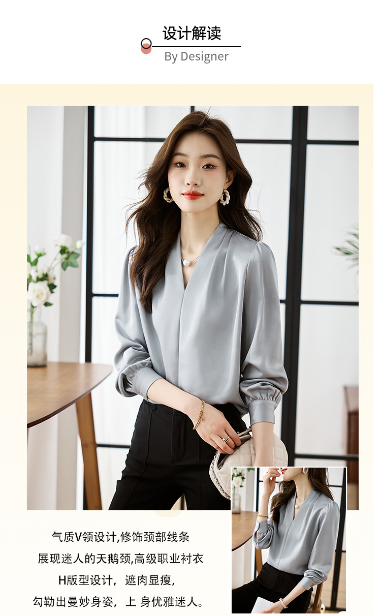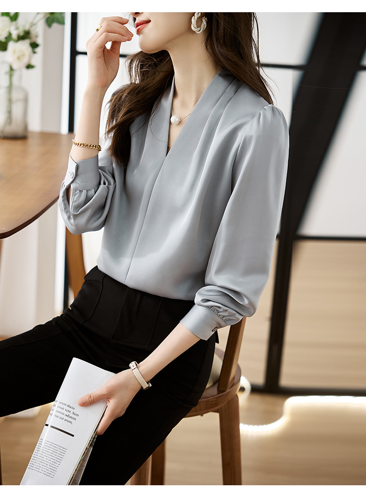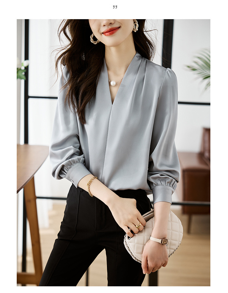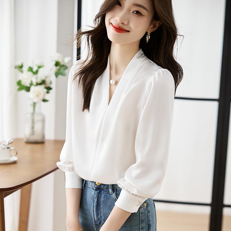 엄선된 고급 심플 셔츠 여성 봄 기질 브이넥 가벼운 성숙한 스타일 통근 아세테이트 새틴 쉬폰 셔츠 상의