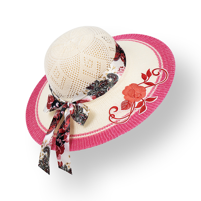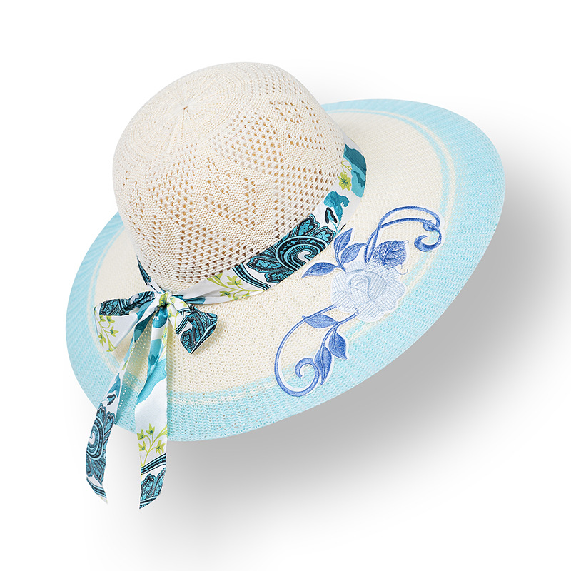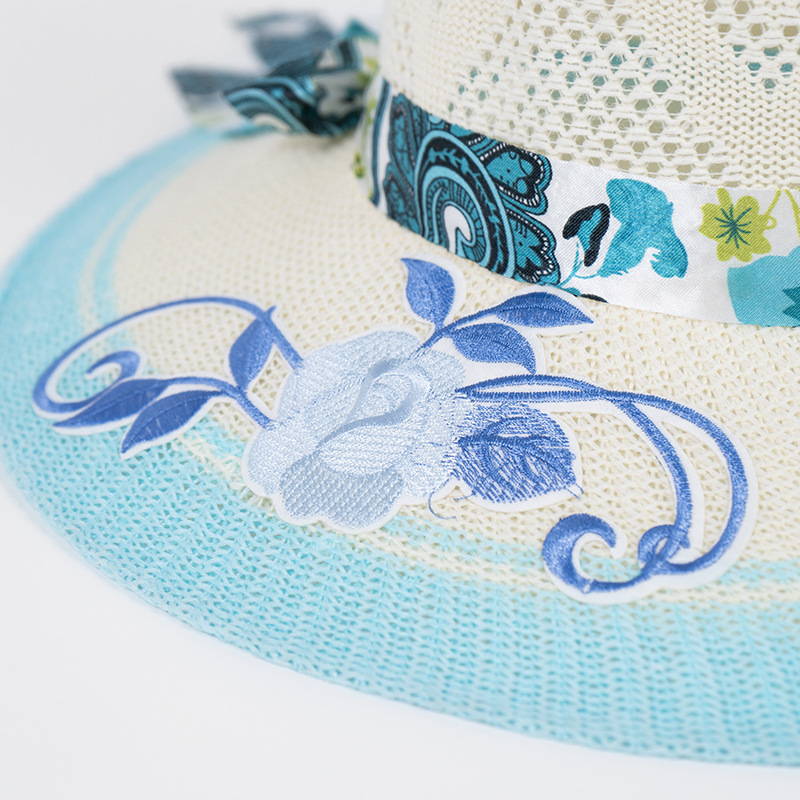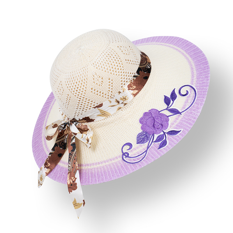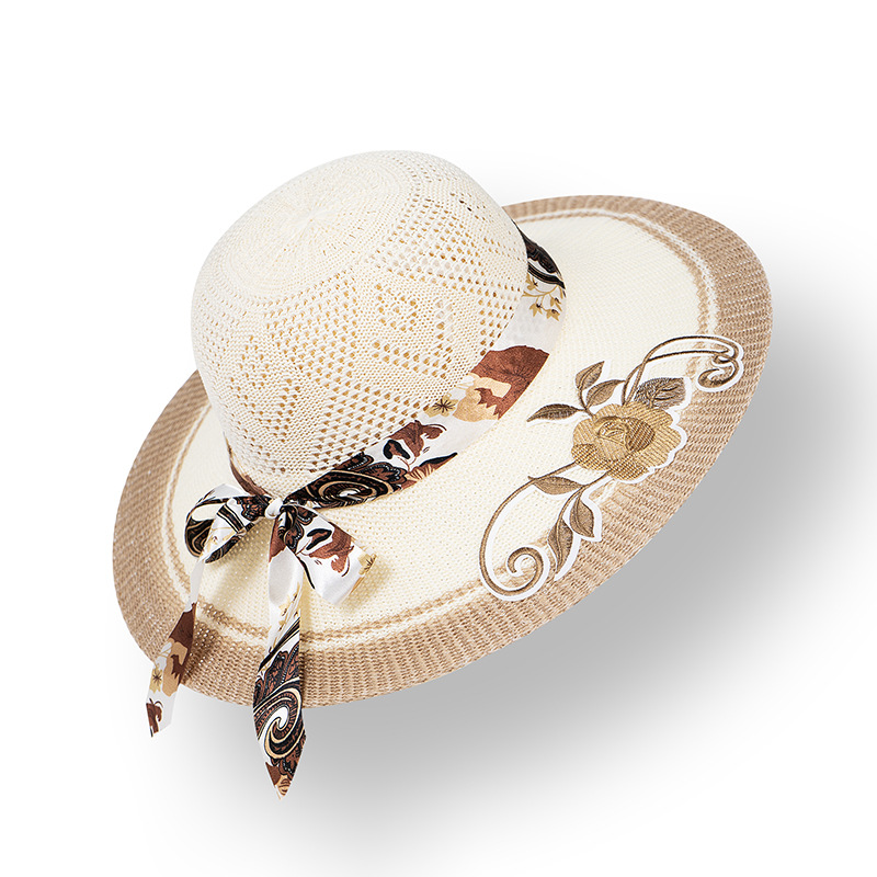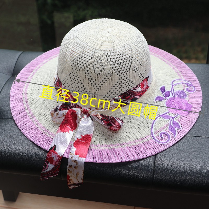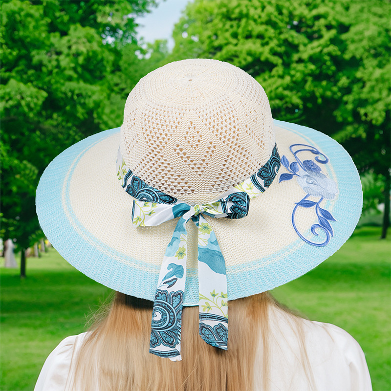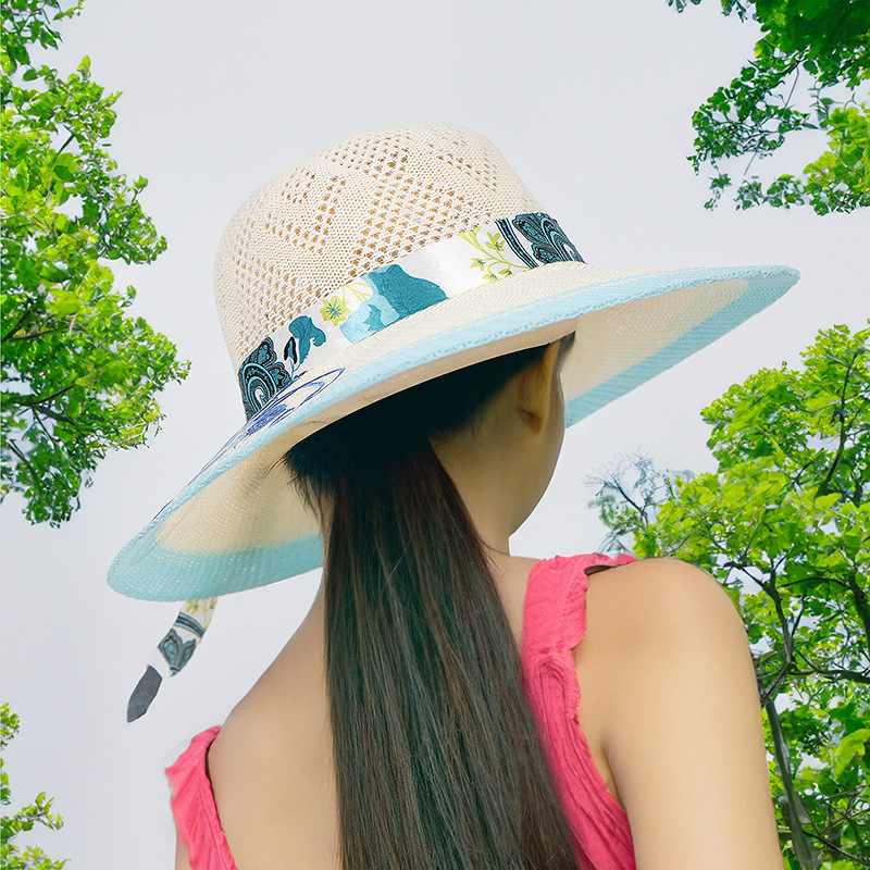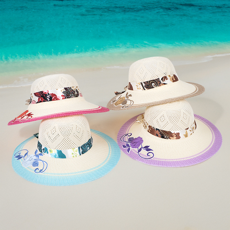 모자 여성용 여름 여행 자외선 차단제 모자 해변 차양 모자 새로운 자수 큰 챙 밀짚 모자 여름 여성용 차양 모자