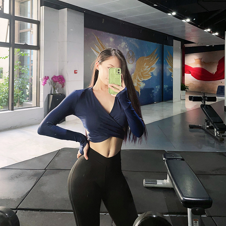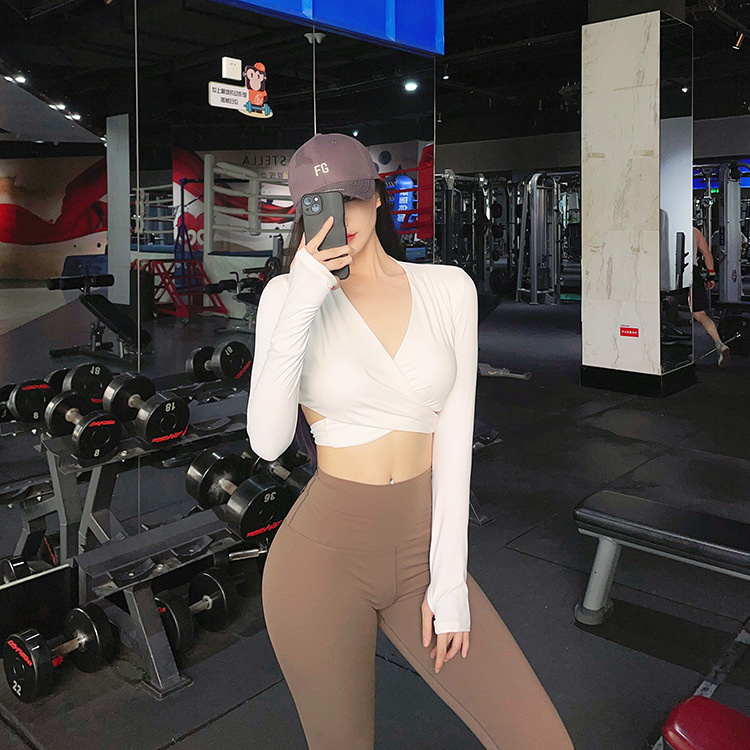 가을과 겨울 새로운 요가 옷 긴 소매 크로스 섹시한 여성의 탈착식 가슴 패드 피트니스 스포츠 탑 알몸 편안한 도매스토어 가기