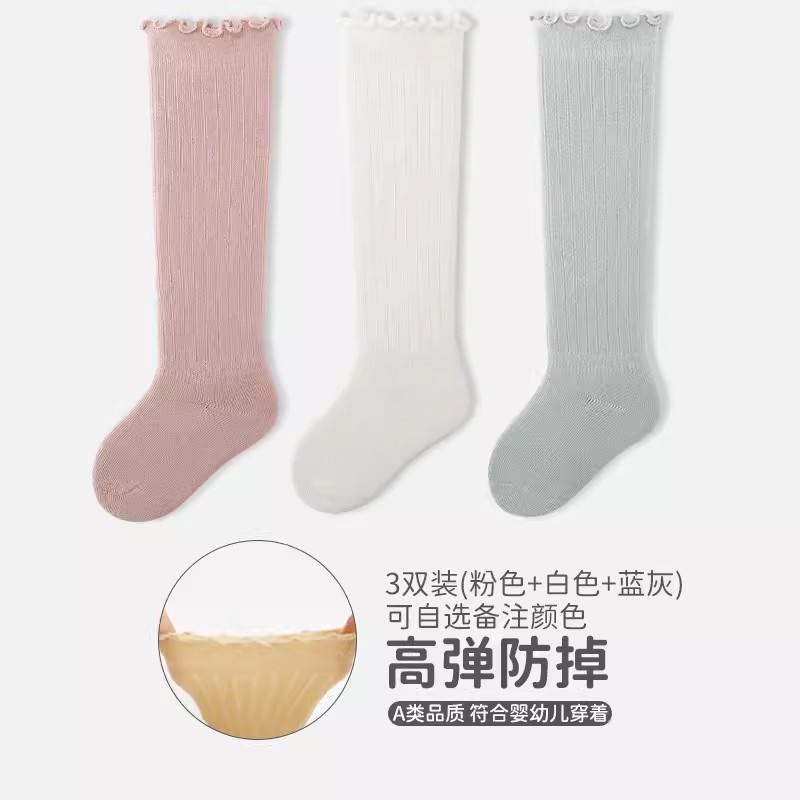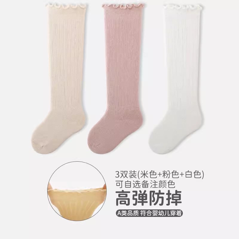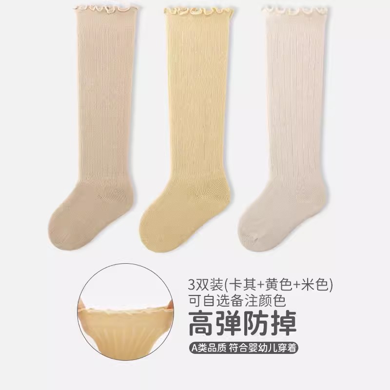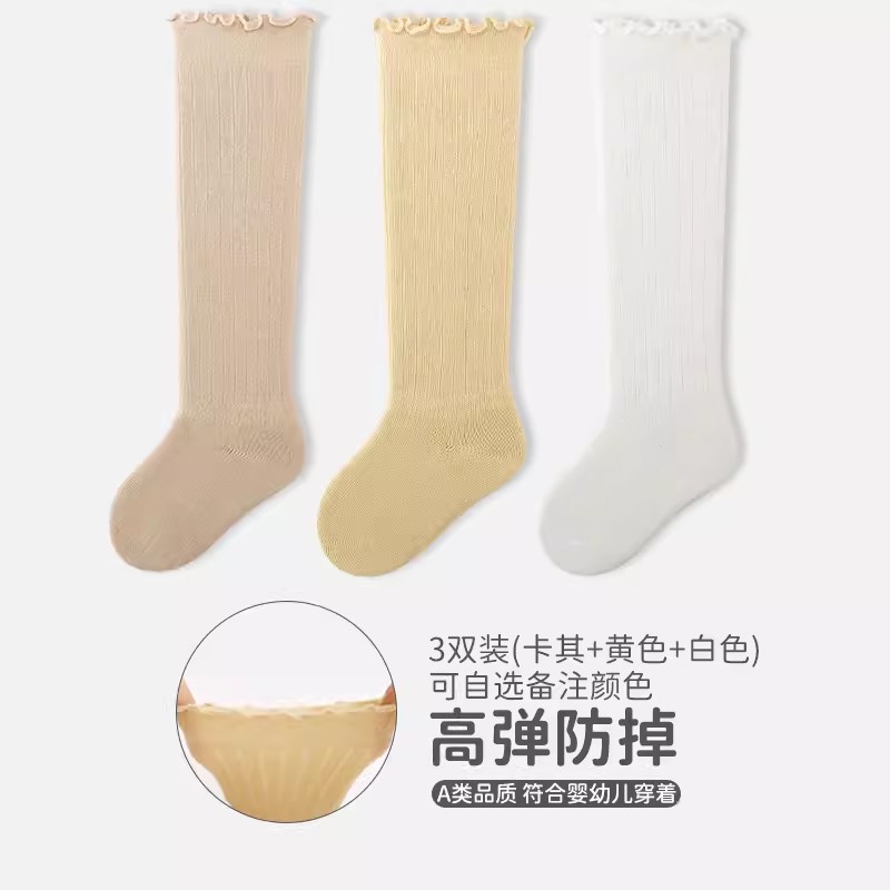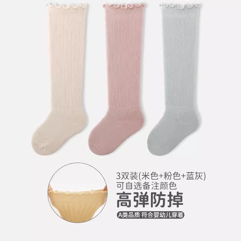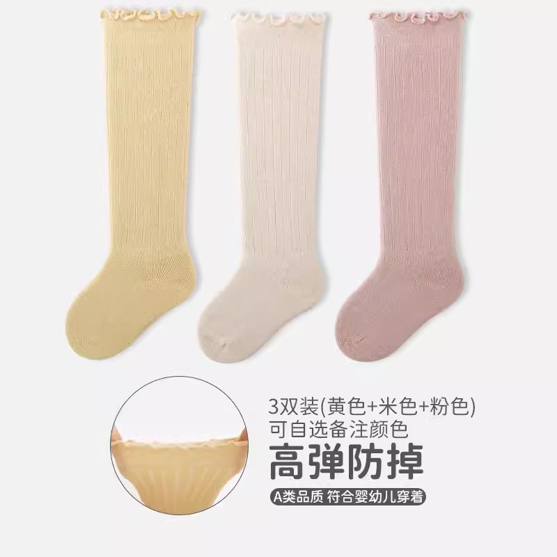 엄선된 3켤레 어린이용 하이삭스, 코마면 아기 양말, 캔디 컬러 러플 가장자리 신생아 양말 A급