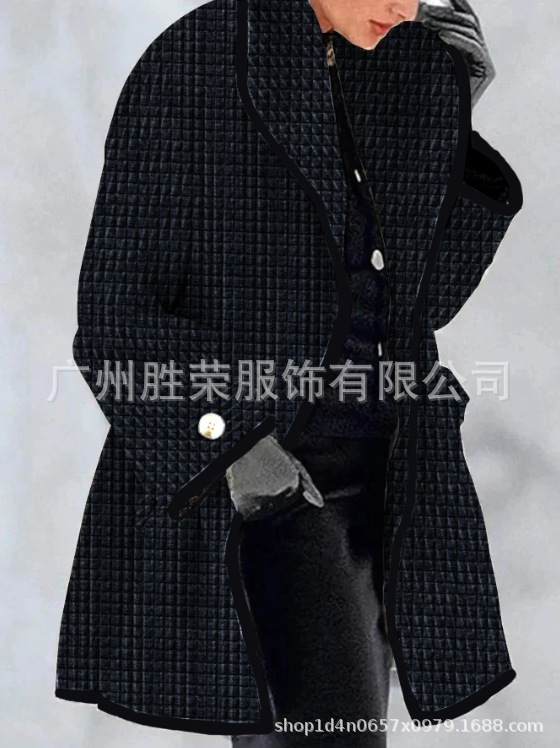 가을과 겨울 새로운 크로스 보더 유럽과 미국 여성의 3 차원 격자 무늬 패브릭 단색 주문 블랙 에지 포켓 모직 코트 윈드 브레이커 코트스토어 가기