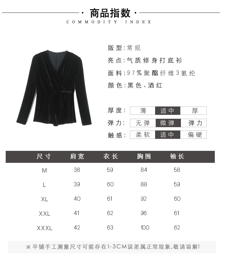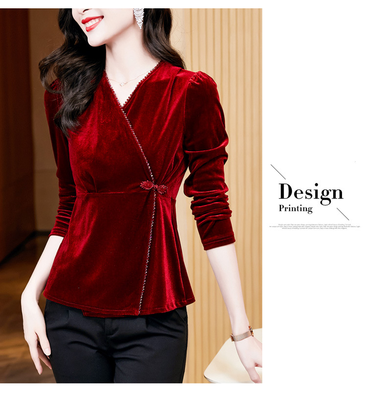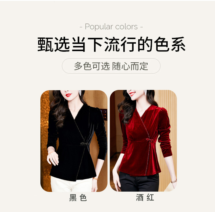 2023 가을과 겨울 새로운 웨스턴 스타일 올 매치 크로스 브이넥 브라이트 비드 버튼 벨벳 긴팔 티셔츠 여성용 슬림핏 슬리밍 탑스토어 가기