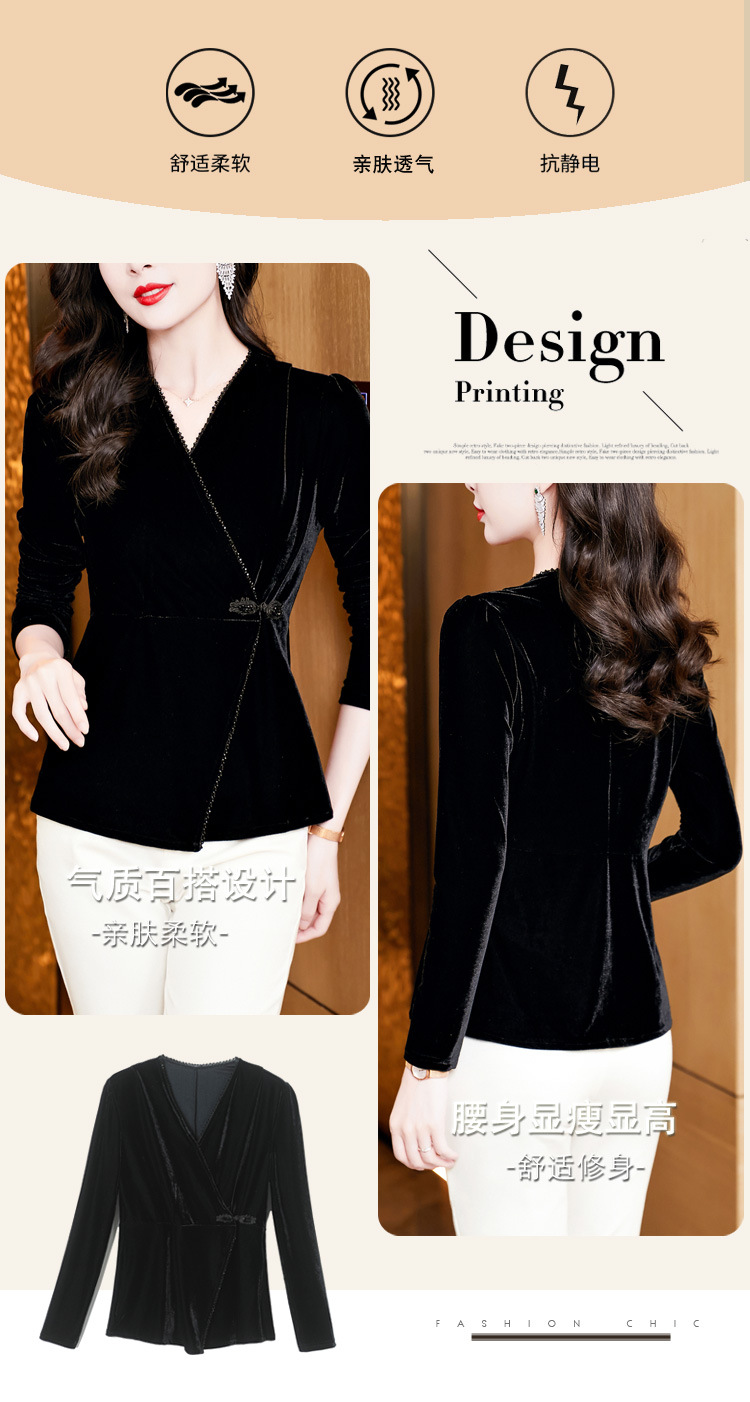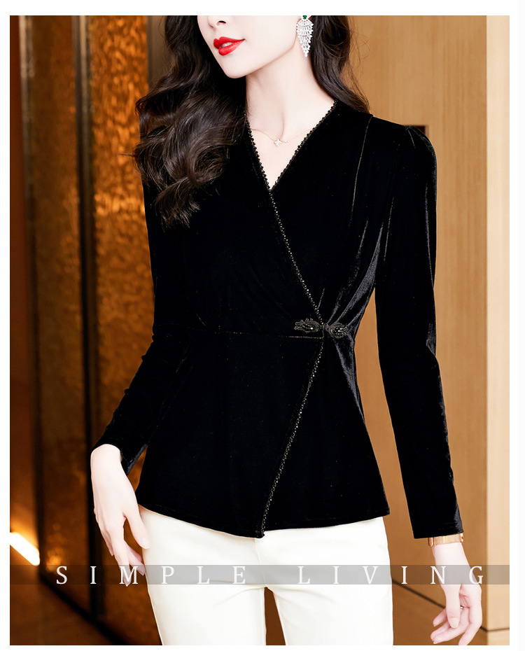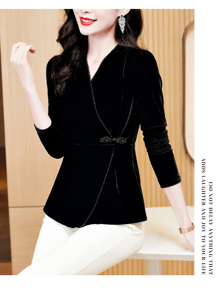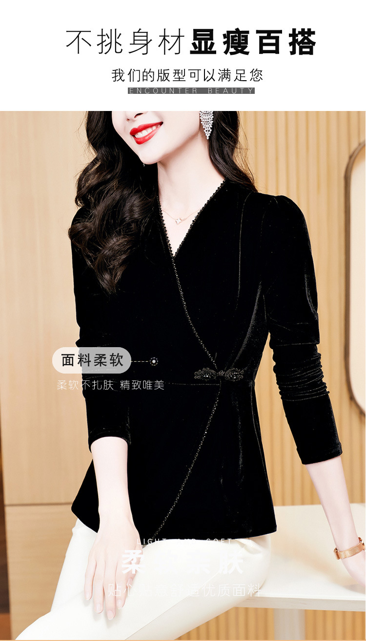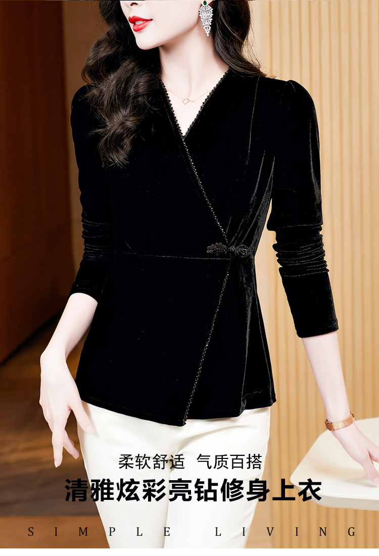 2023 가을과 겨울 새로운 웨스턴 스타일 올 매치 크로스 브이넥 브라이트 비드 버튼 벨벳 긴팔 티셔츠 여성용 슬림핏 슬리밍 탑