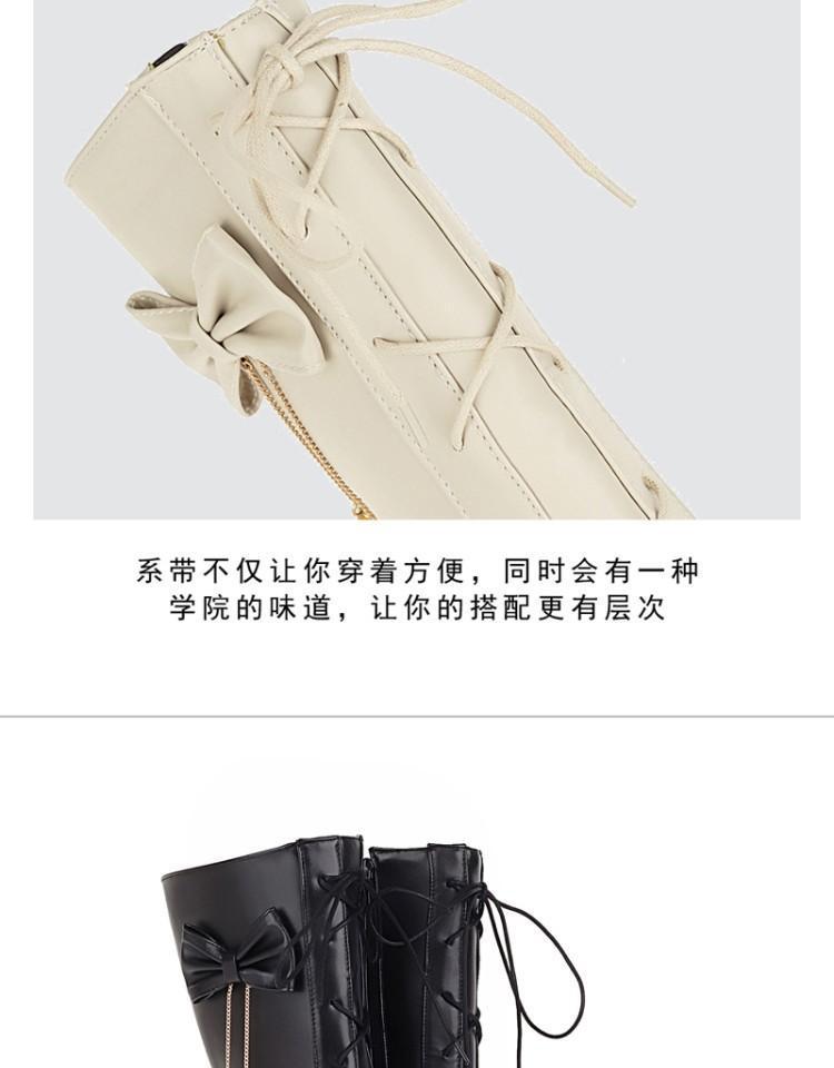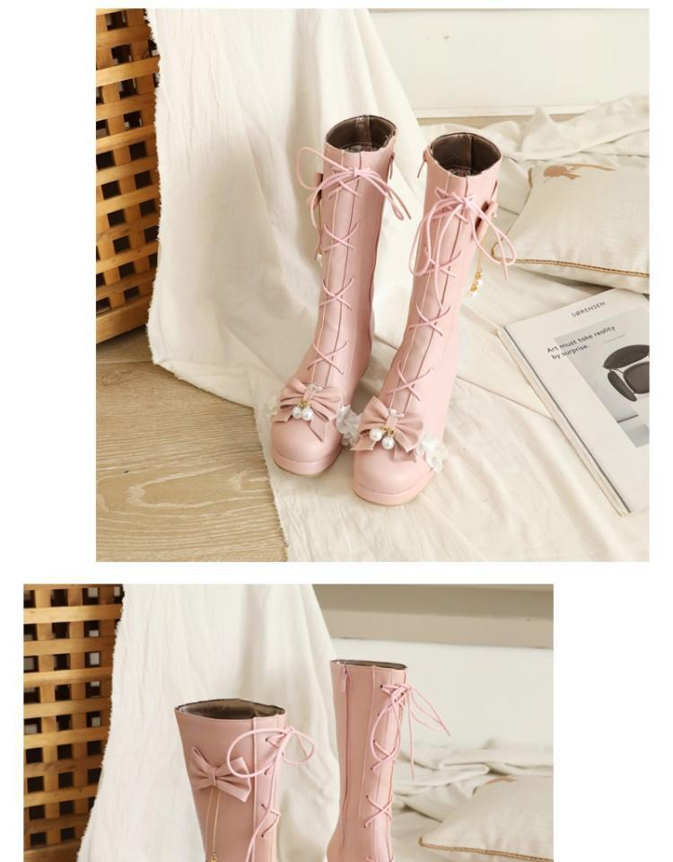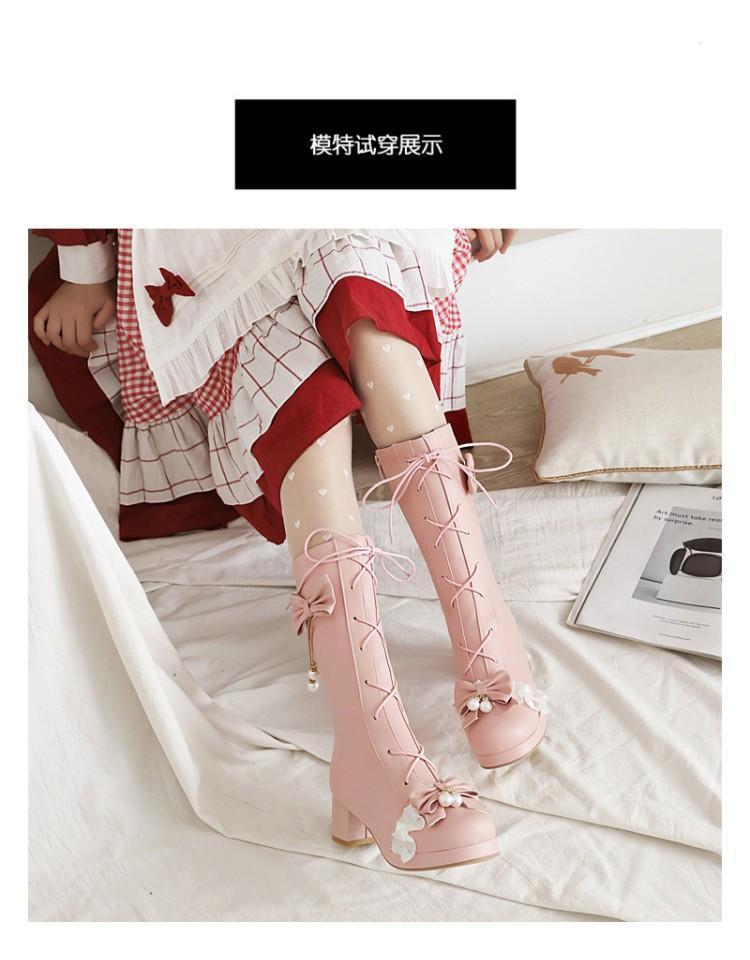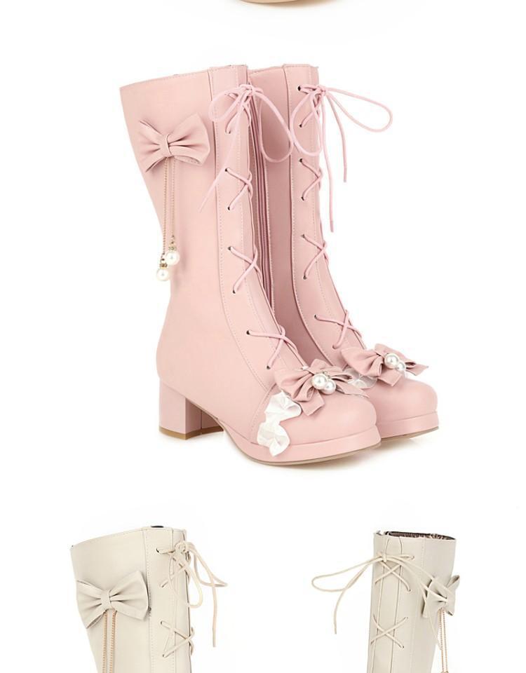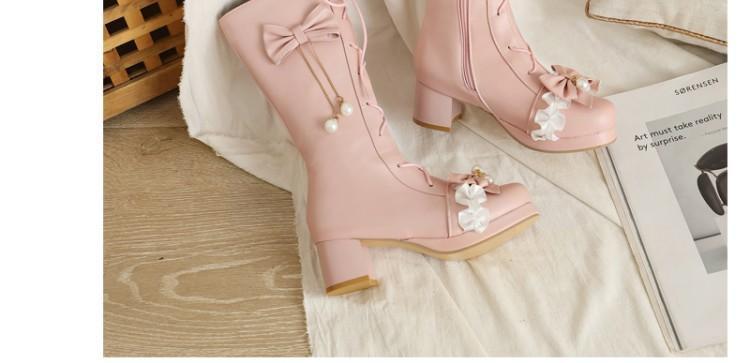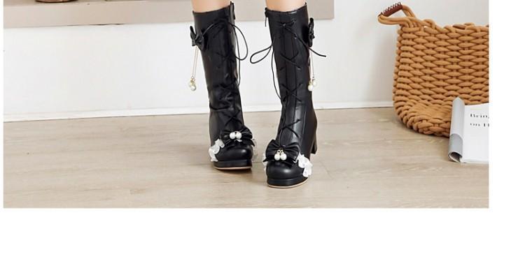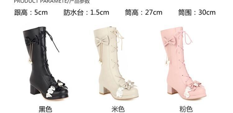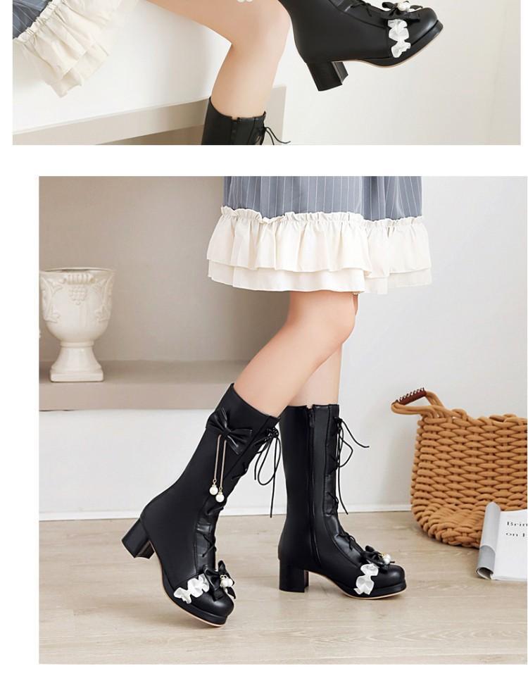 일본식 달콤한 로리타 미들 부츠 보우 티 파티 여성 신발 두꺼운 미들 힐 나이트 부츠 플러스 사이즈 모든 매치 미들 부츠