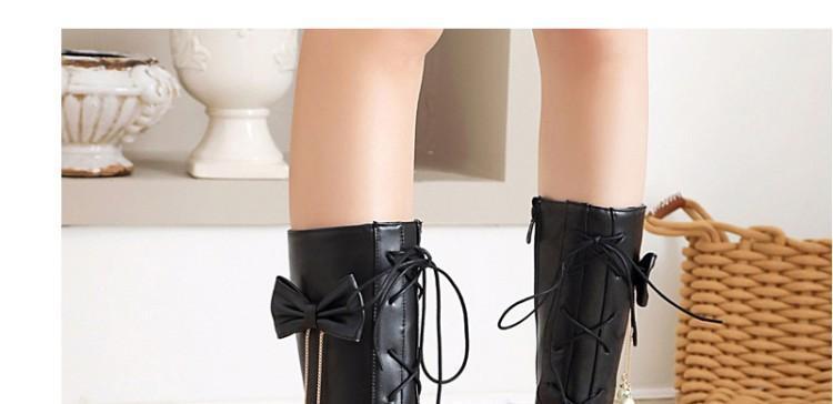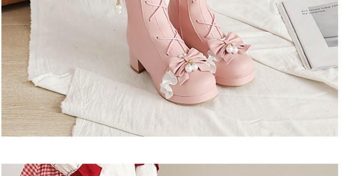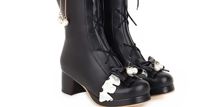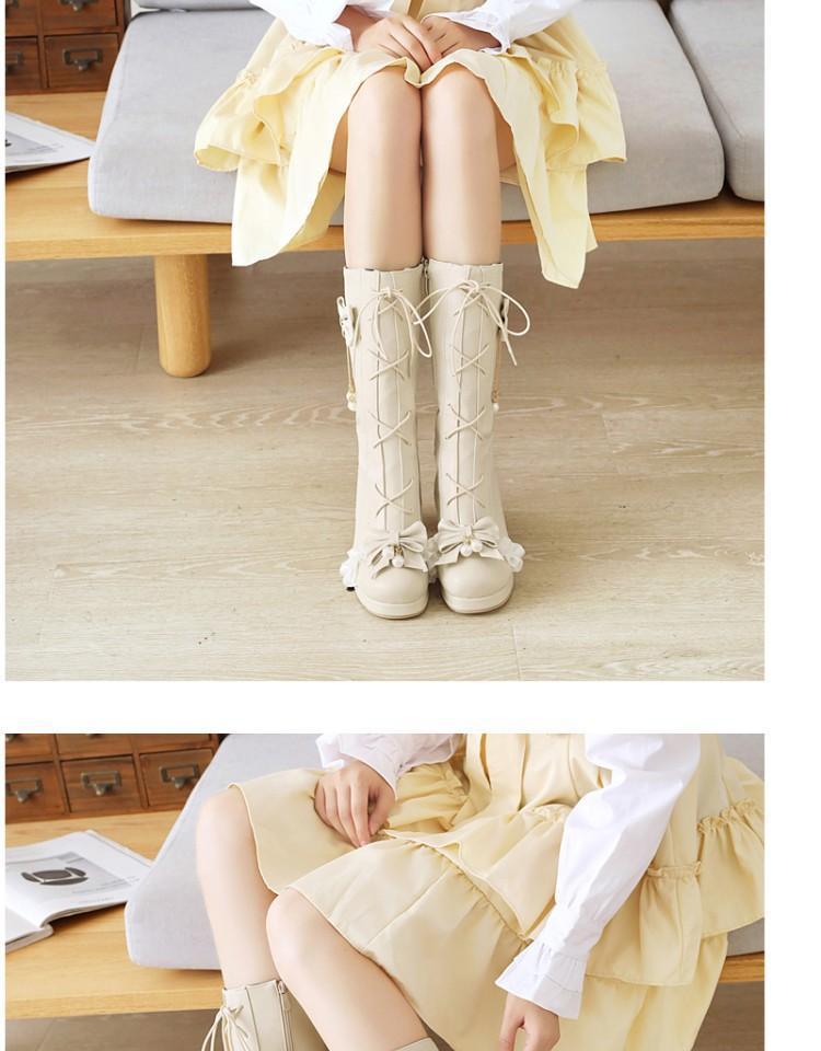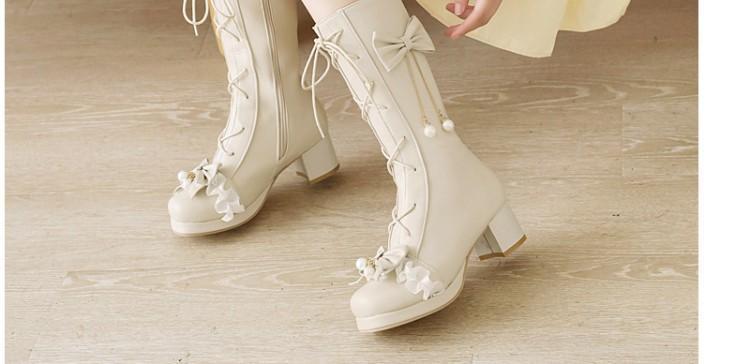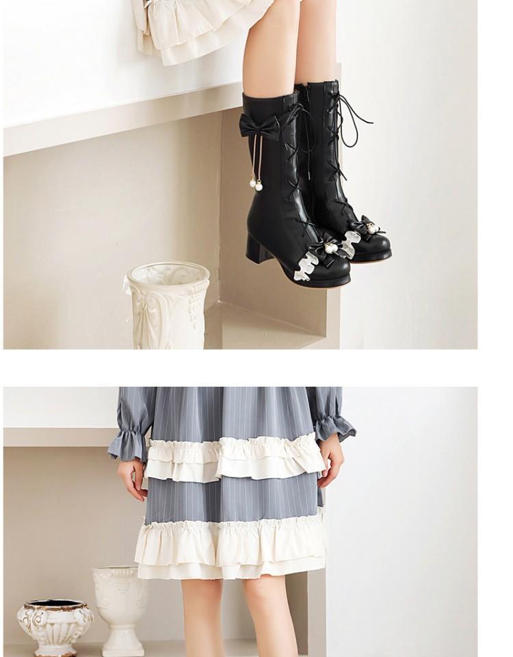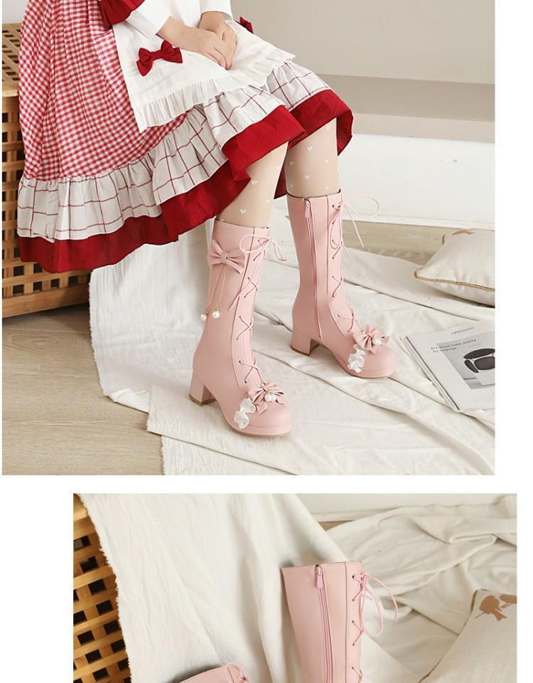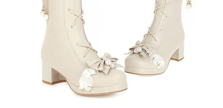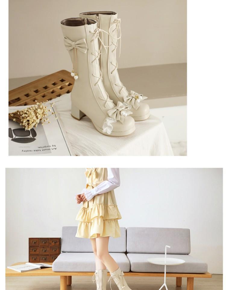일본식 달콤한 로리타 미들 부츠 보우 티 파티 여성 신발 두꺼운 미들 힐 나이트 부츠 플러스 사이즈 모든 매치 미들 부츠