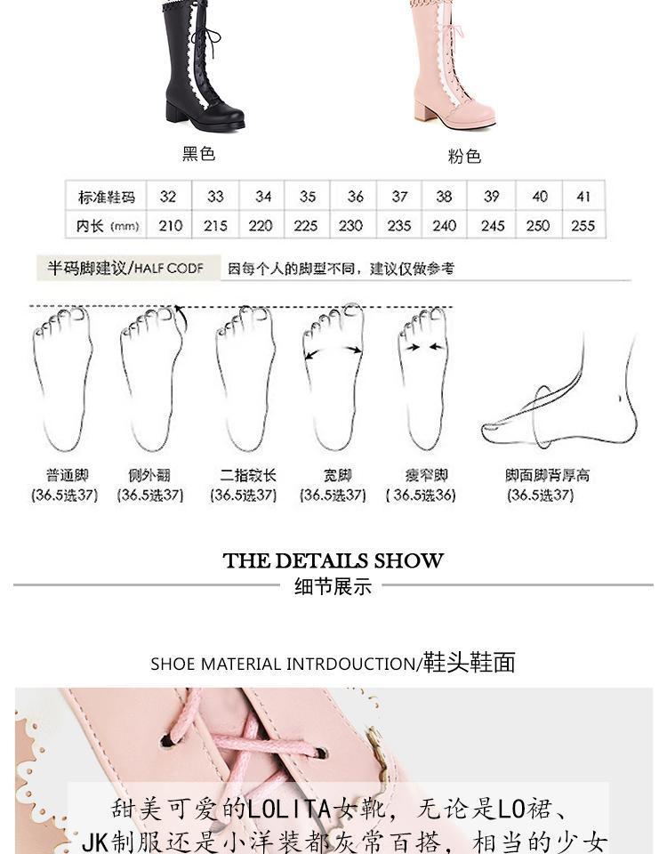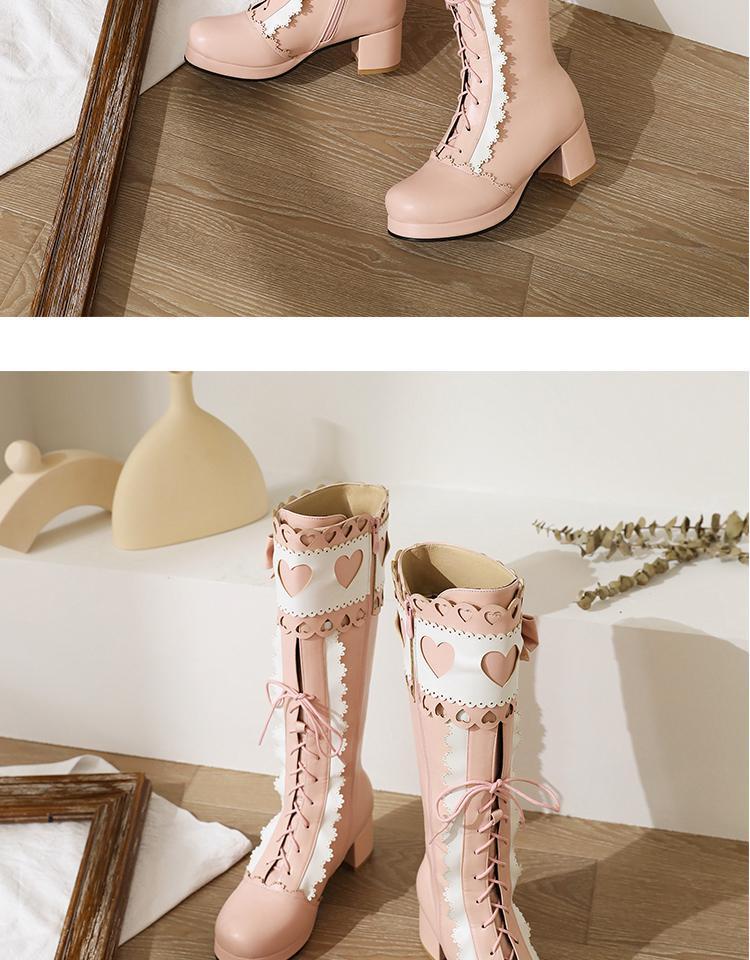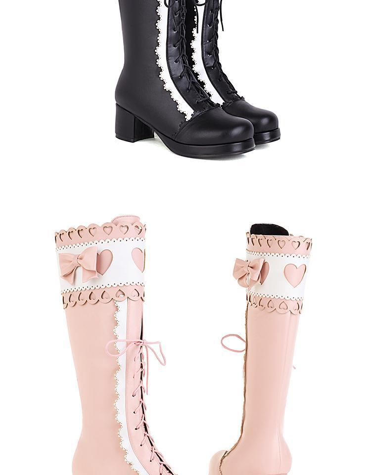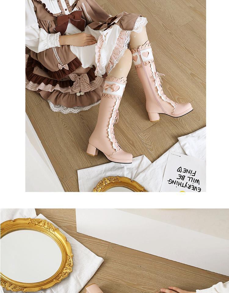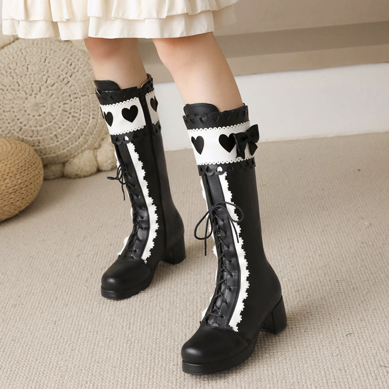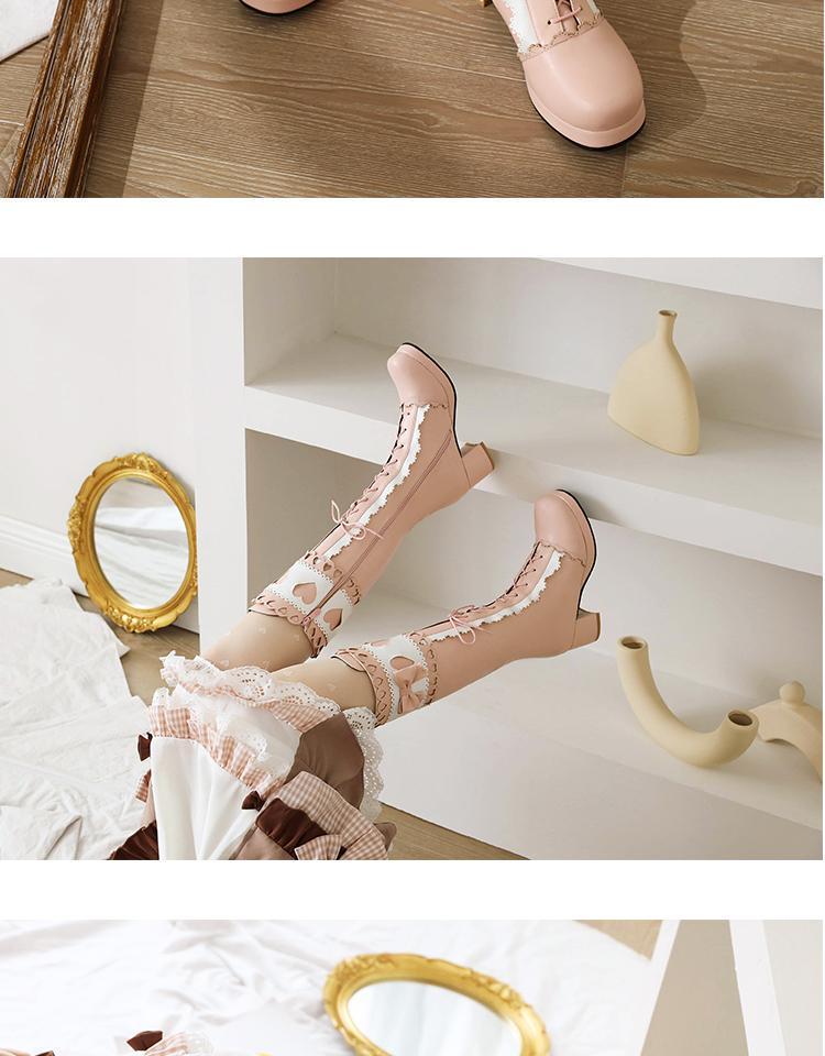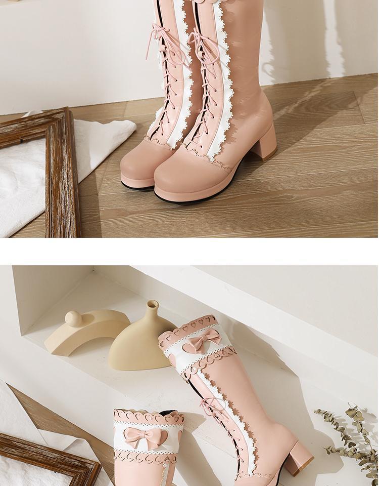 하지만 니 롱 부츠 달콤한 레이스 업 여성 부츠 라운드 토 두꺼운 미드 힐 나이트 부츠 활 로리타 하이 부츠