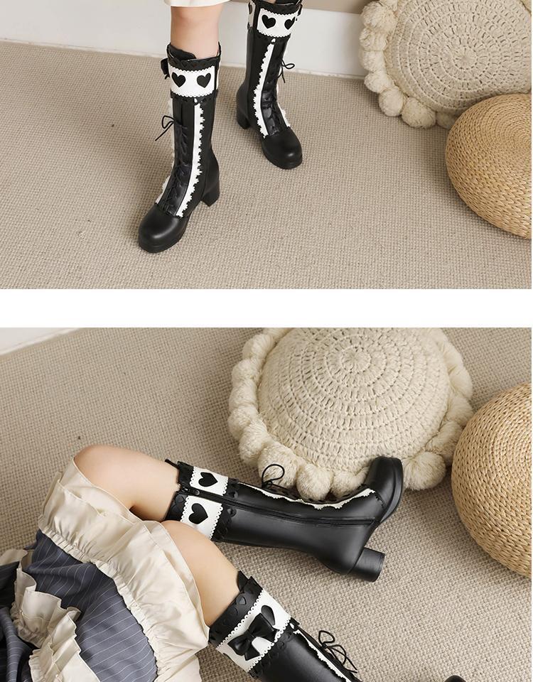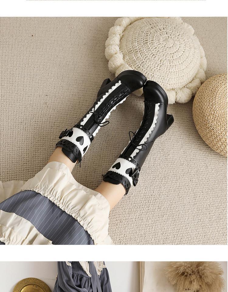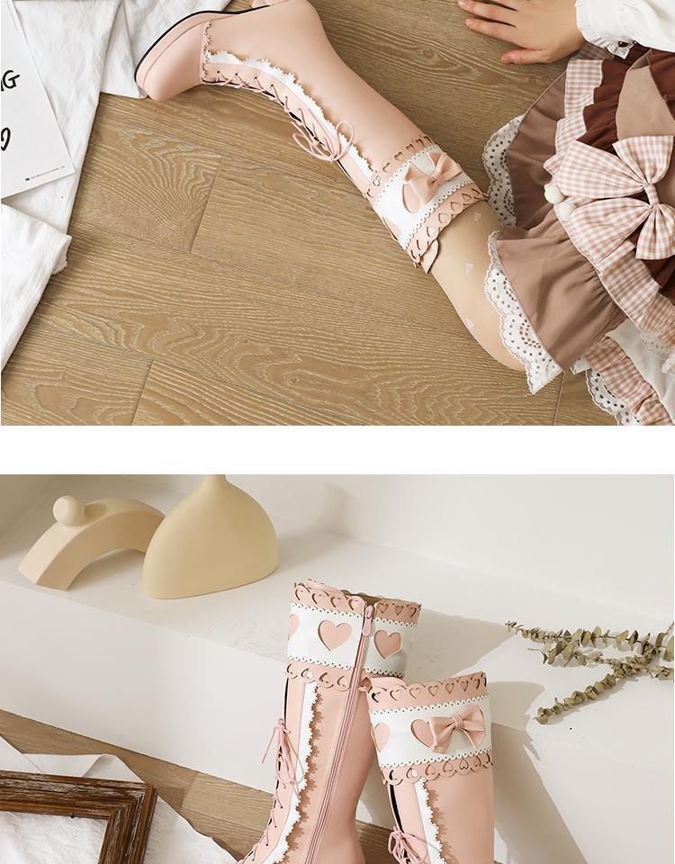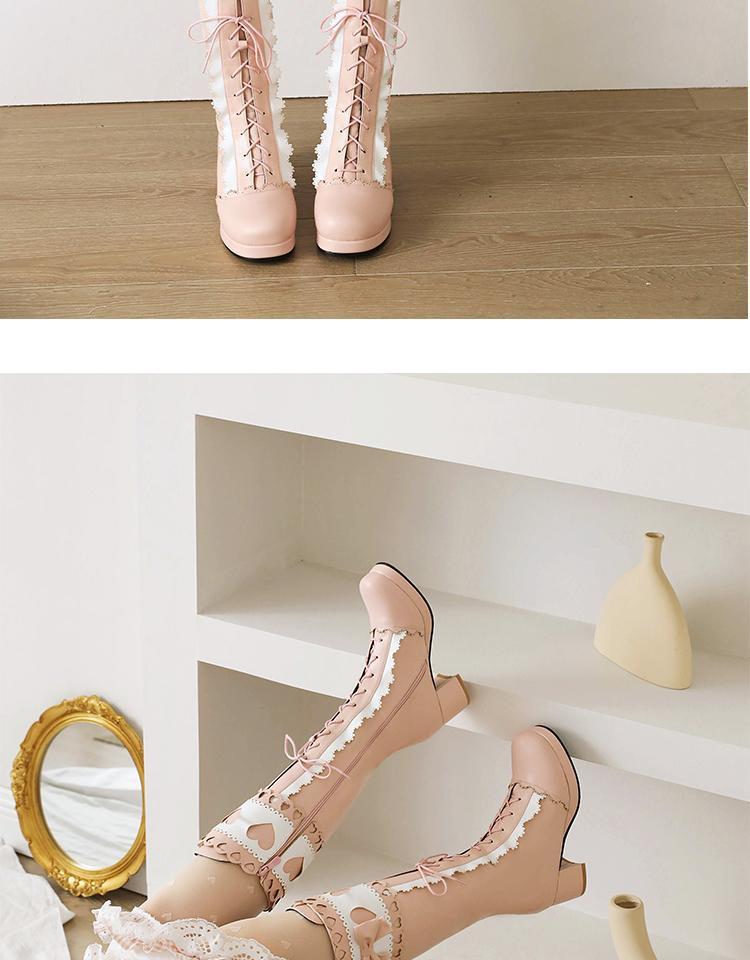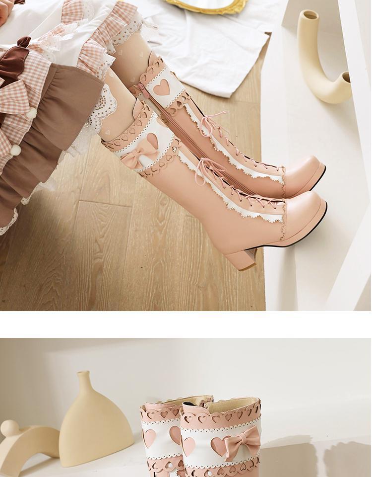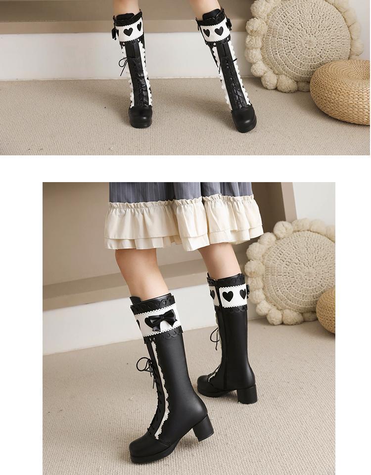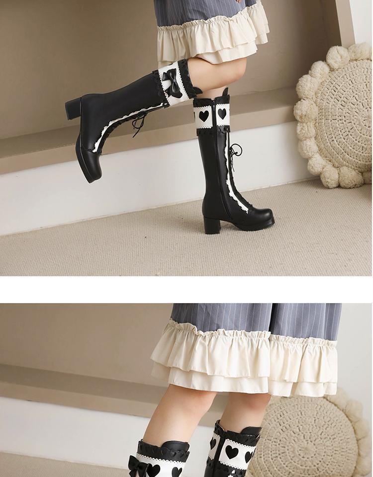 하지만 니 롱 부츠 달콤한 레이스 업 여성 부츠 라운드 토 두꺼운 미드 힐 나이트 부츠 활 로리타 하이 부츠