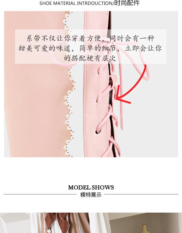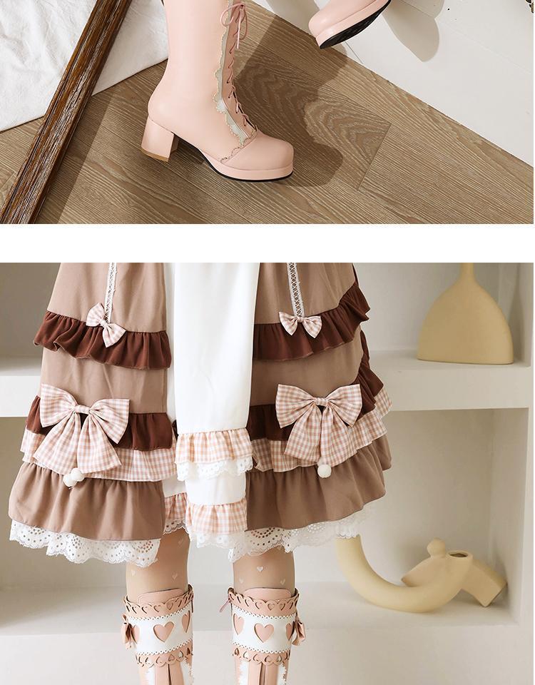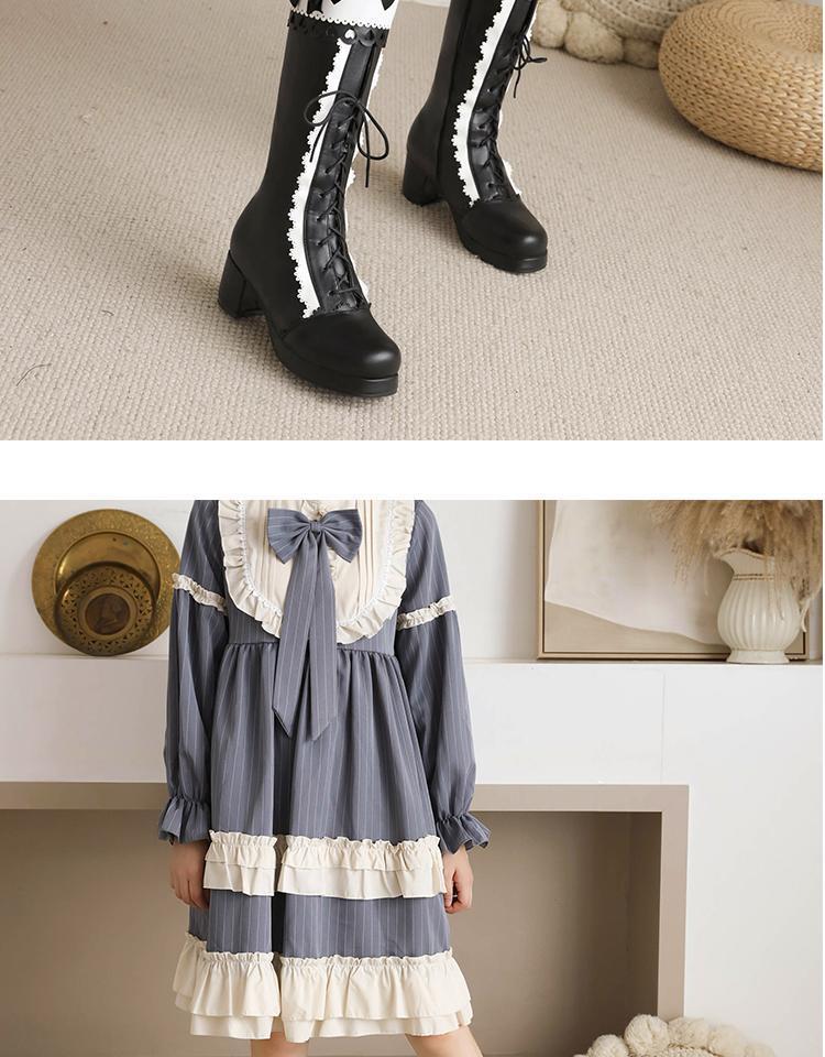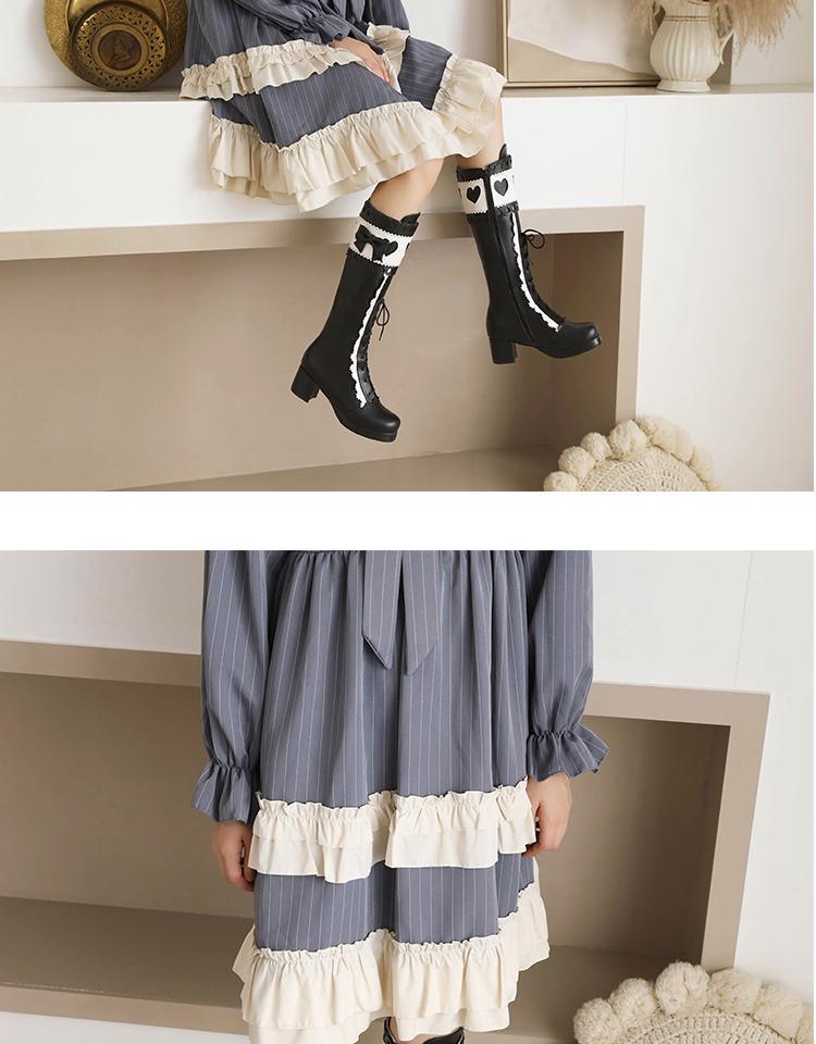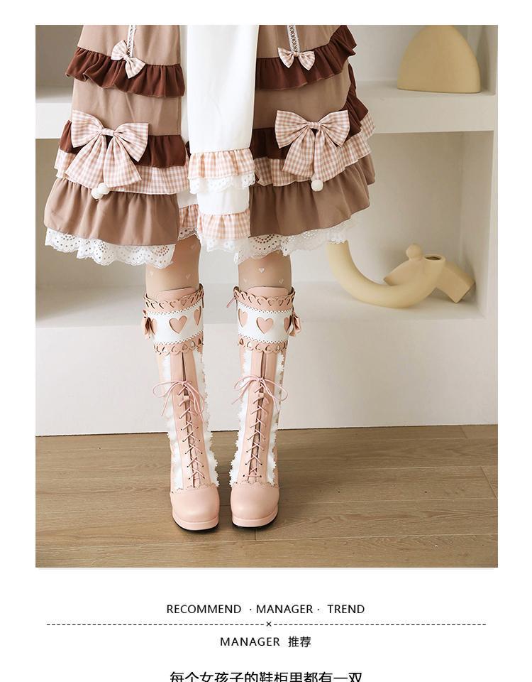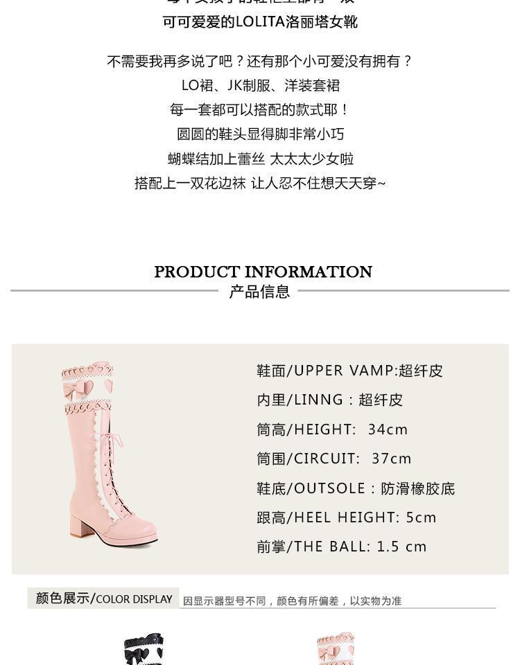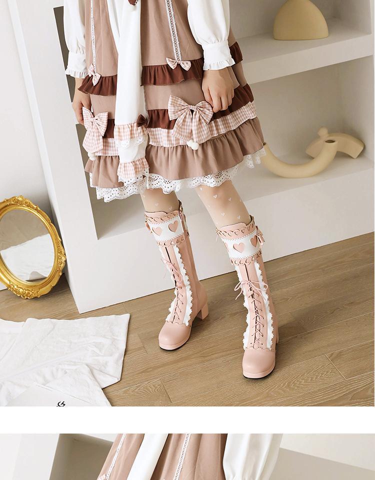 하지만 니 롱 부츠 달콤한 레이스 업 여성 부츠 라운드 토 두꺼운 미드 힐 나이트 부츠 활 로리타 하이 부츠