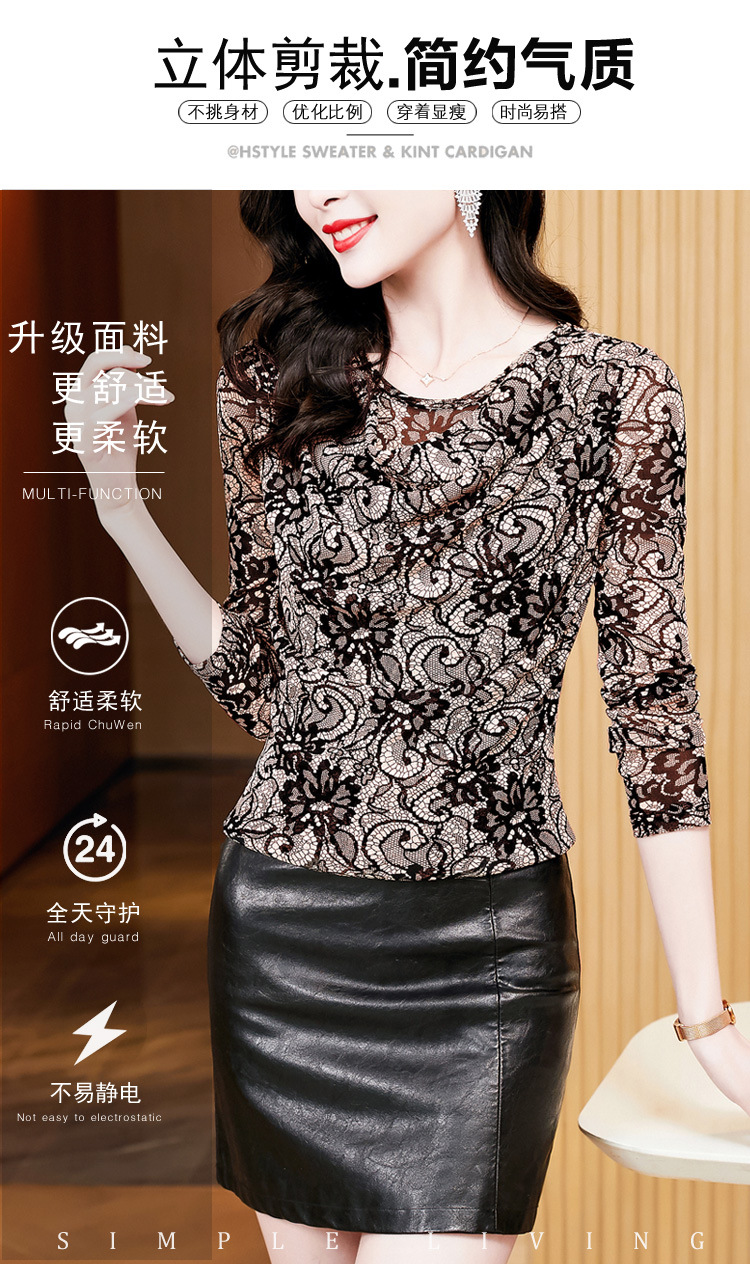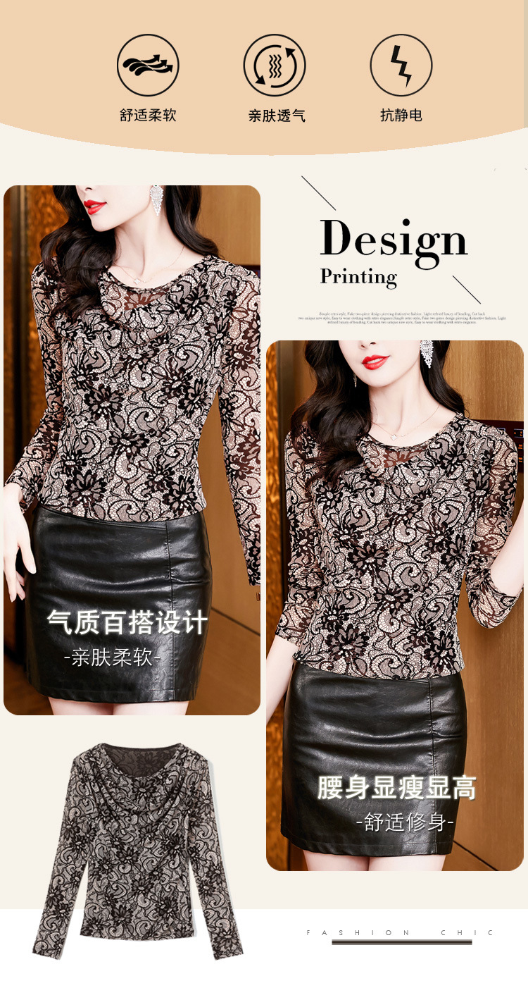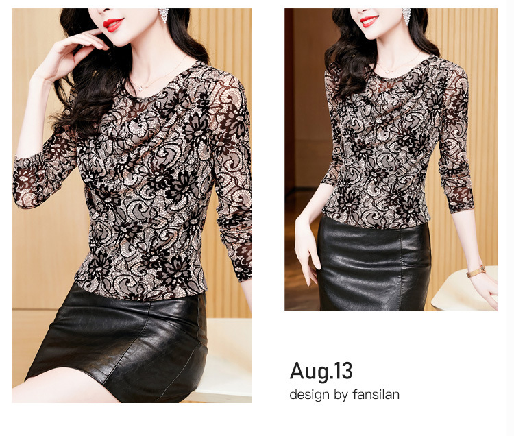 2023 가을 새로운 스타일 모든 매치 라운드 넥 긴팔 프린트 메쉬 베이스 셔츠 여성 슬림 슬림 티셔츠 도매스토어 가기