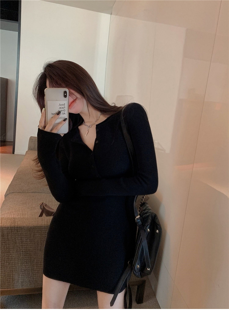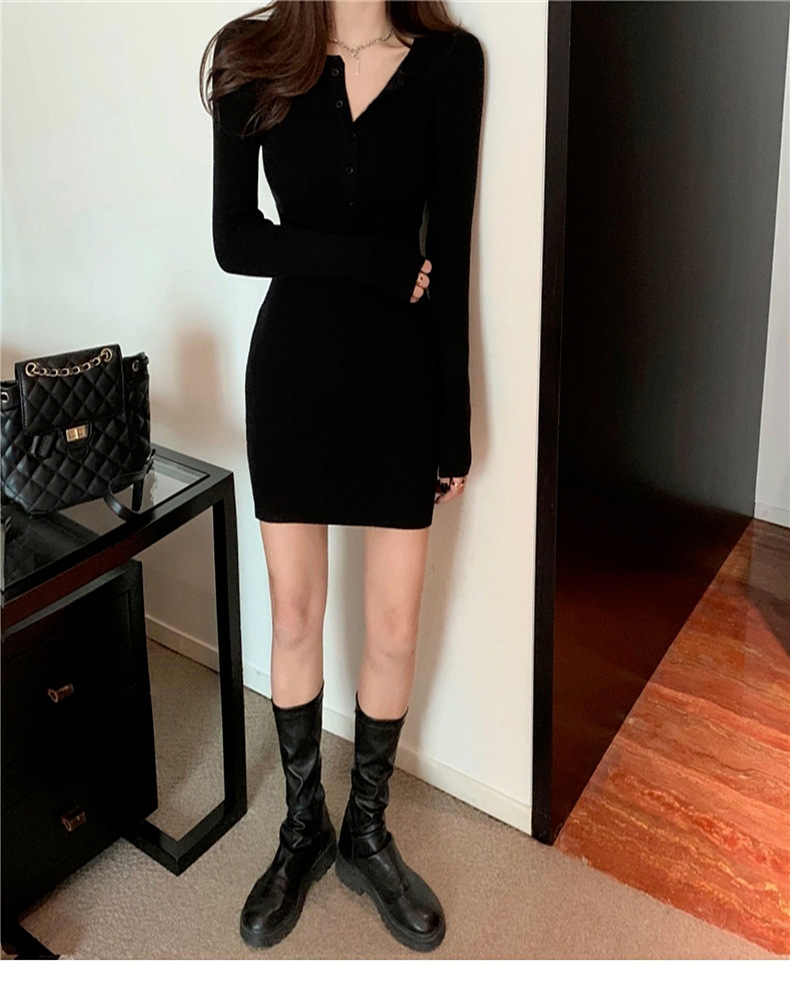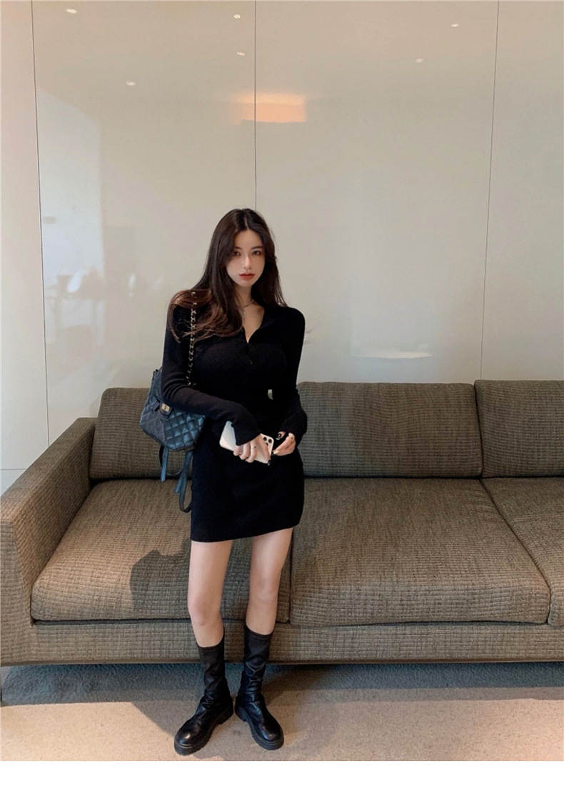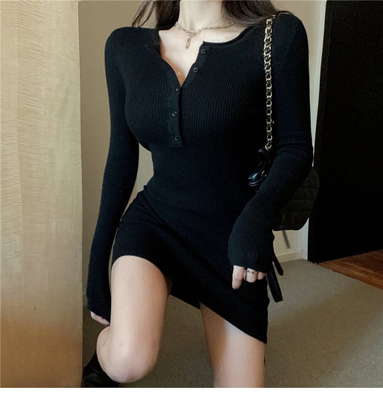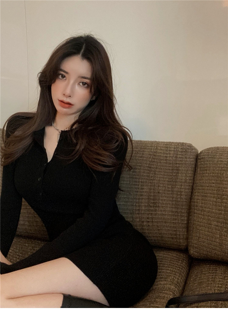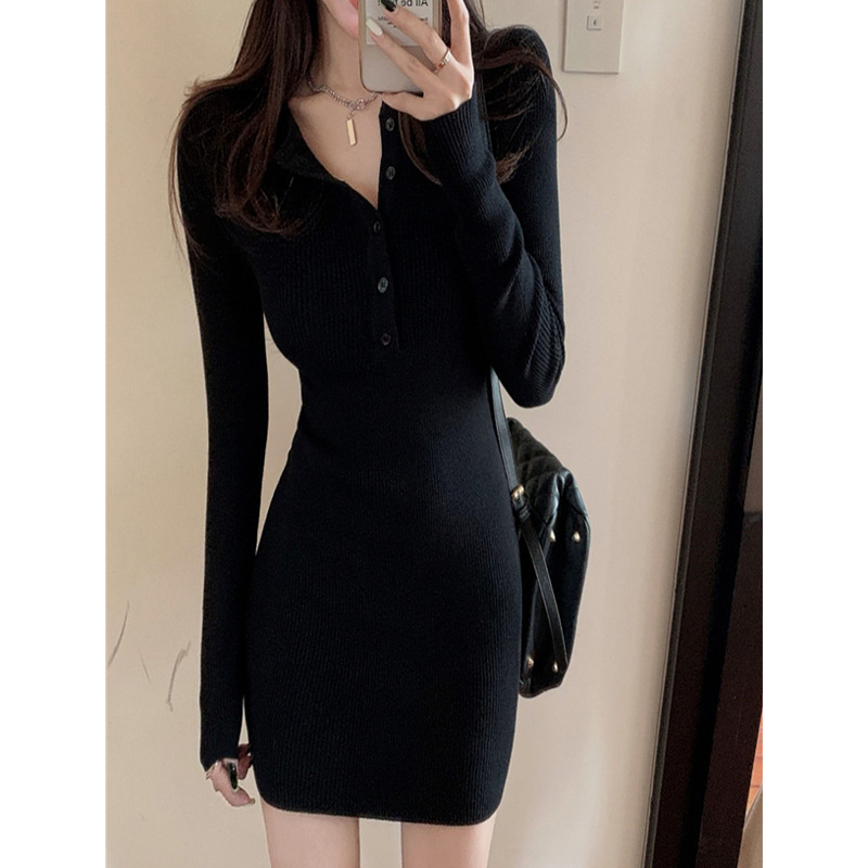 2023 새로운 블랙 긴팔 원피스 여성의 가을과 겨울 스파이스 걸스 슬림핏 슬리밍 이너베이스 엉덩이 짧은 스커트스토어 가기
