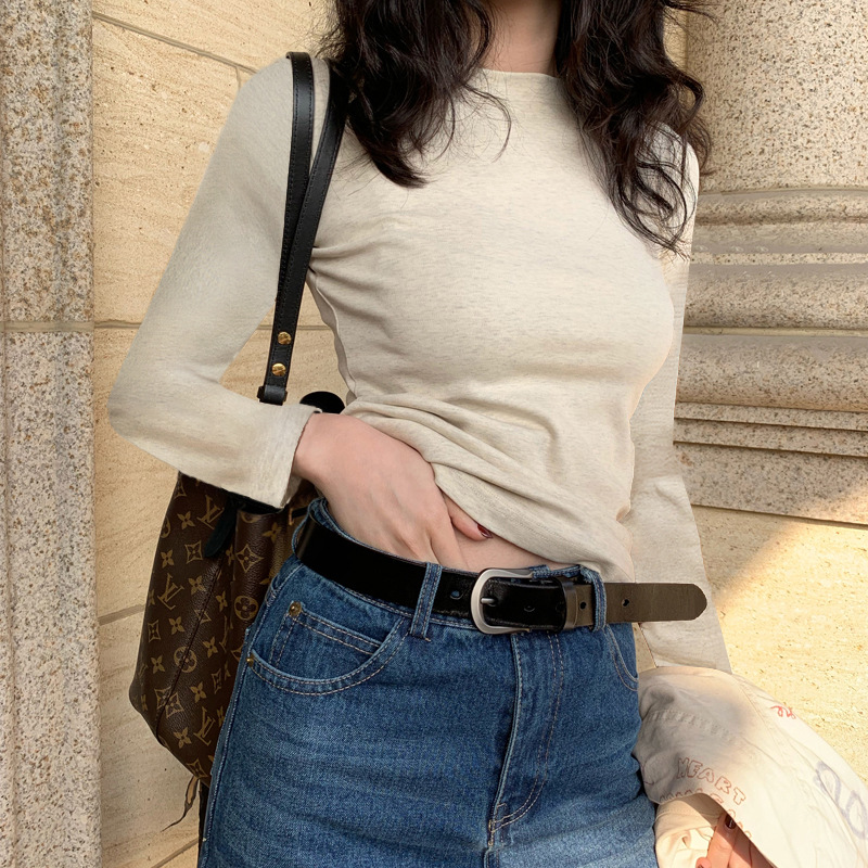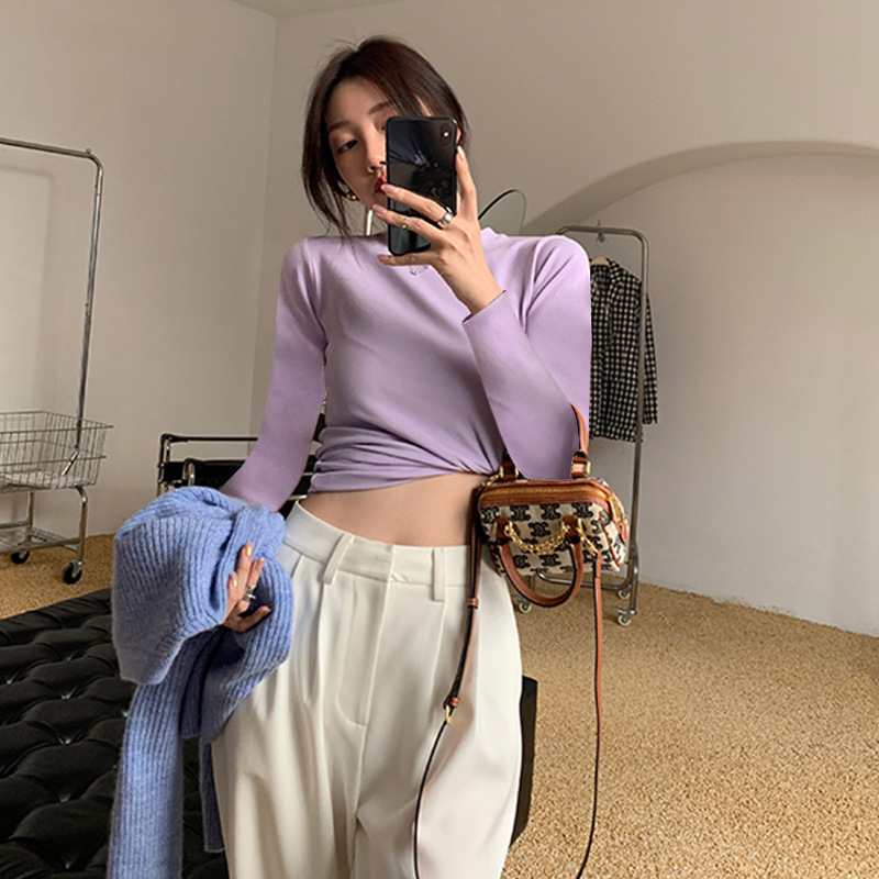 단색 심플 스타일 긴팔 티셔츠 여성용 모든 매치 탑 가을 새로운 슬림핏 슬리밍 기본 이너베이스 셔츠