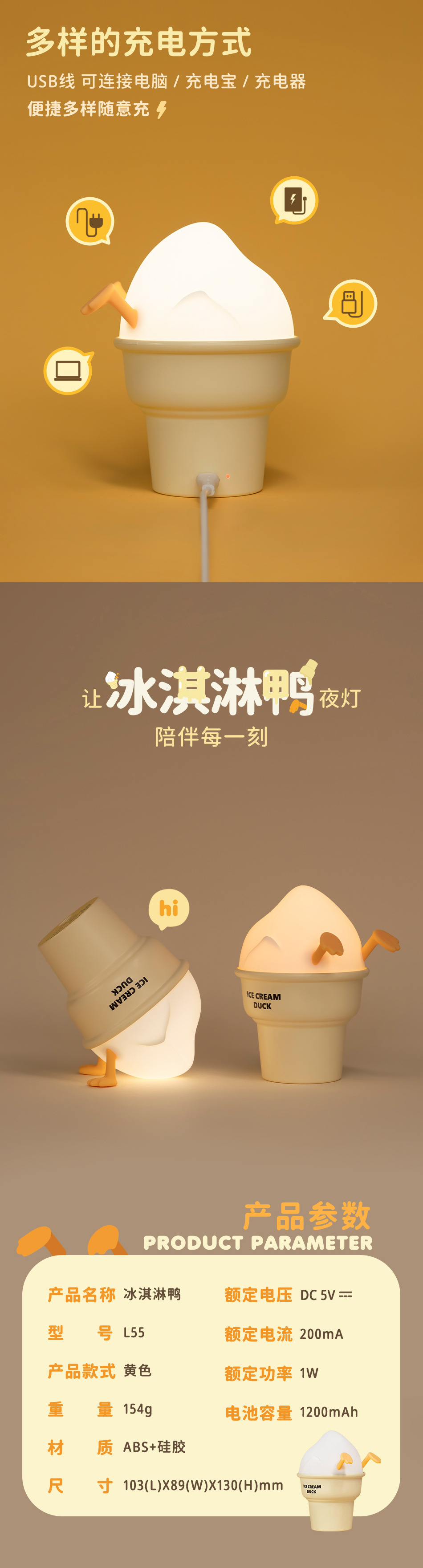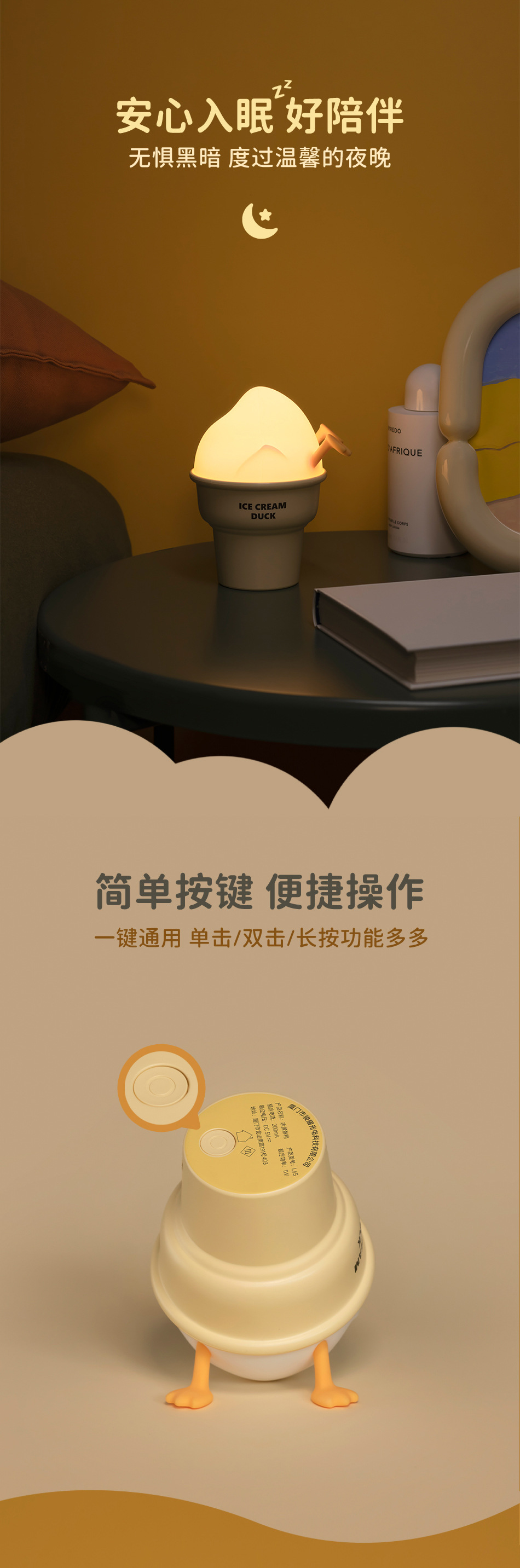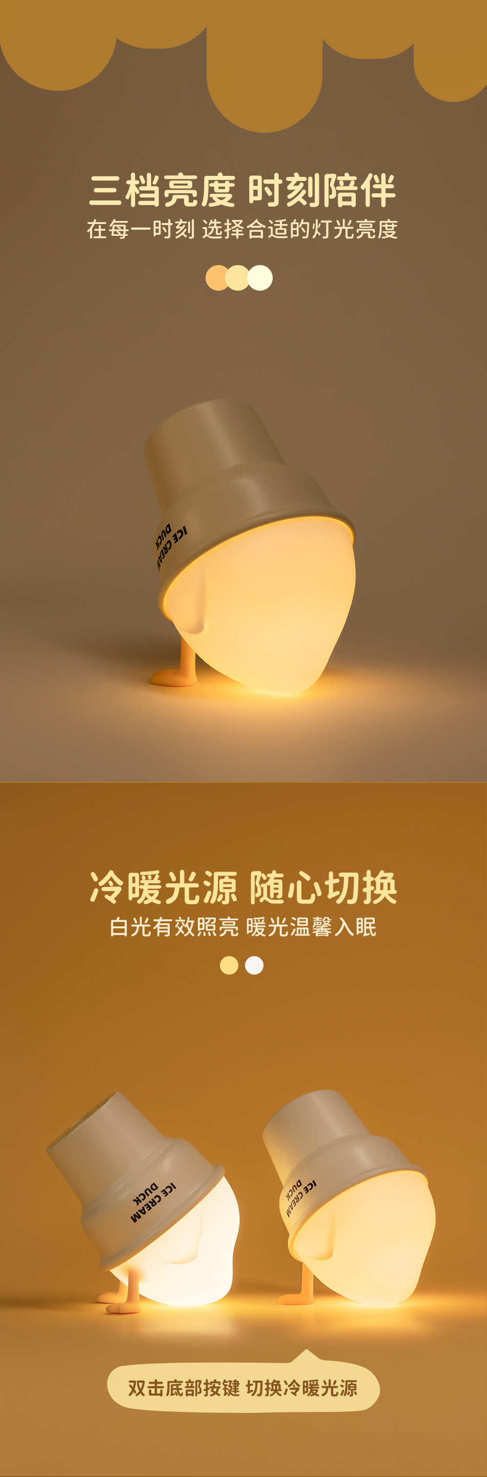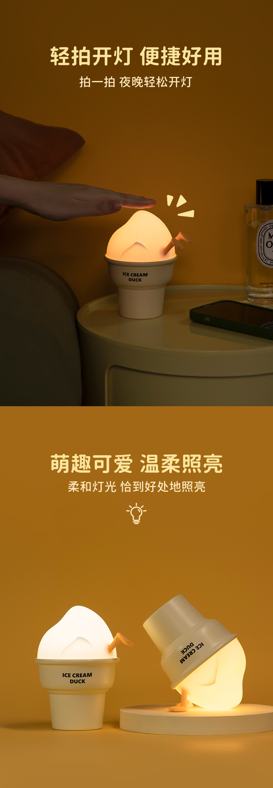 창조적 인 새로운 아이스크림 오리 박수 야간 조명 침실 침대 옆 충전 수면 박수 빛 어린이 창조적 인 야간 조명