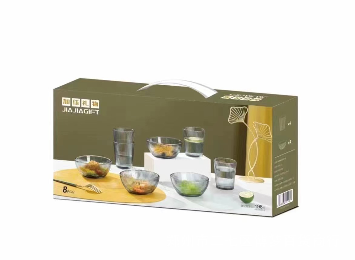 Jiajia 선물 Huanmei 8 피스 세트 세트 세로 패턴 유리 세트 가정용 물 컵 살라 그릇 식기 유리 그릇 선물