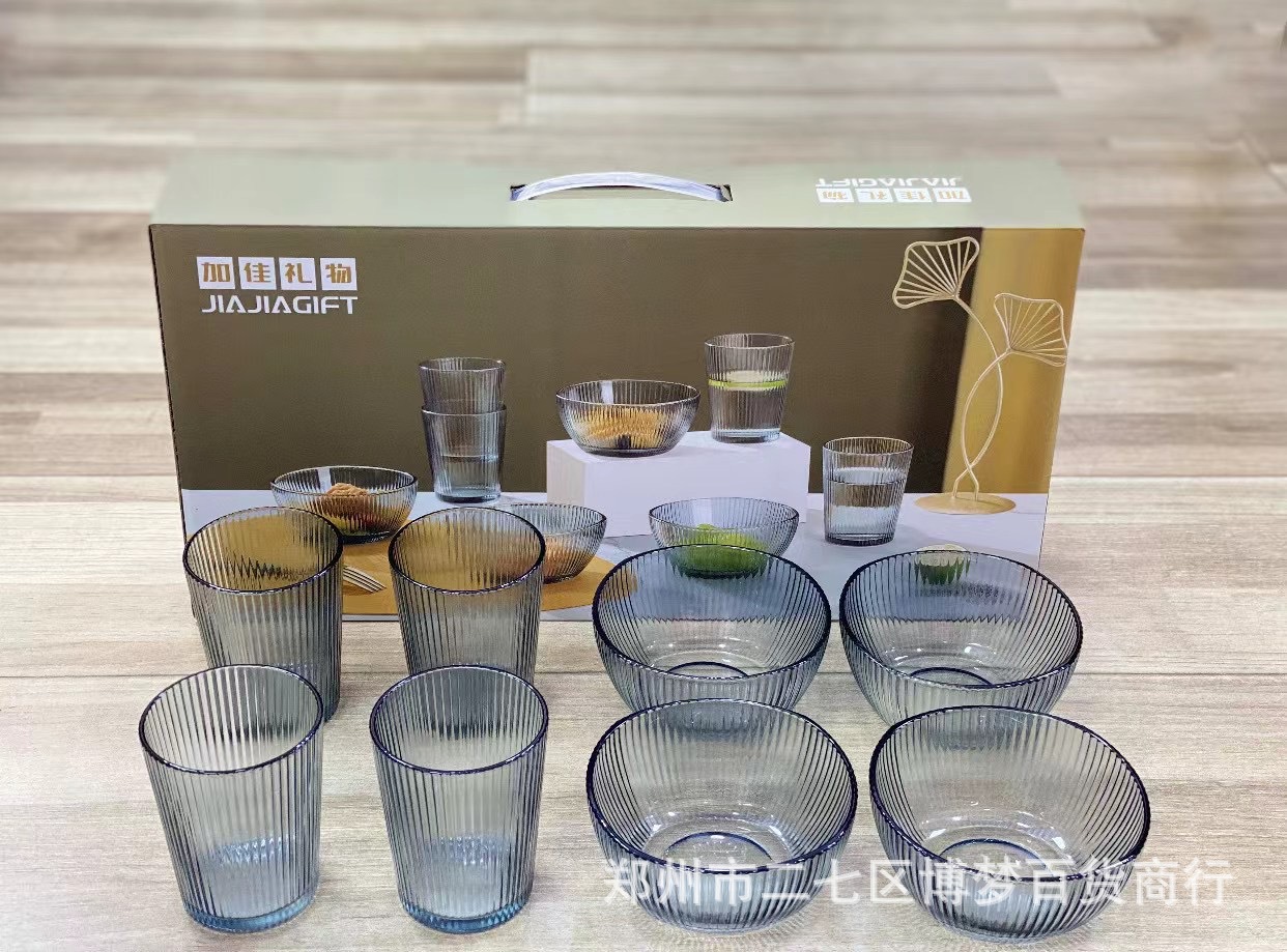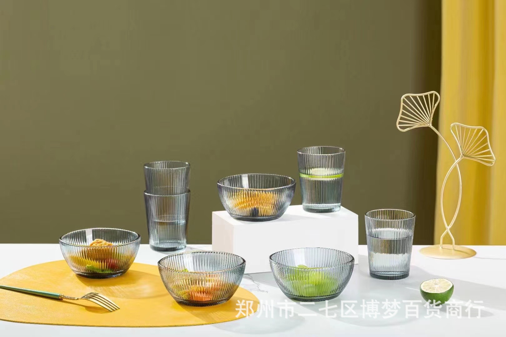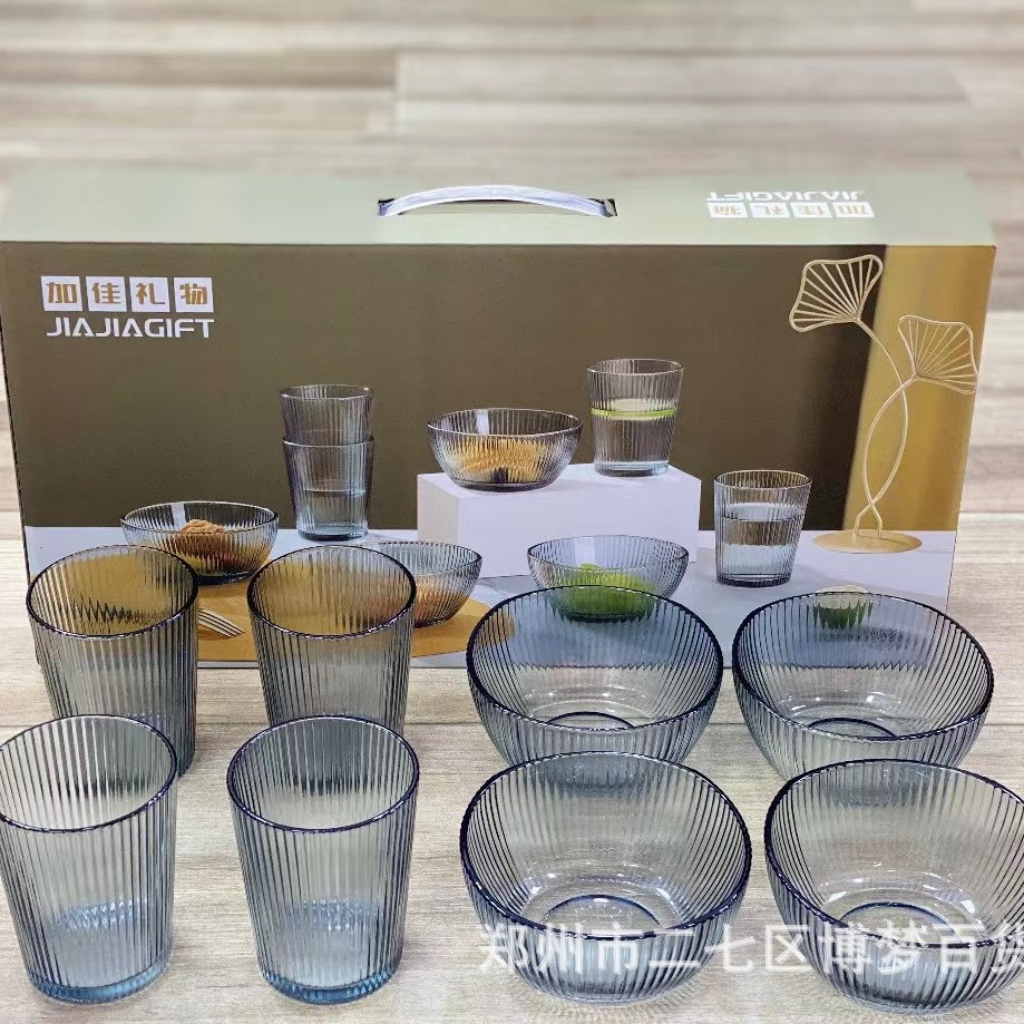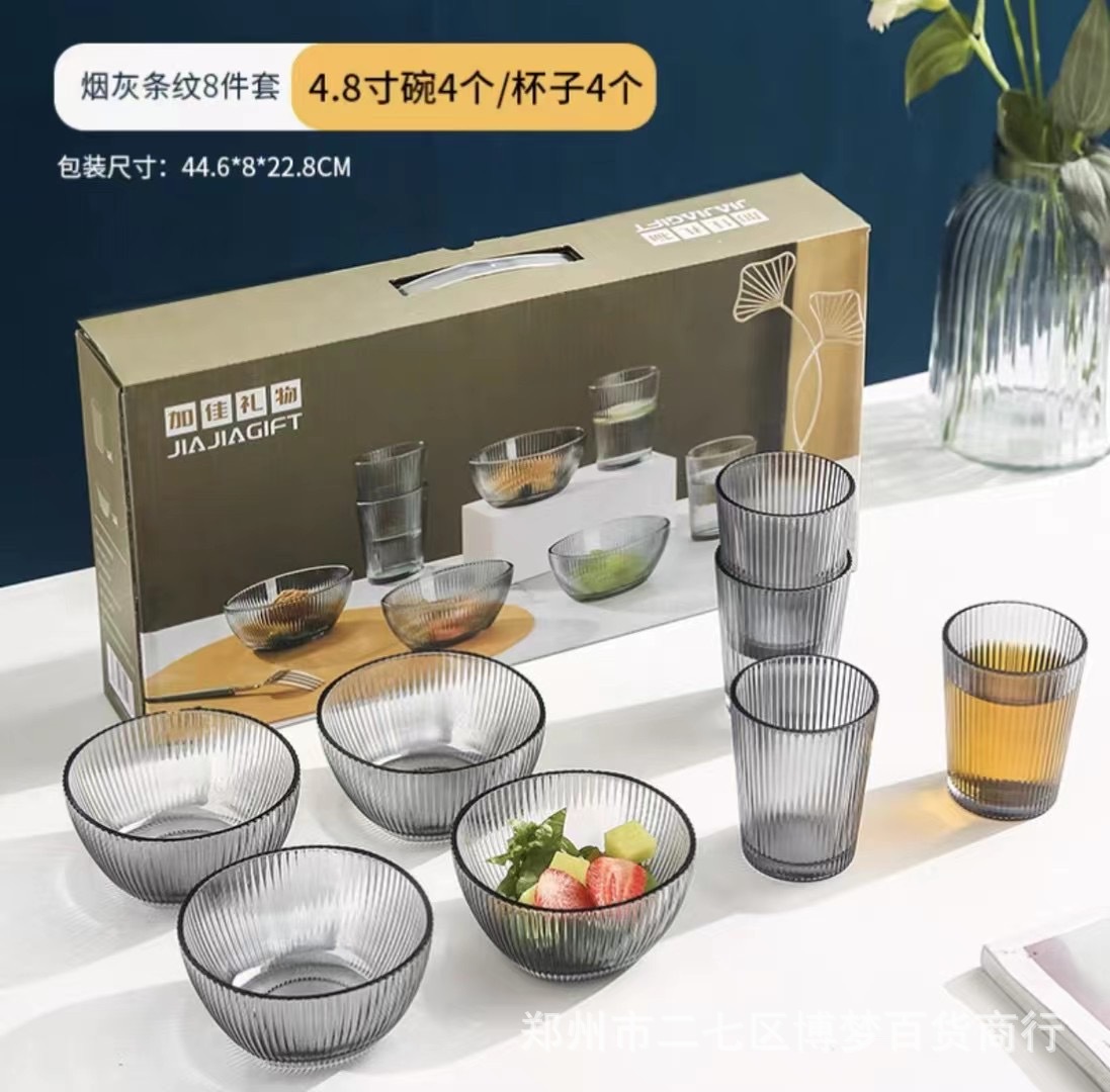 Jiajia 선물 Huanmei 8 피스 세트 세트 세로 패턴 유리 세트 가정용 물 컵 살라 그릇 식기 유리 그릇 선물스토어 가기