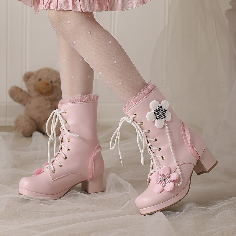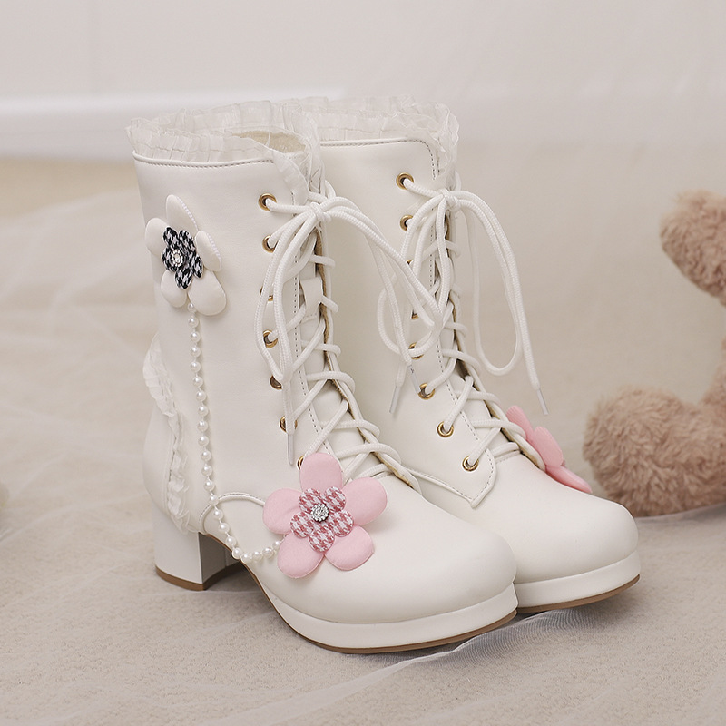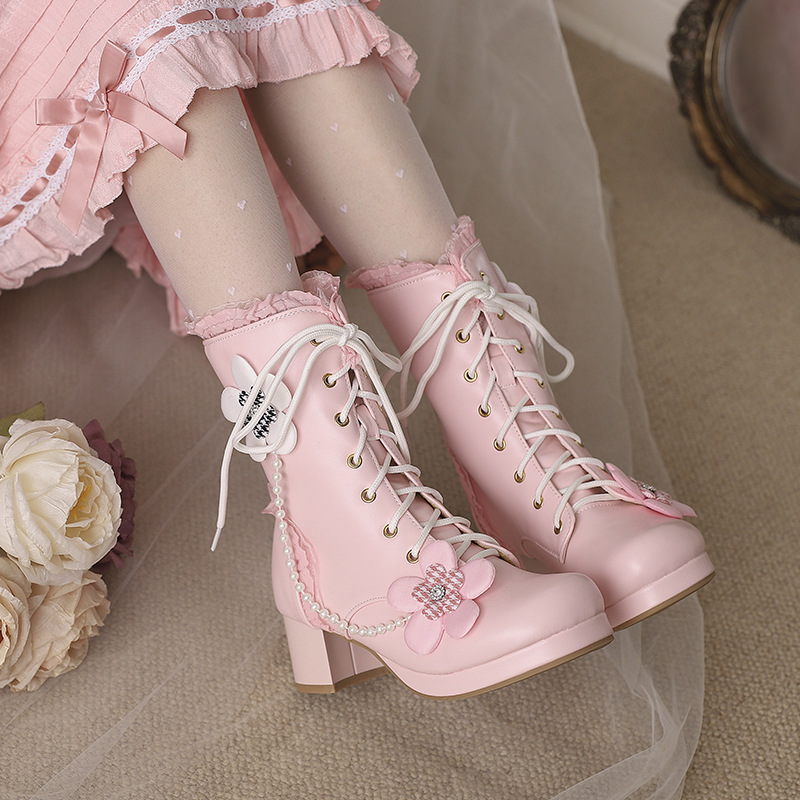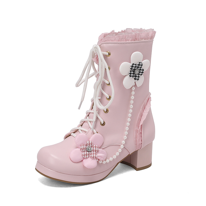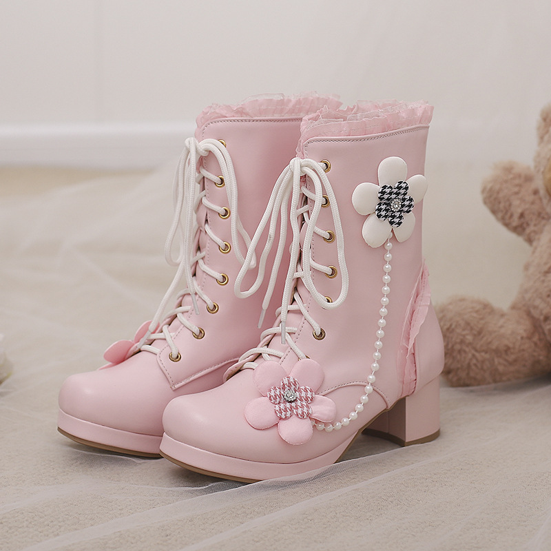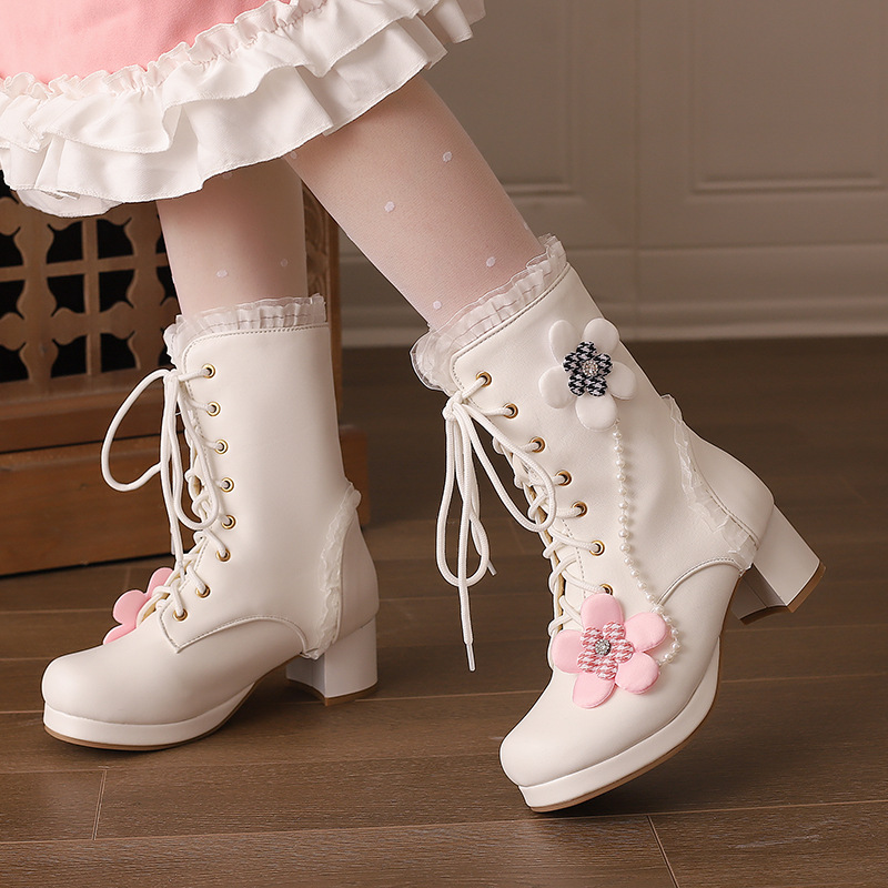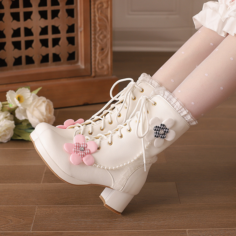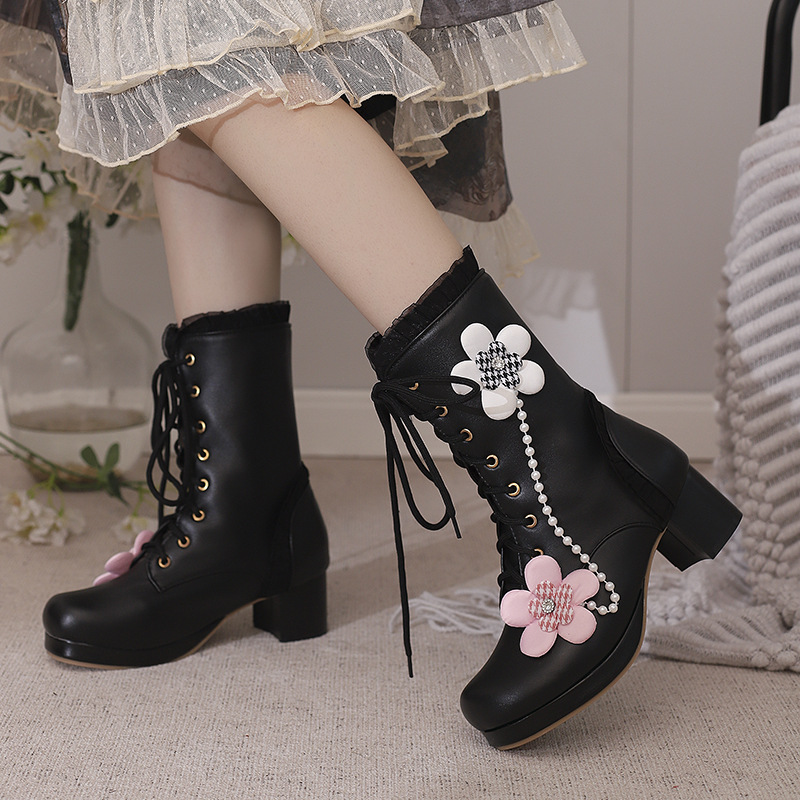 달콤한 꽃 레이스 가장자리 캔디 신발 공주 가죽 부츠 페르시 레이스 업 마틴 부츠 앵클 부츠 두꺼운 미드 힐 해외 무역 부츠스토어 가기